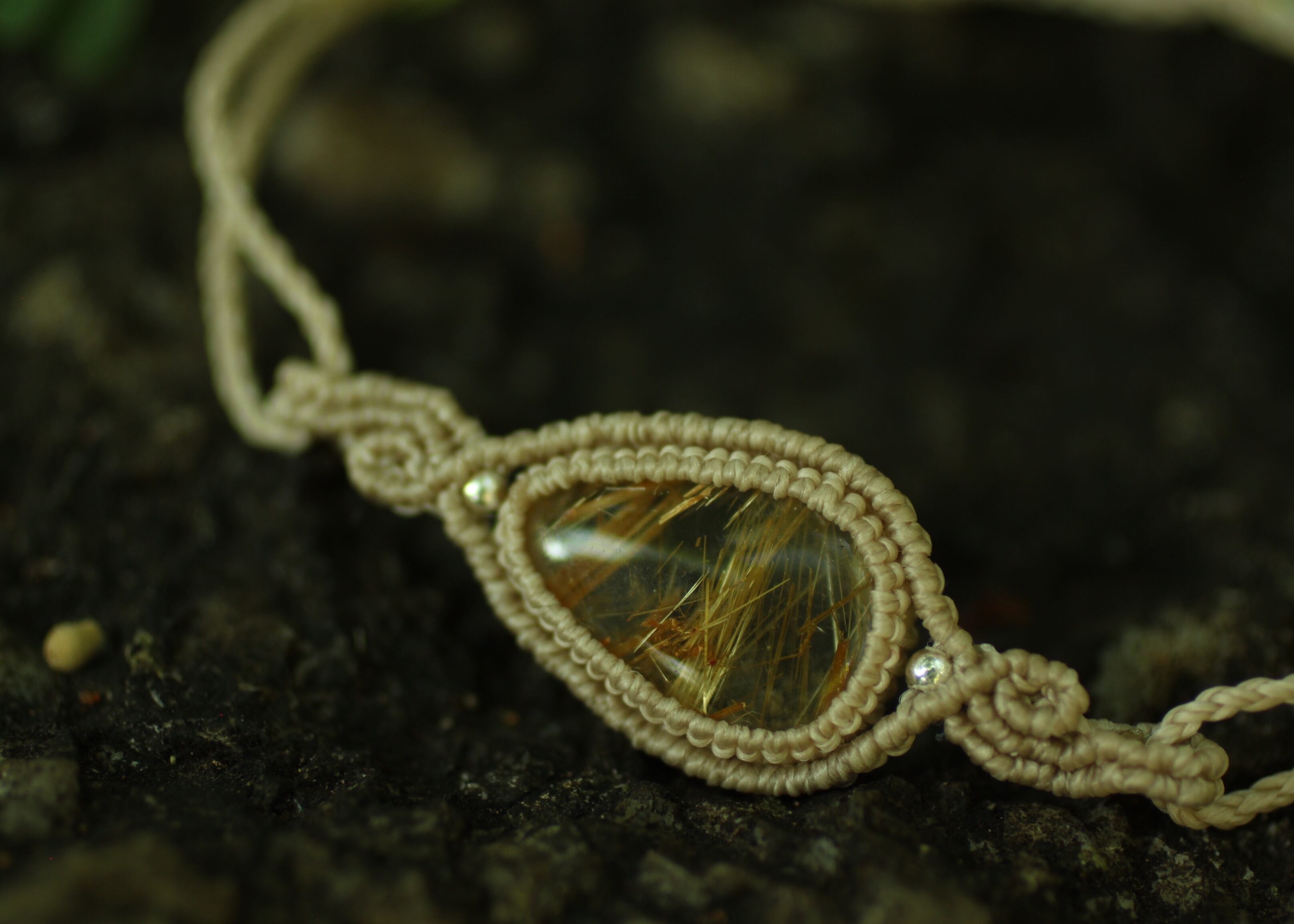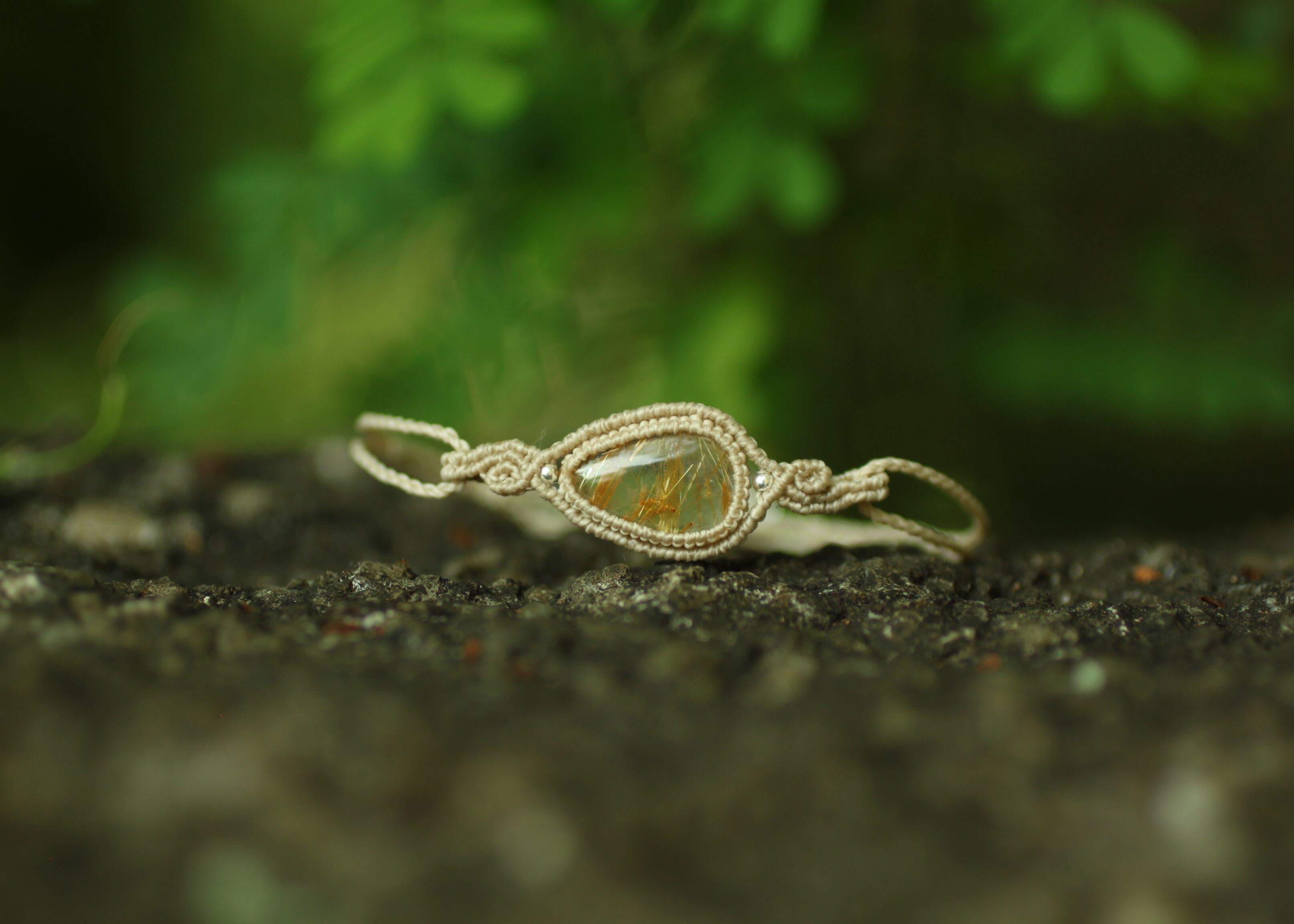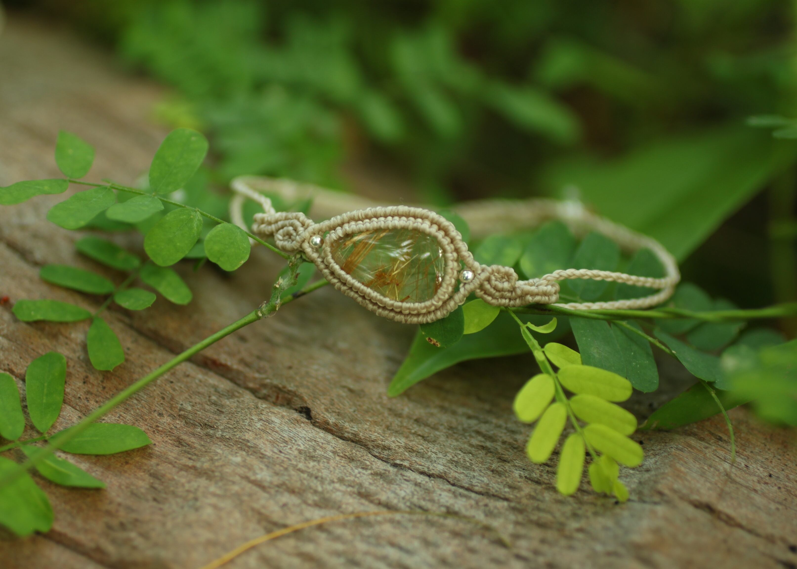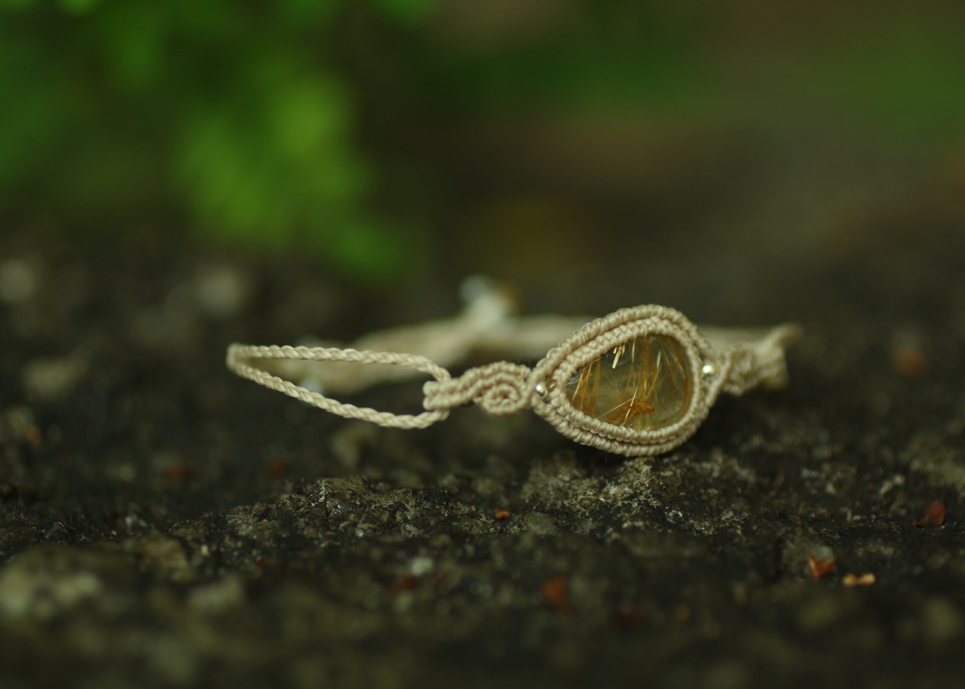 ※ ルチルクオーツを包むマクラメ編みのコードは、手縫い糸ほどの細いコードを使い出来る限り天然石の表情を引き立たせる事を重視し時間をかけ丁寧に包みました。