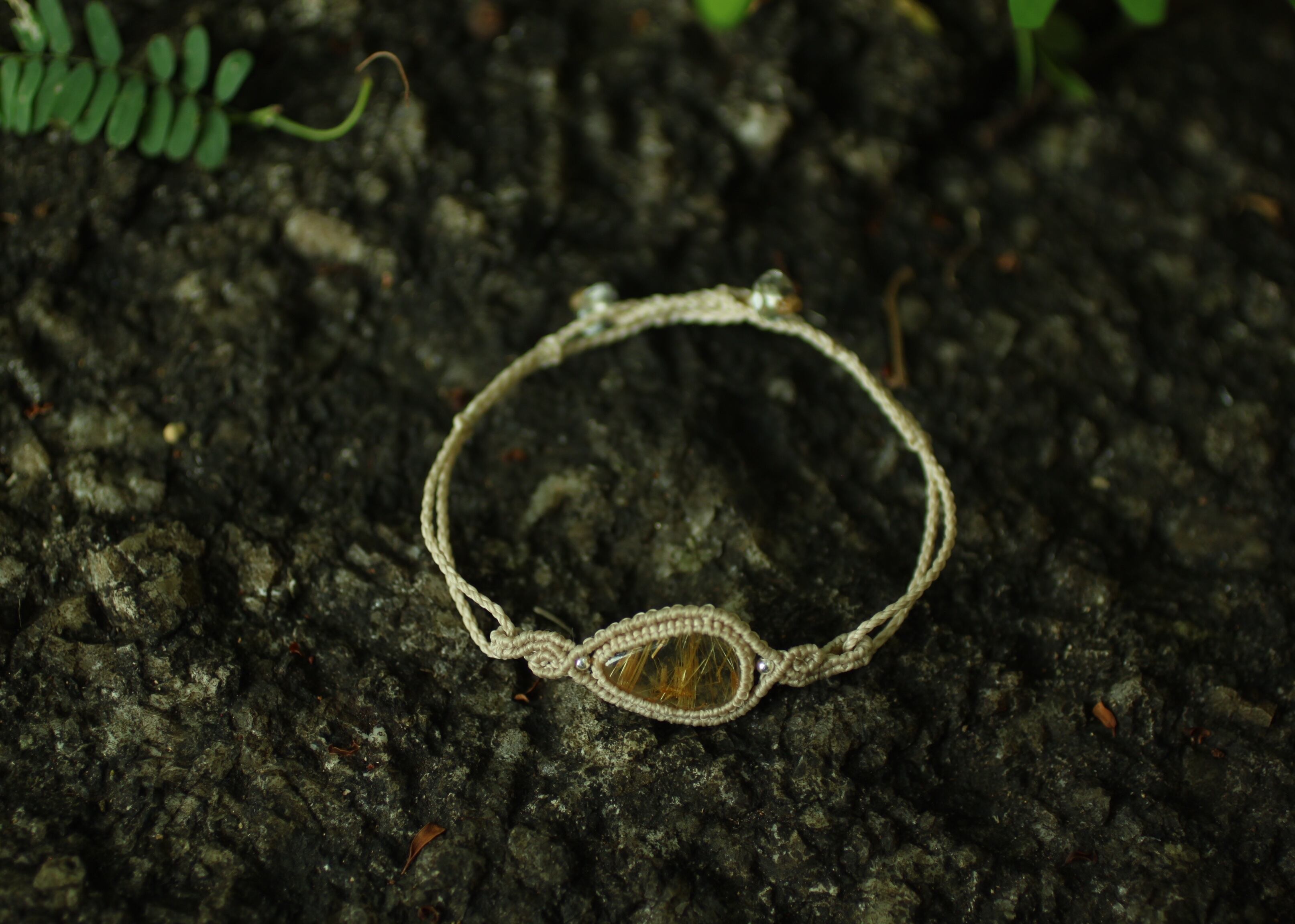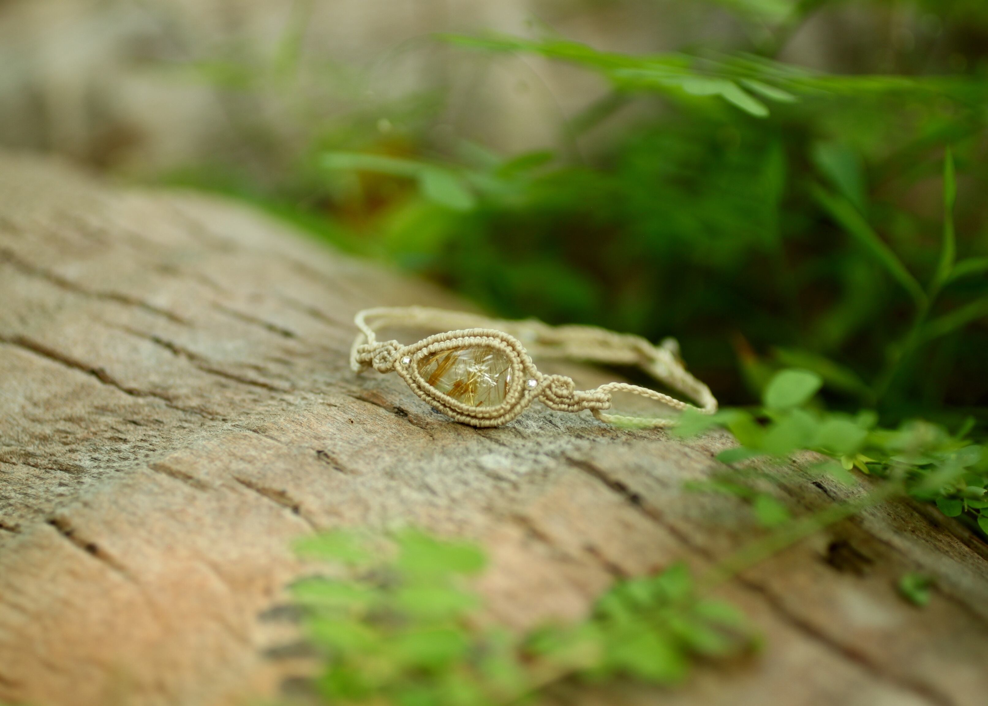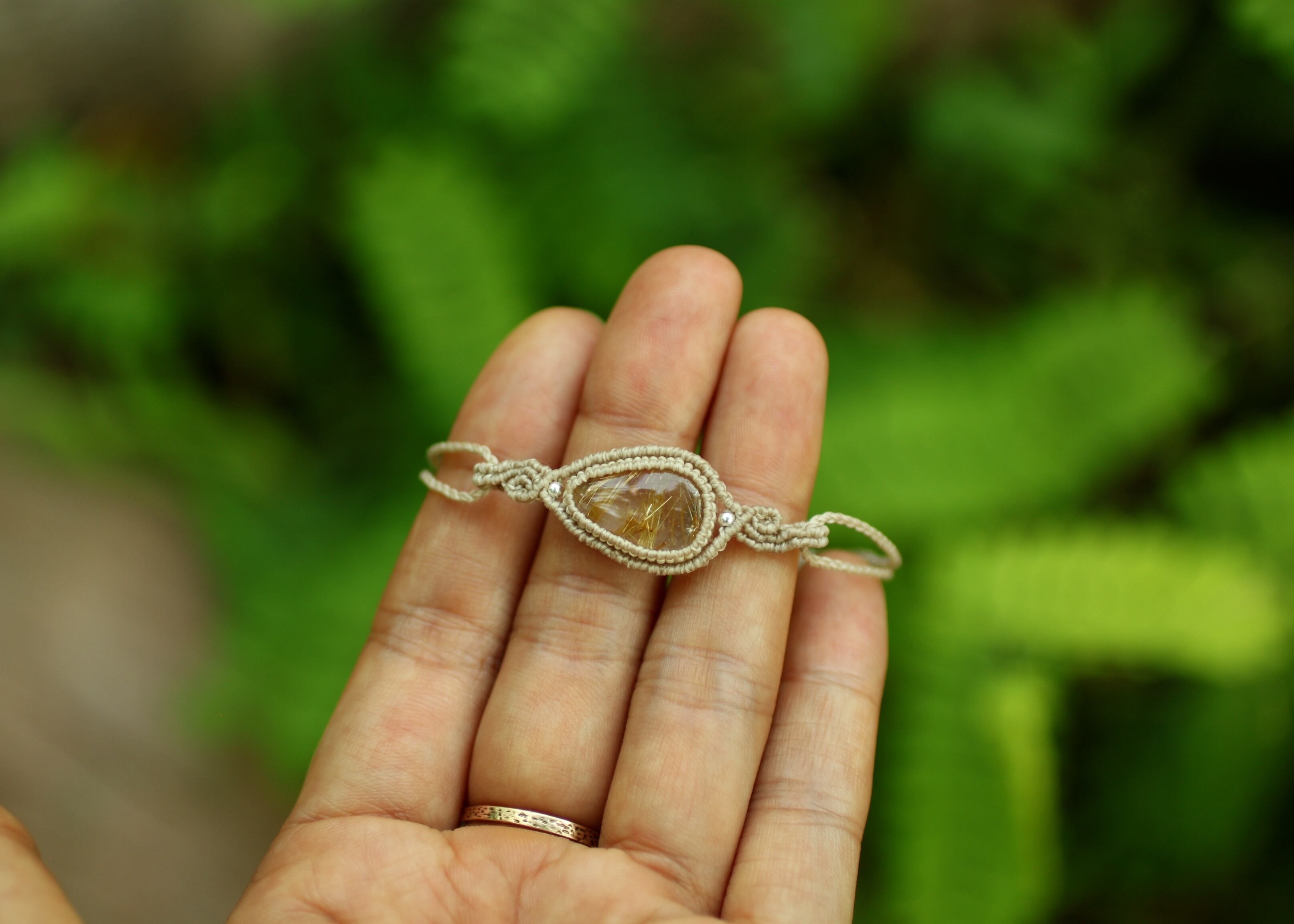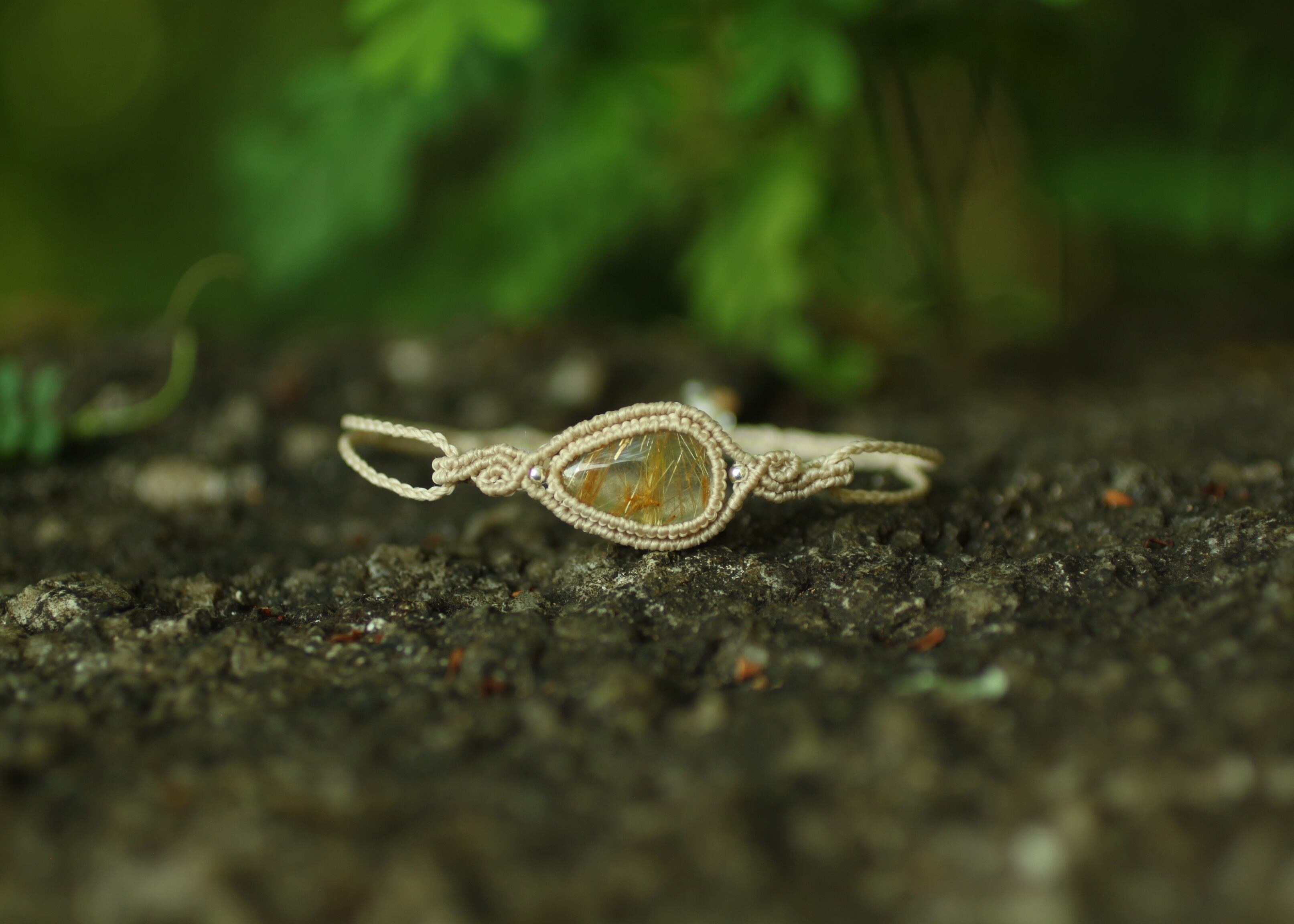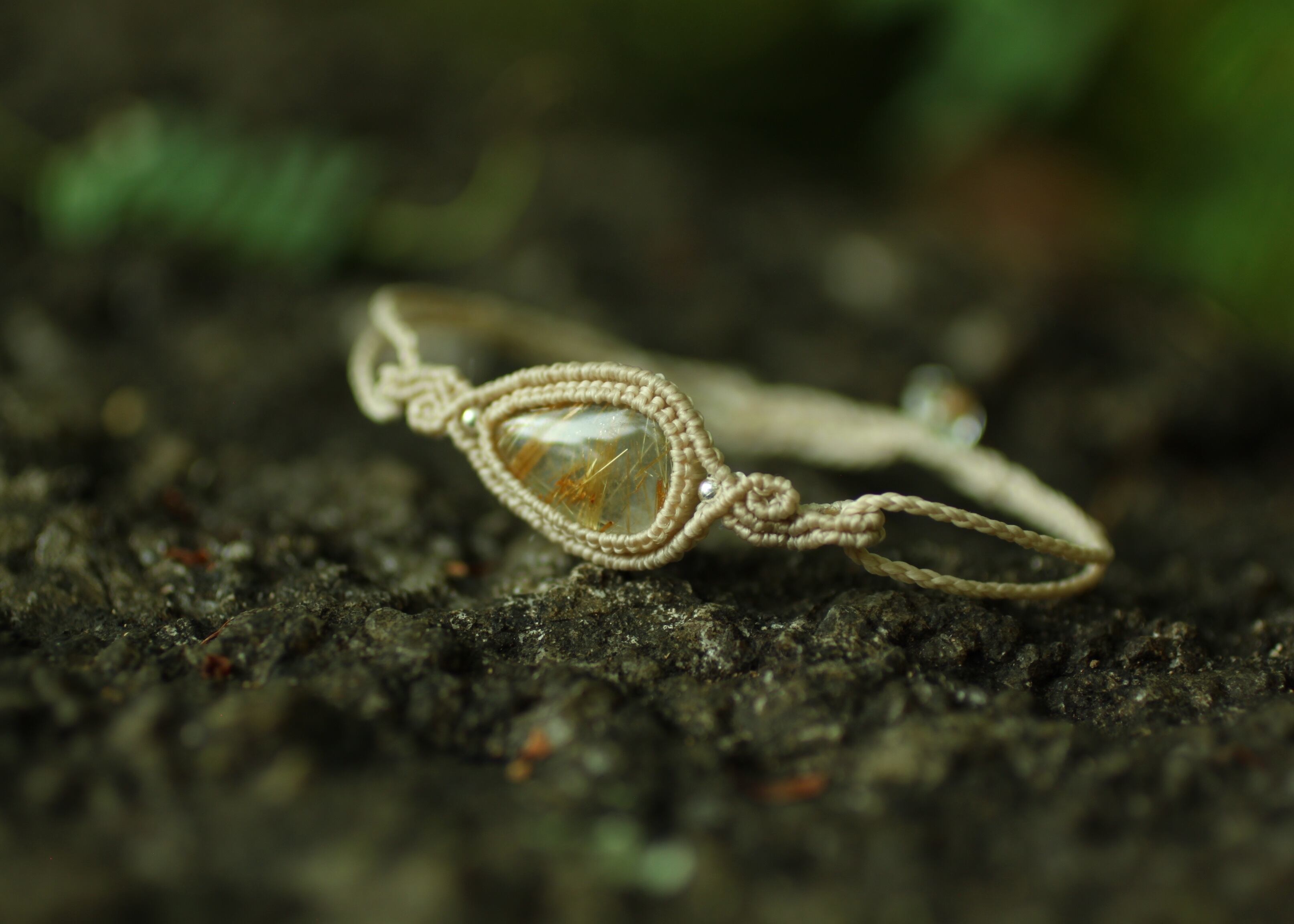 ※ ルチルクオーツを包むマクラメ編みのコードは、手縫い糸ほどの細いコードを使い出来る限り天然石の表情を引き立たせる事を重視し時間をかけ丁寧に包みました。