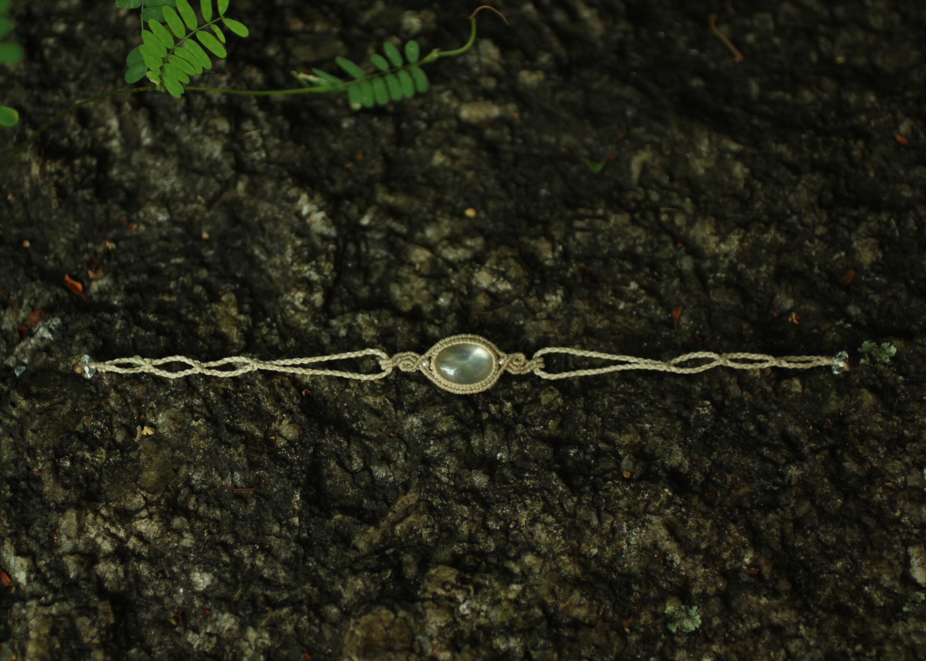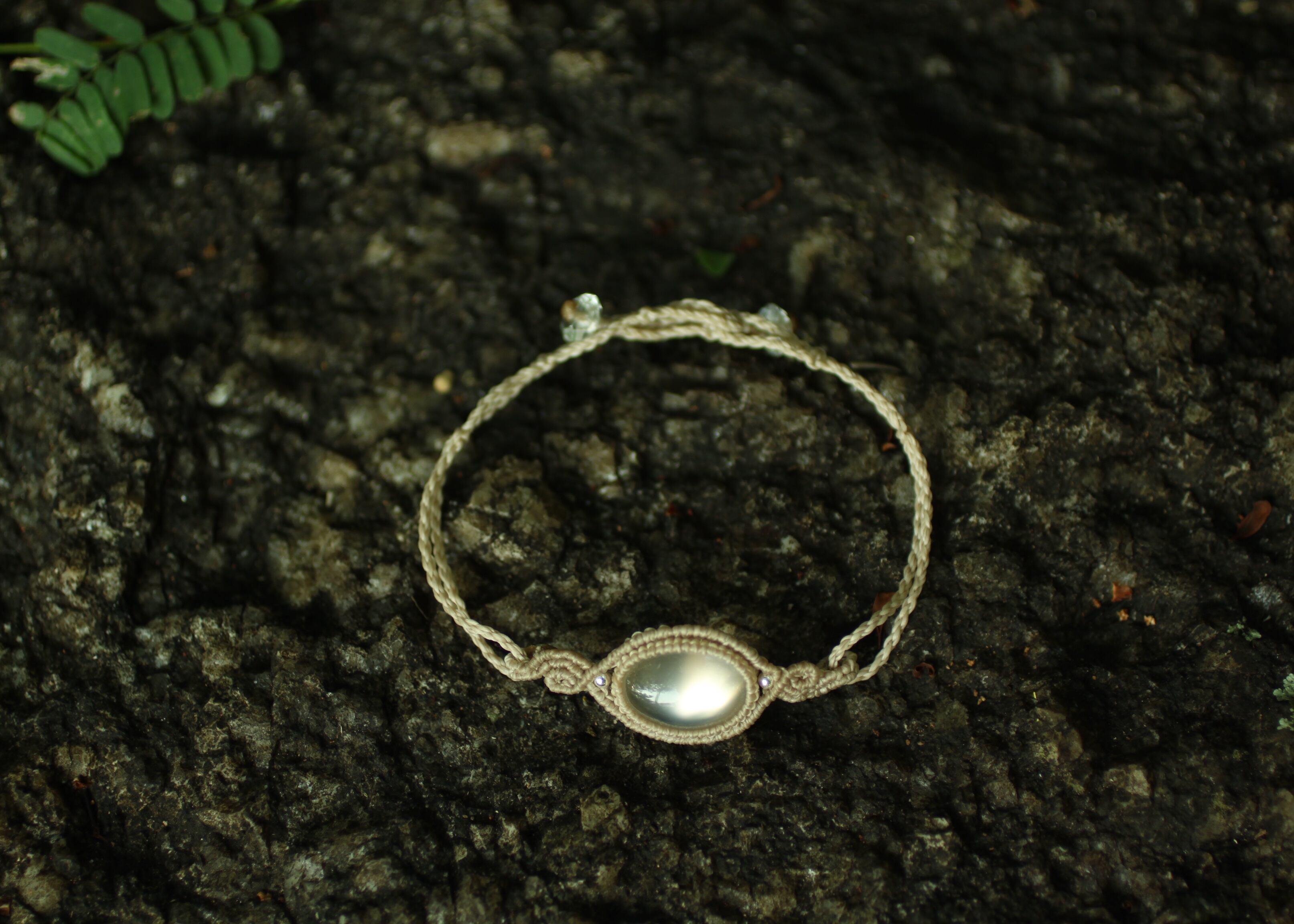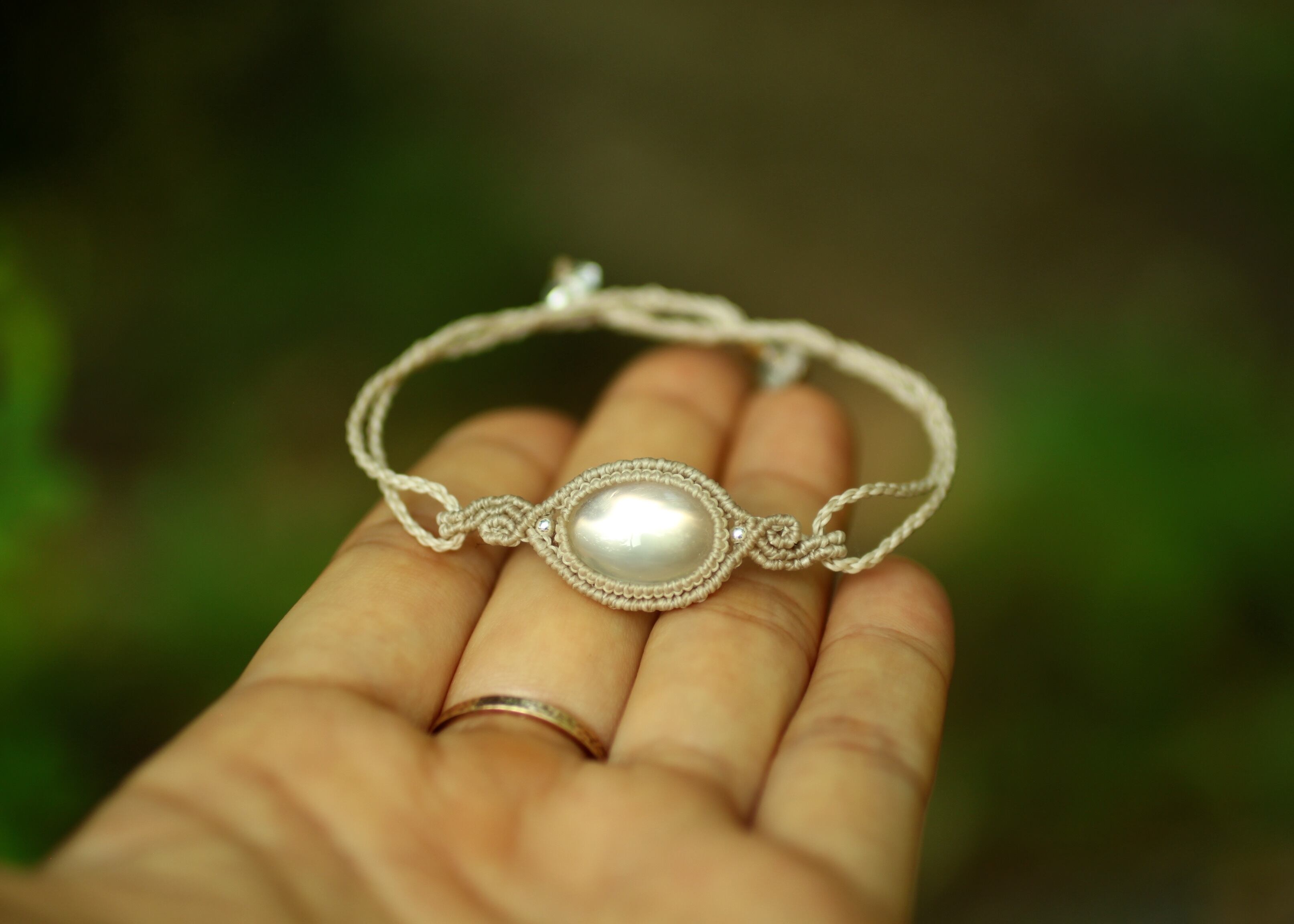 ムーンストーン が腕に置き飾られている様なブレスレットをイメージし作りました。