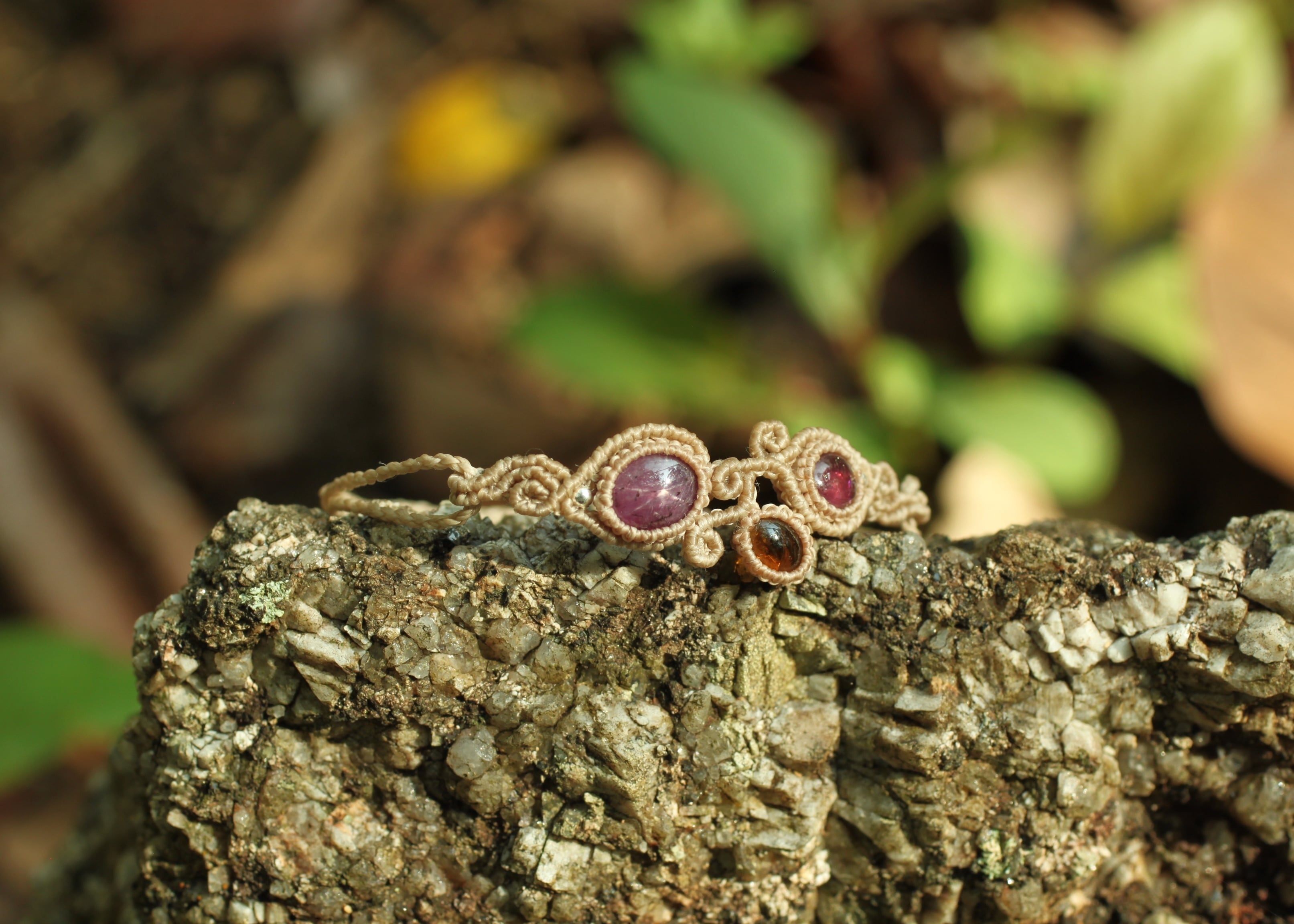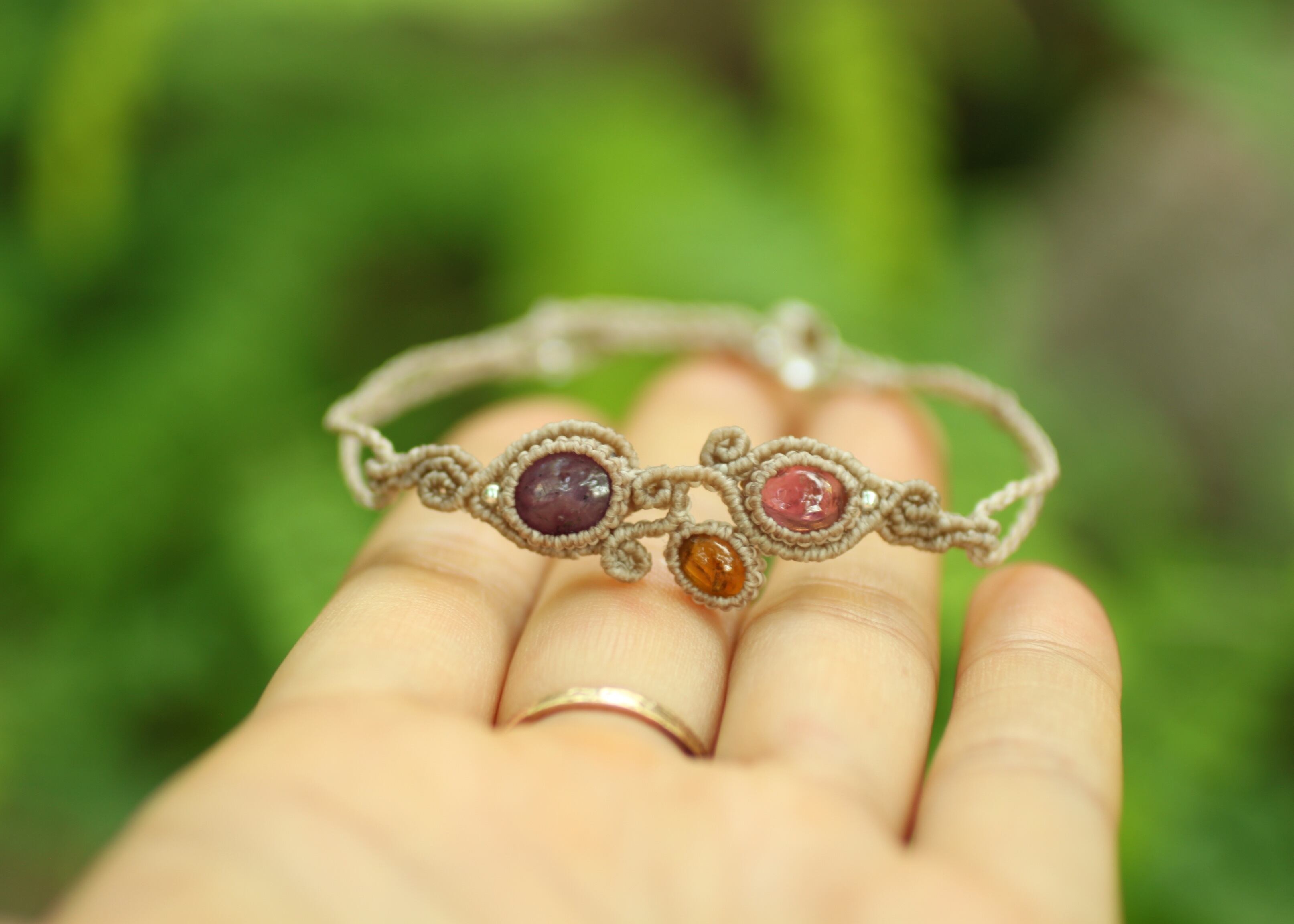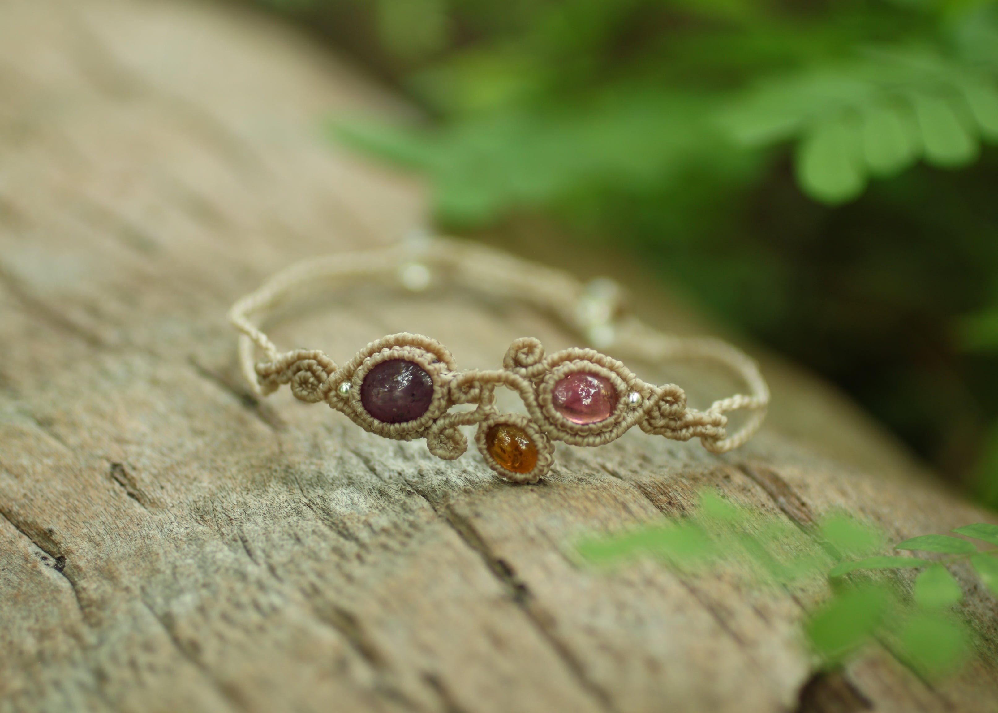 同系色の3つの石を合わせ、繋ぎ合せたブレスレット。