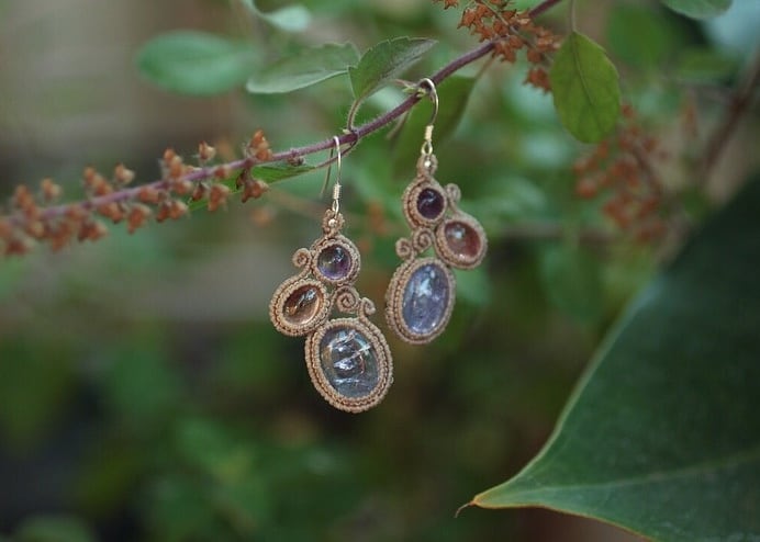 ※ こちらのピアスに使用したマクラメ編みコードは、手縫い糸ほどの細いコードを使い出来る限り天然石の表情と繊細な雰囲気を引き立たせる事を重視し時間をかけ丁寧に仕上げていきました。