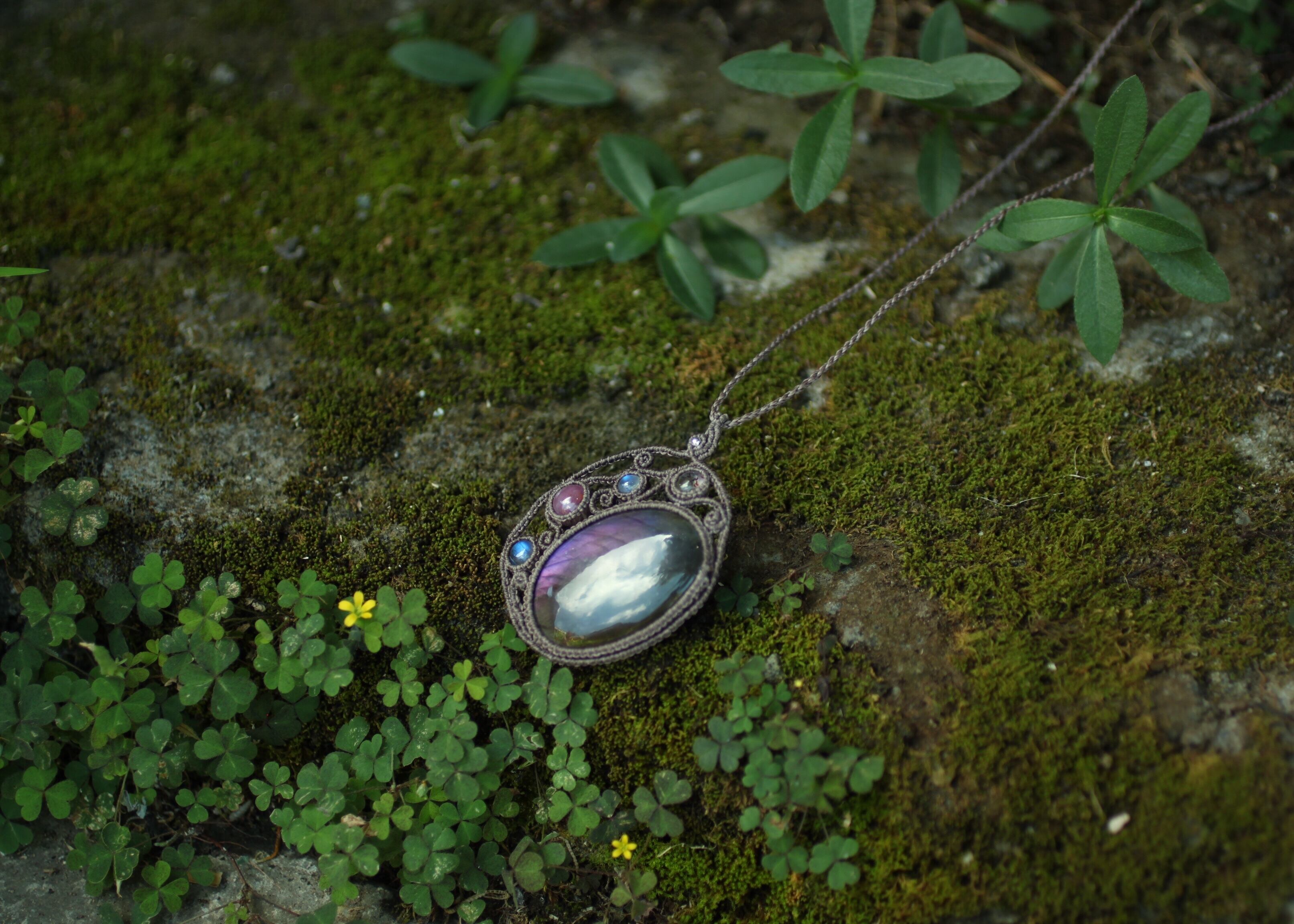 でも角度を変えると紫のシラーがグレーになる為、ルビー、ムーンストーンなどでどこから見ても楽しめるペンダントトップへと仕上げました。
