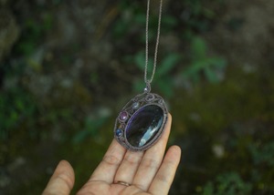 一つの輪の中に複数の天然石をおさめ、宇宙をイメージさせられるペンダントトップへと仕上げました。