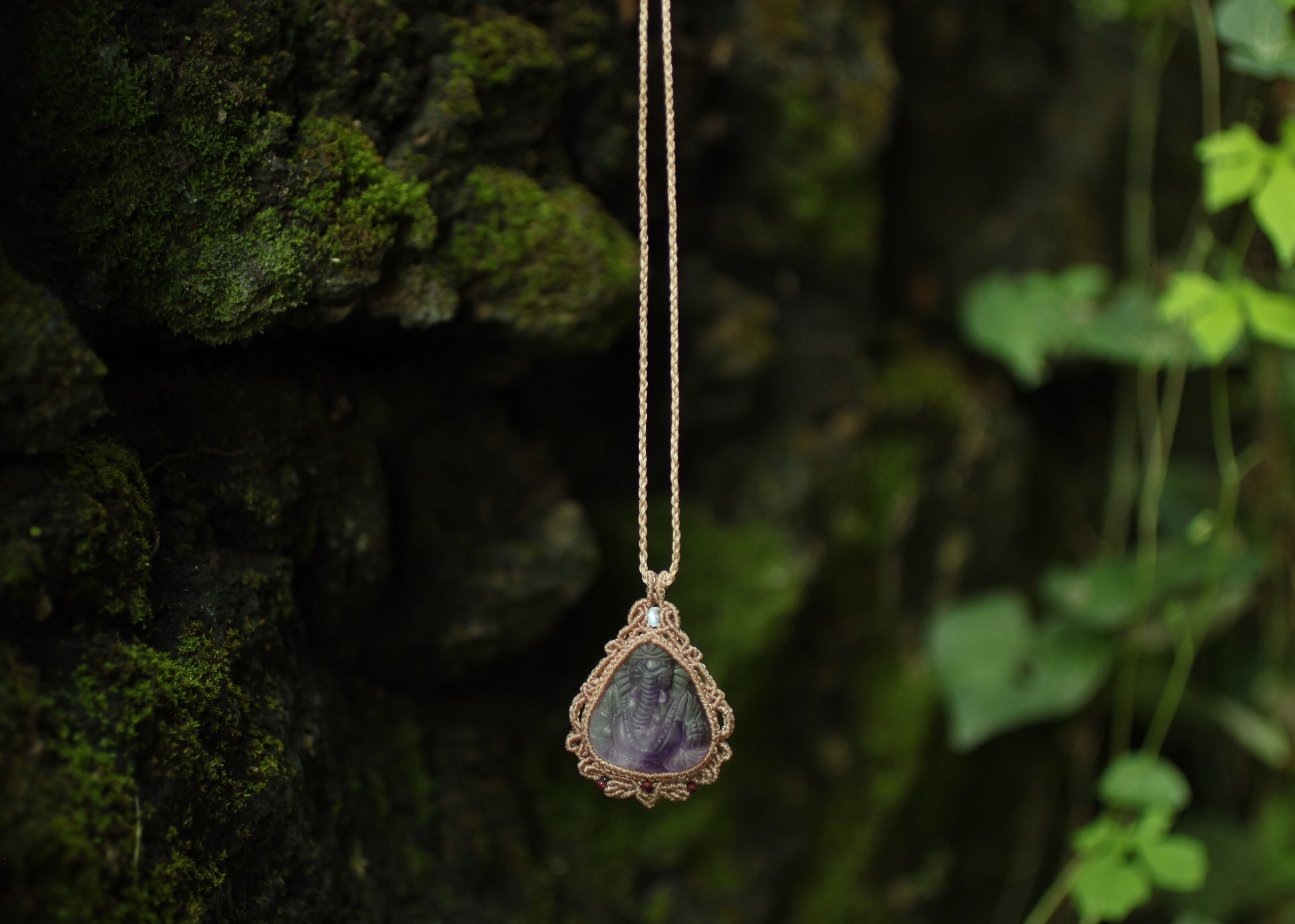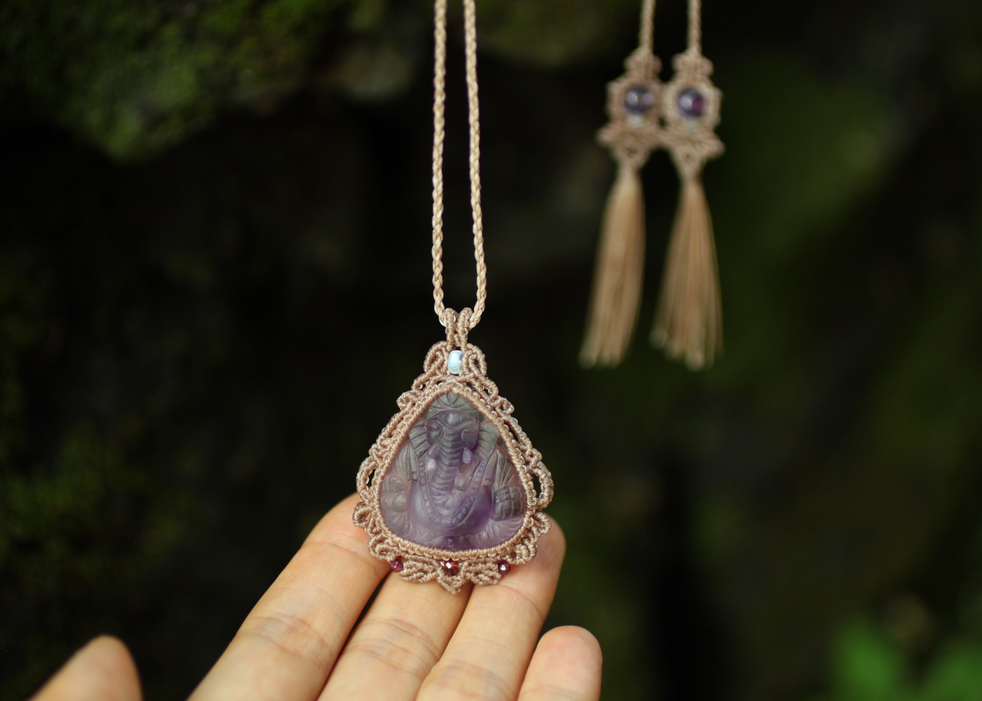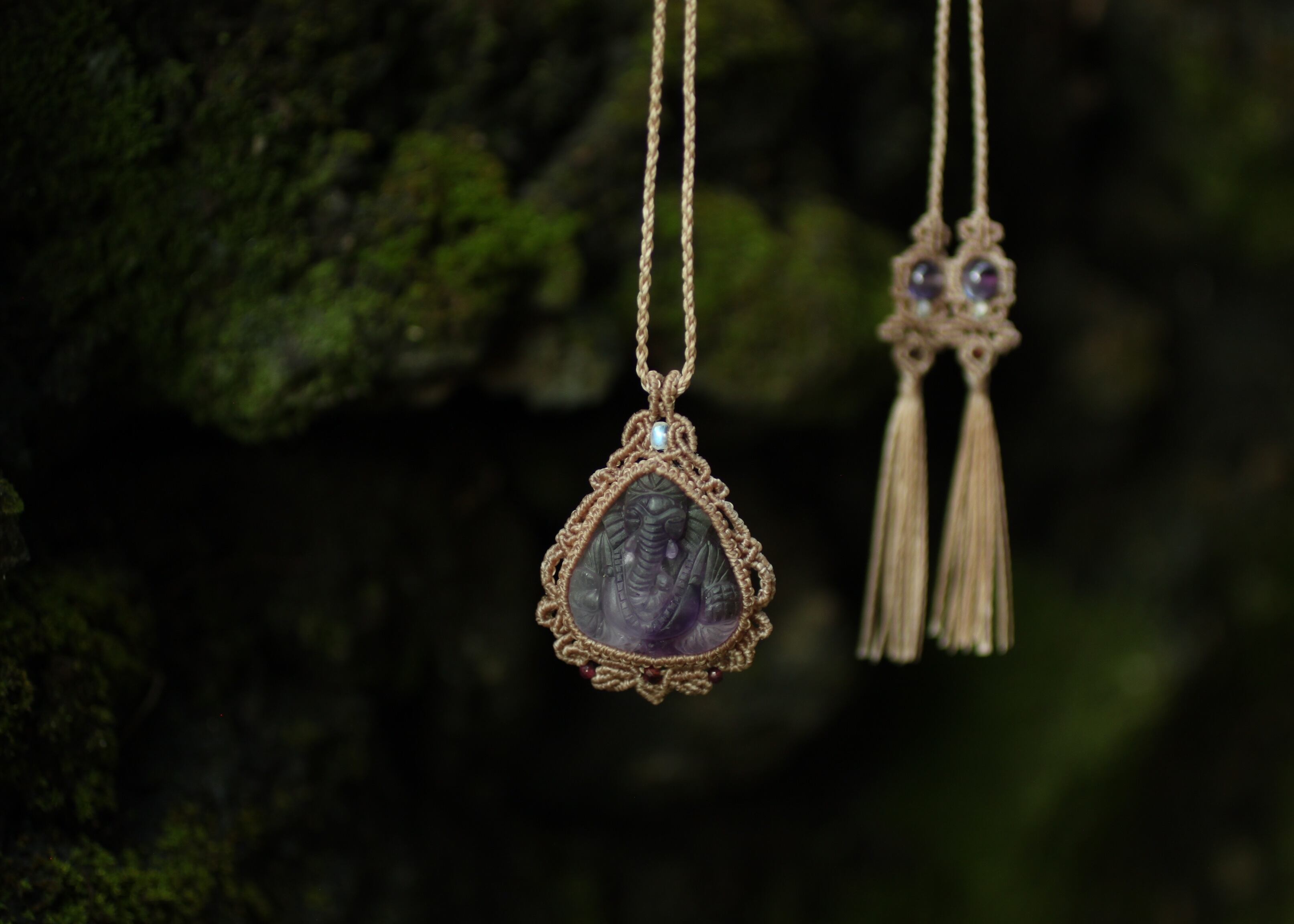 ガネーシャの足元には蓮の花のようなマクラメ模様とグラウディングカラーのガーネット、