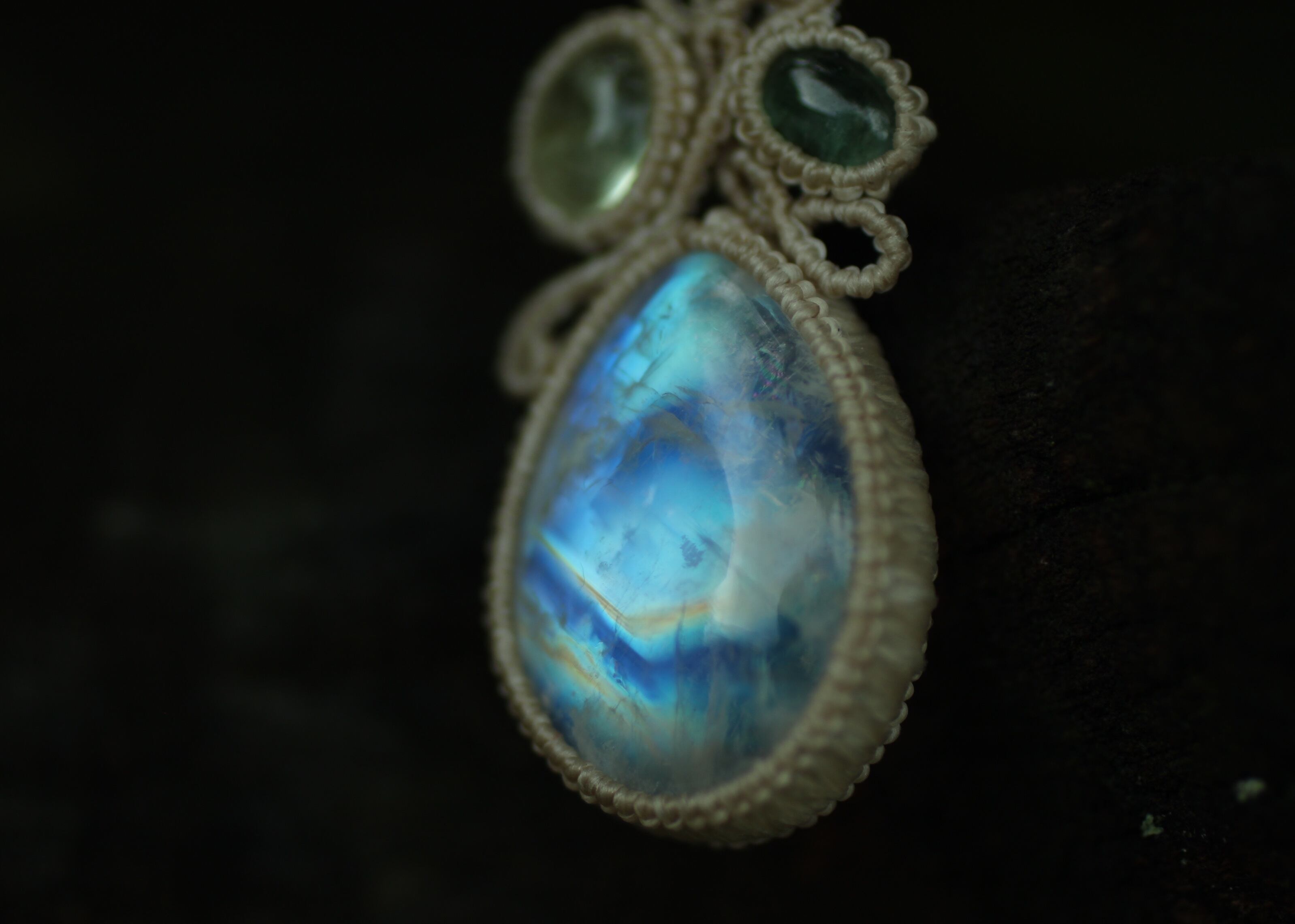 レインボームーンストーンの上には、黄色、緑、ブルー、ライトブルー、