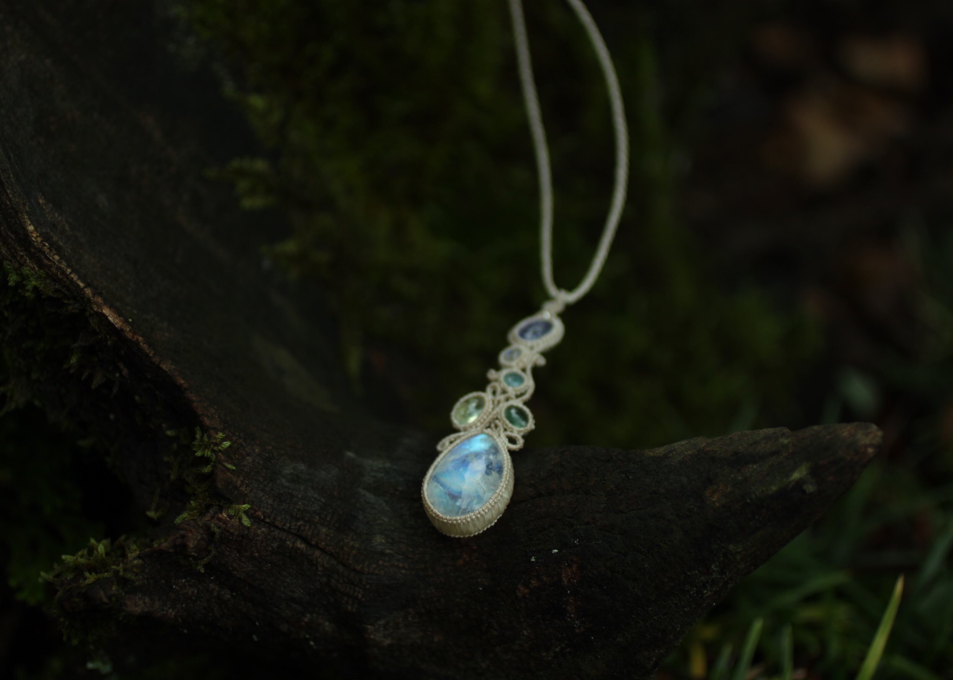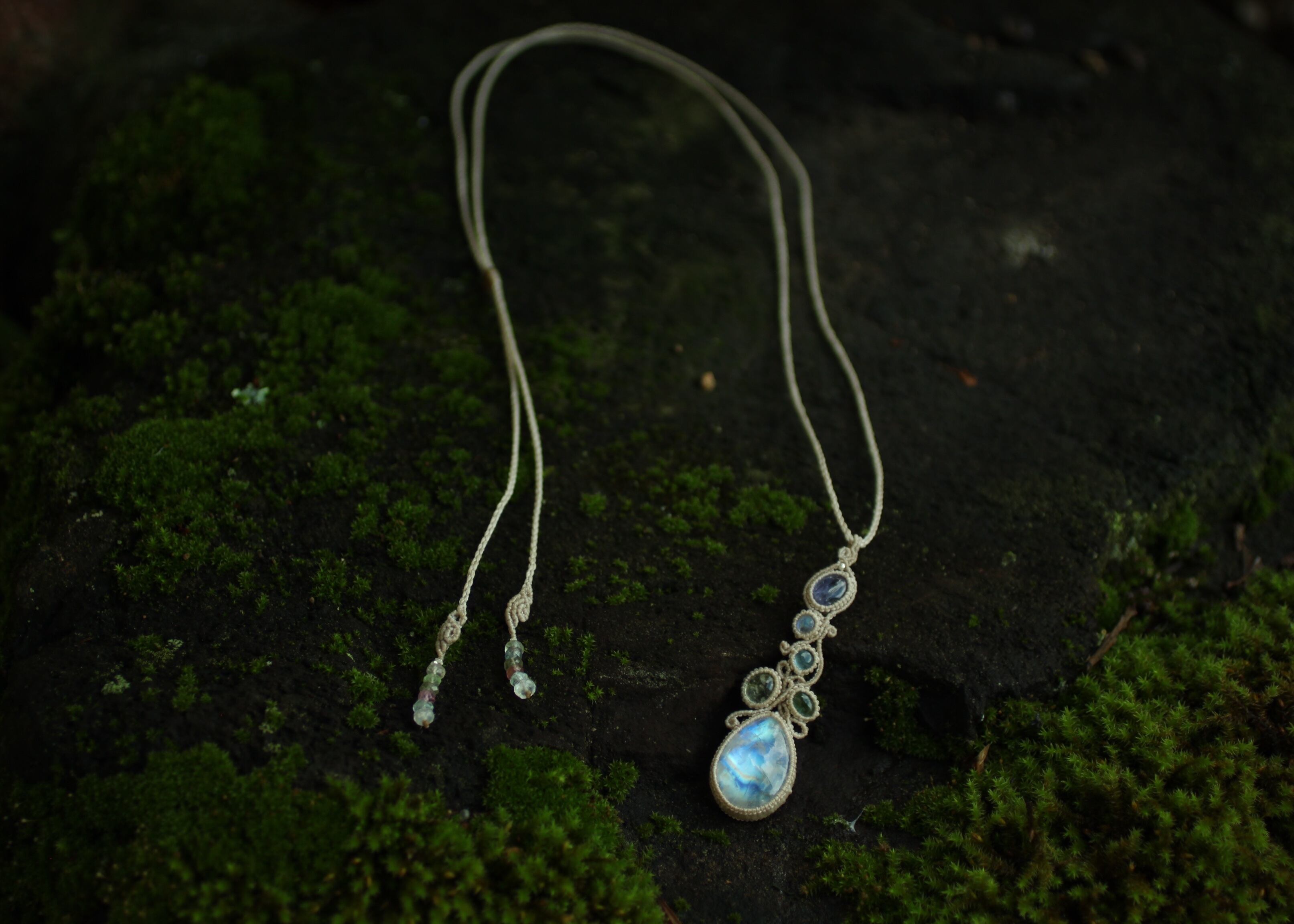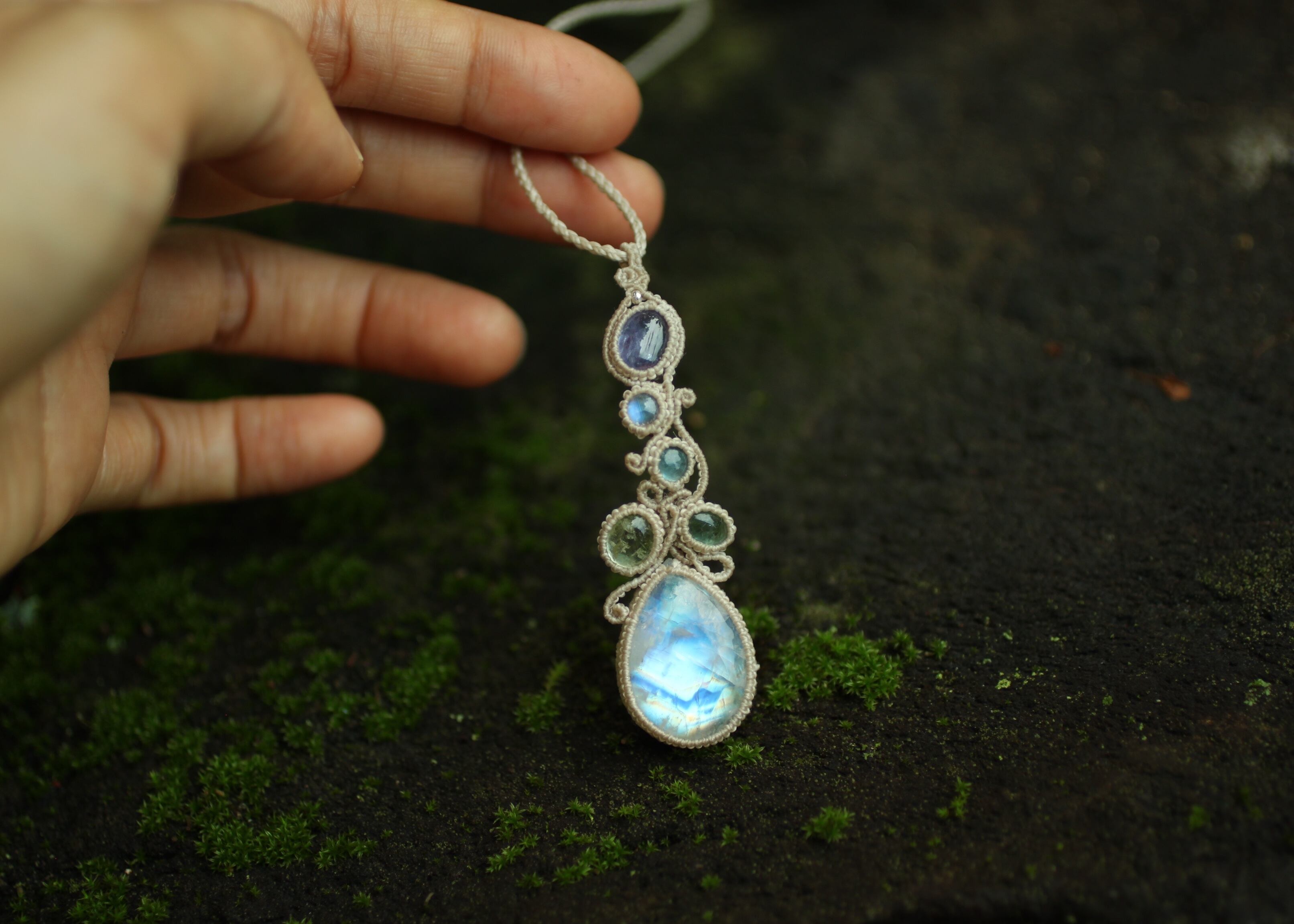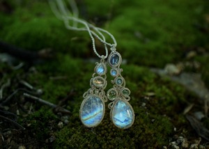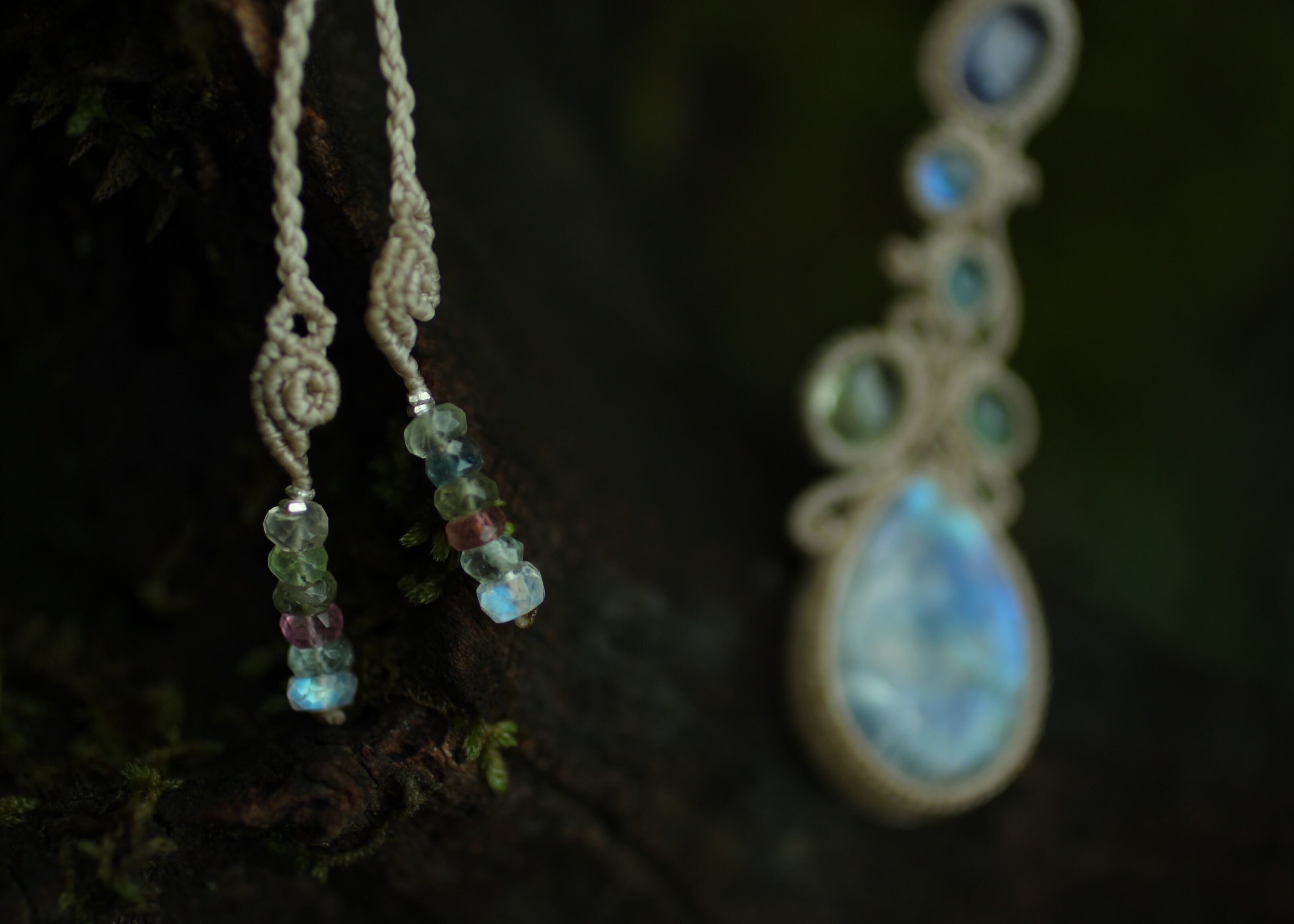 マクラメ編みは動きのある曲線で流れるようにそれぞれの天然石を繋ぎ合せました。