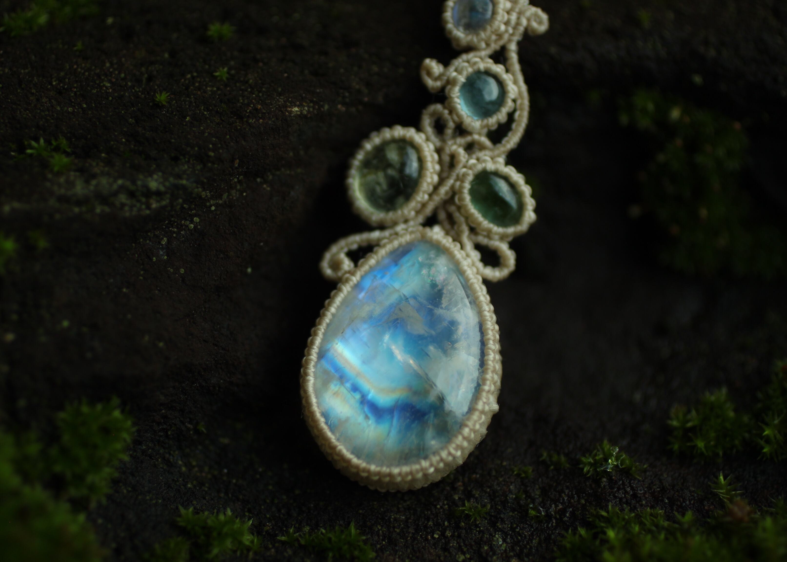 ※ 天然石を包むコードを始めトップ部分に使用したマクラメ編みコードは、手縫い糸ほどの細いコードを使い出来る限り天然石の表情と繊細な仕上がりを重視し時間をかけ丁寧に編みました。