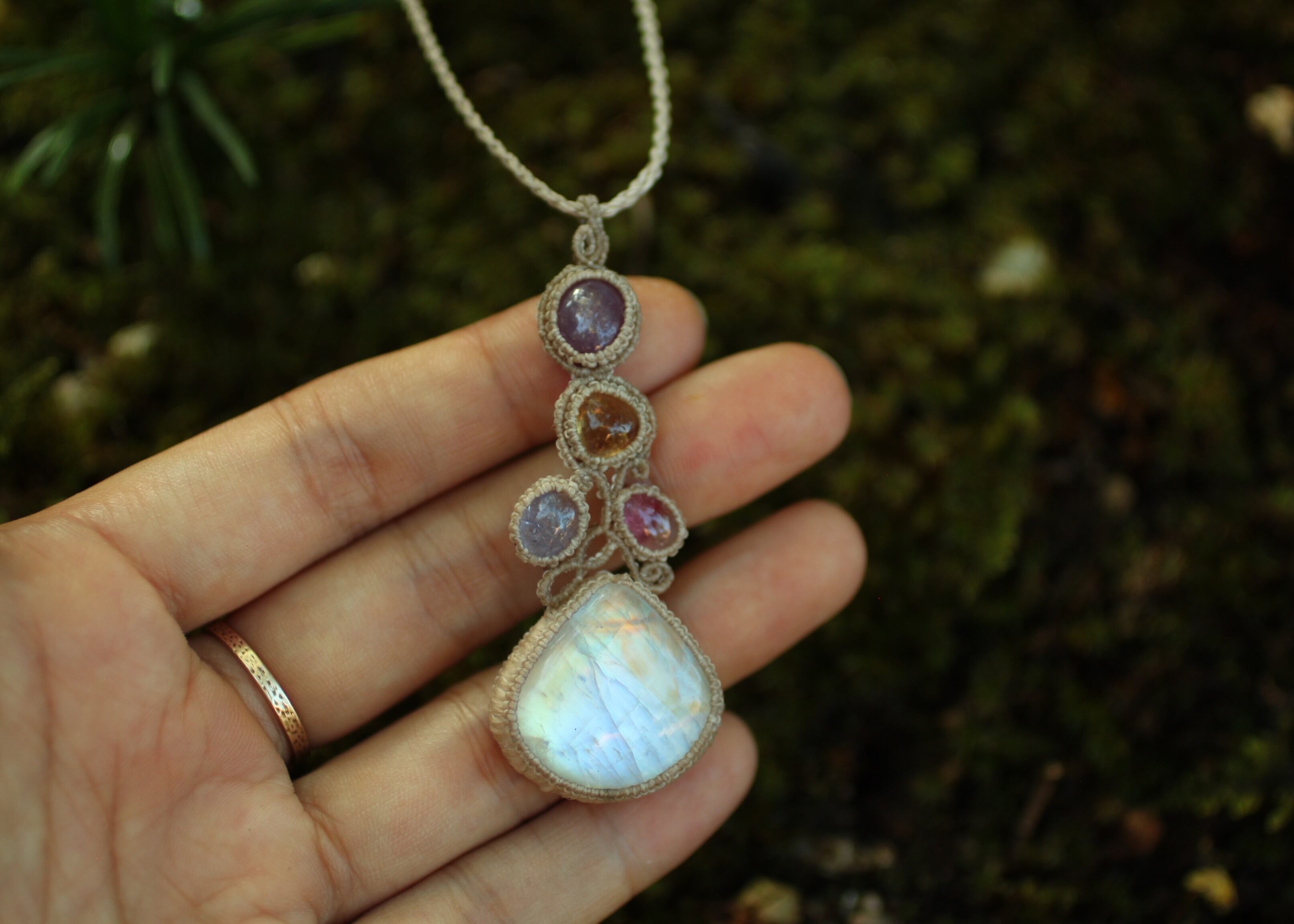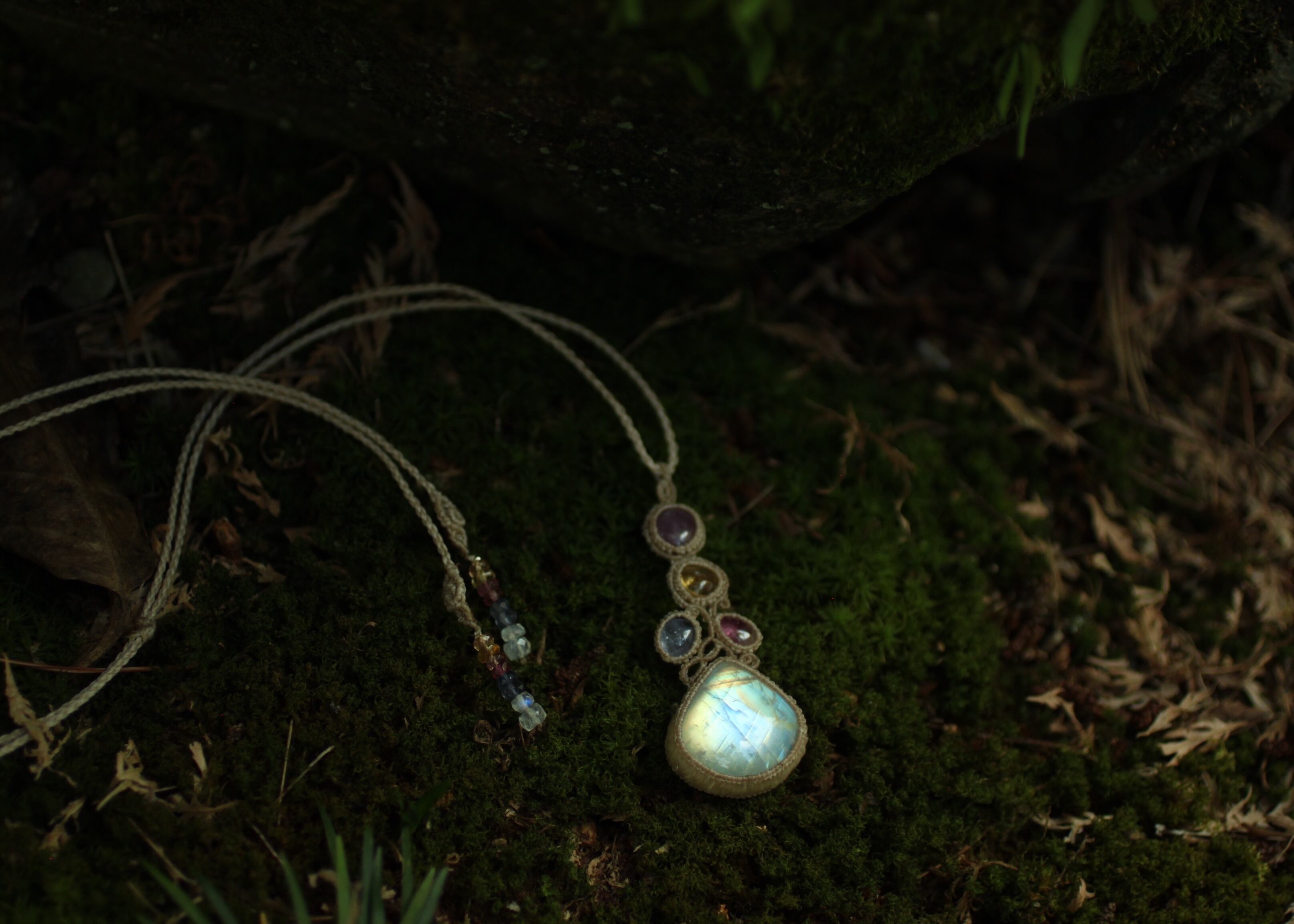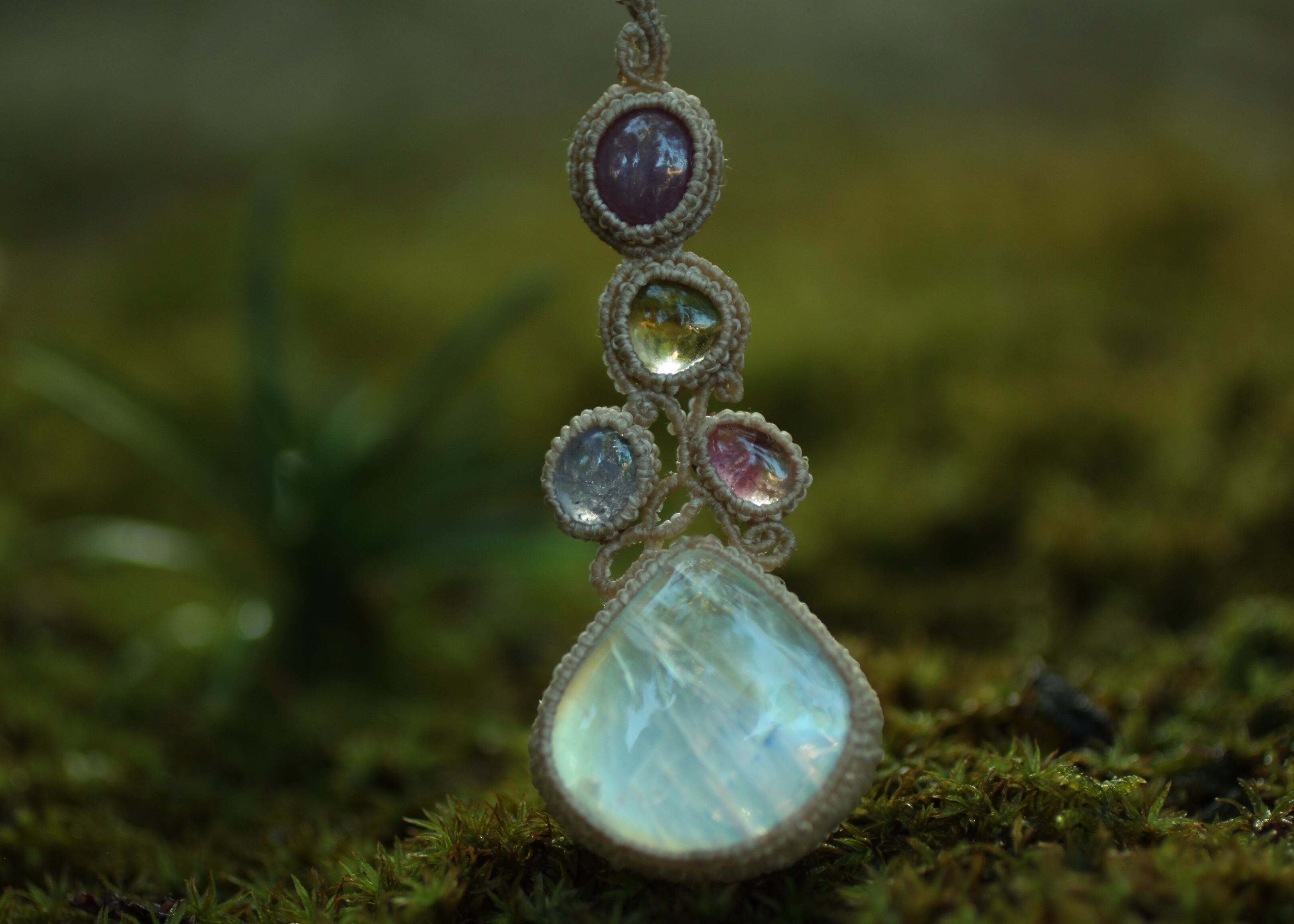 ※ 全ての天然石を包むコードを始めトップ部分に使用したマクラメ編みコードは、手縫い糸ほどの細いコードを使い出来る限り天然石の表情と繊細な仕上がりを重視し時間をかけ丁寧に編みました。