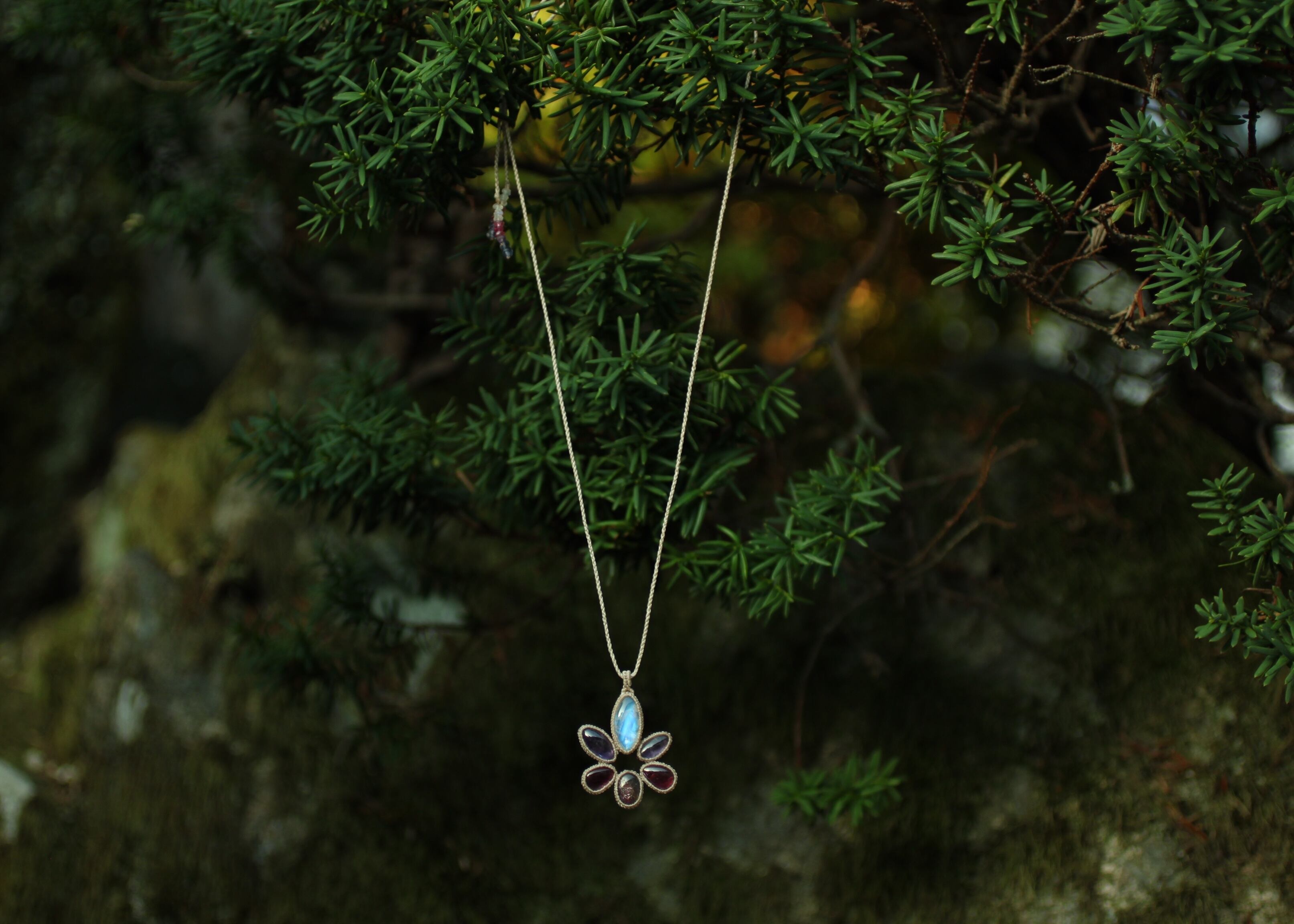 1番下にはアイオライトサンストーンを合わせ、大地から頂くエネルギーを煌めくラメで表現しました。
