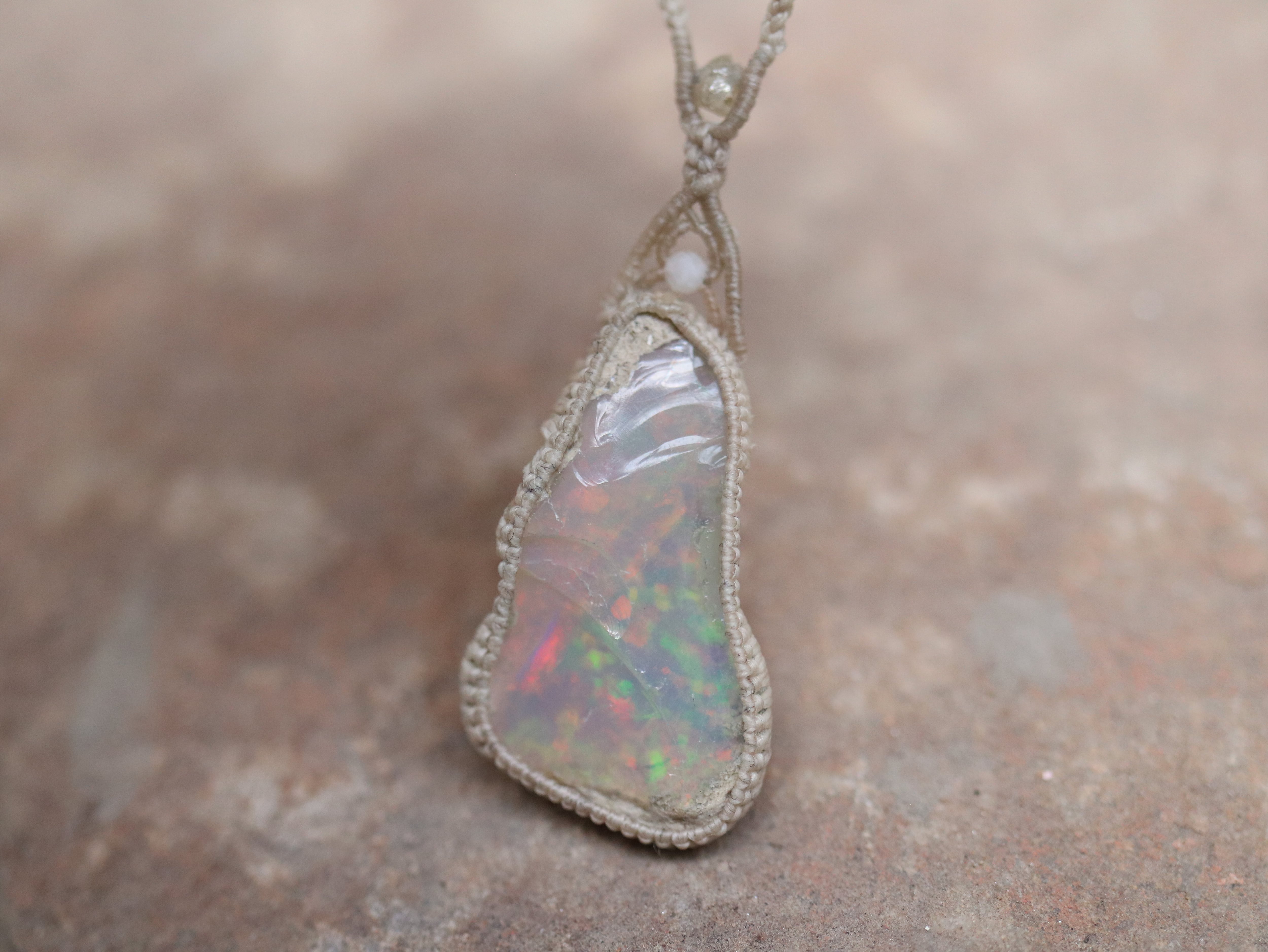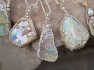 湿度環境により変化の見られる天然石ですが、こちらはベースとなる乳白色部分に透明感の高低の変化はあるものの、遊色に関しては常に華やかさを保っています。