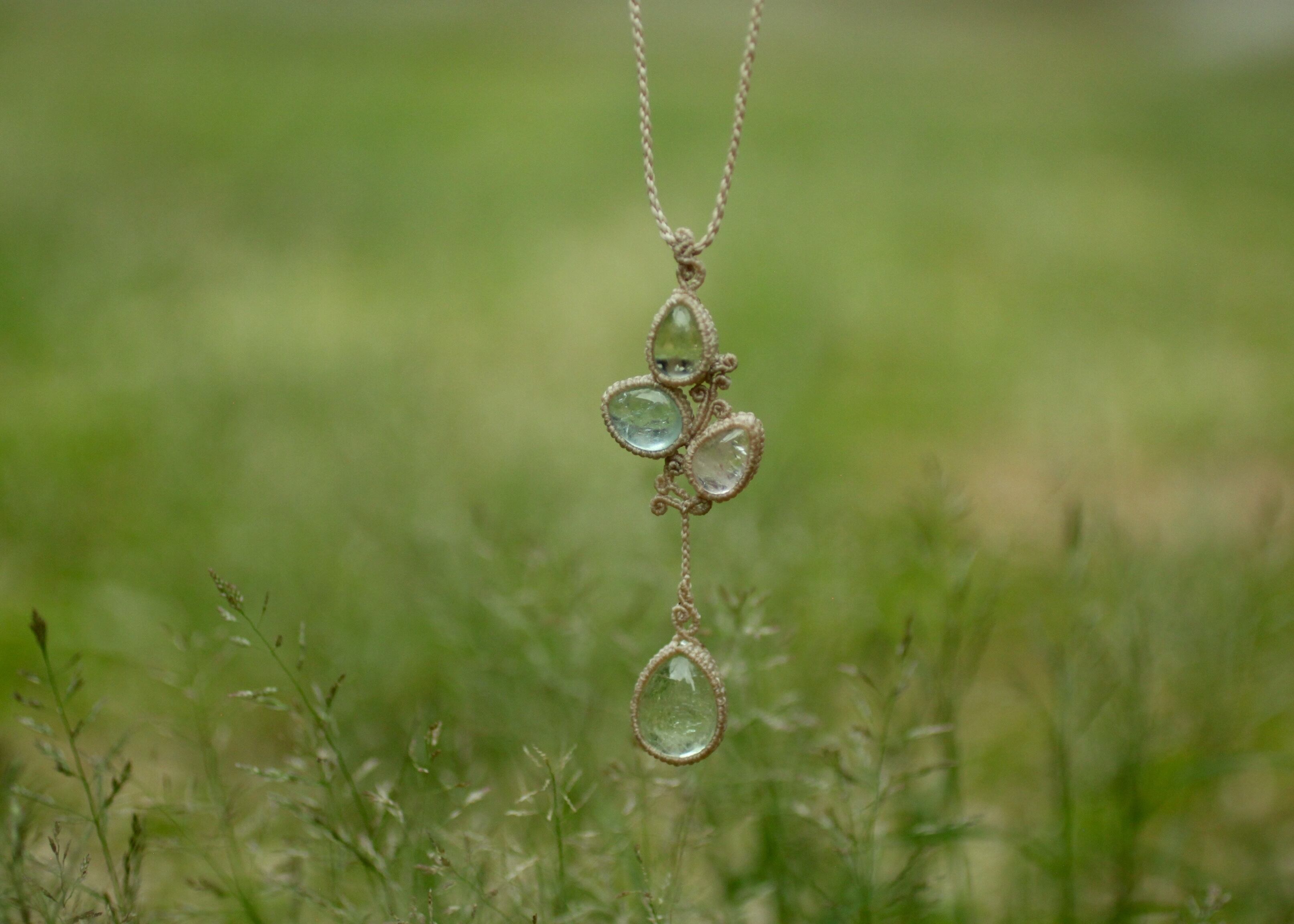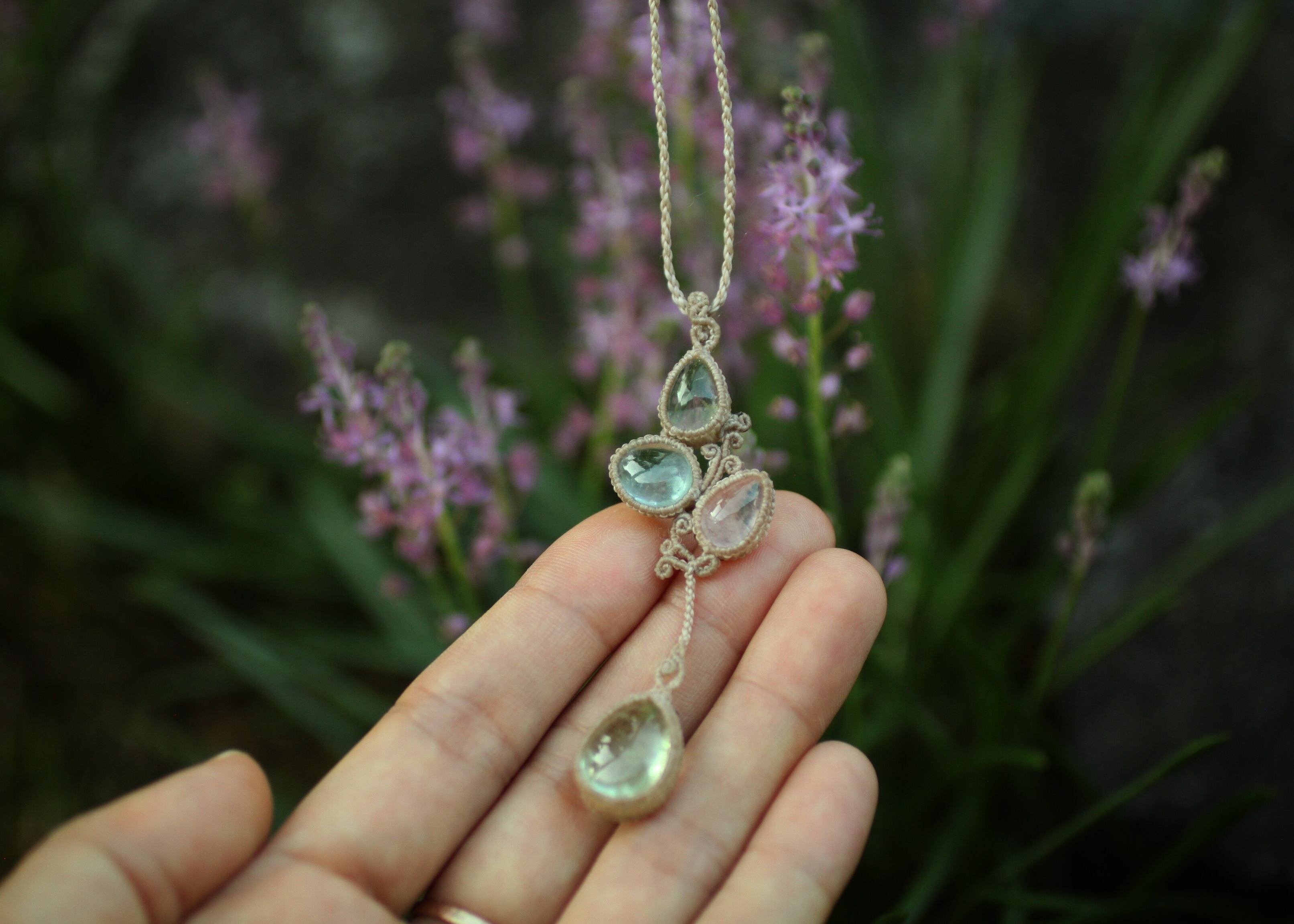 マクラメ編みはそれぞれの柔らかな天然石の雰囲気を感じ、絵を描くように編み進めました。