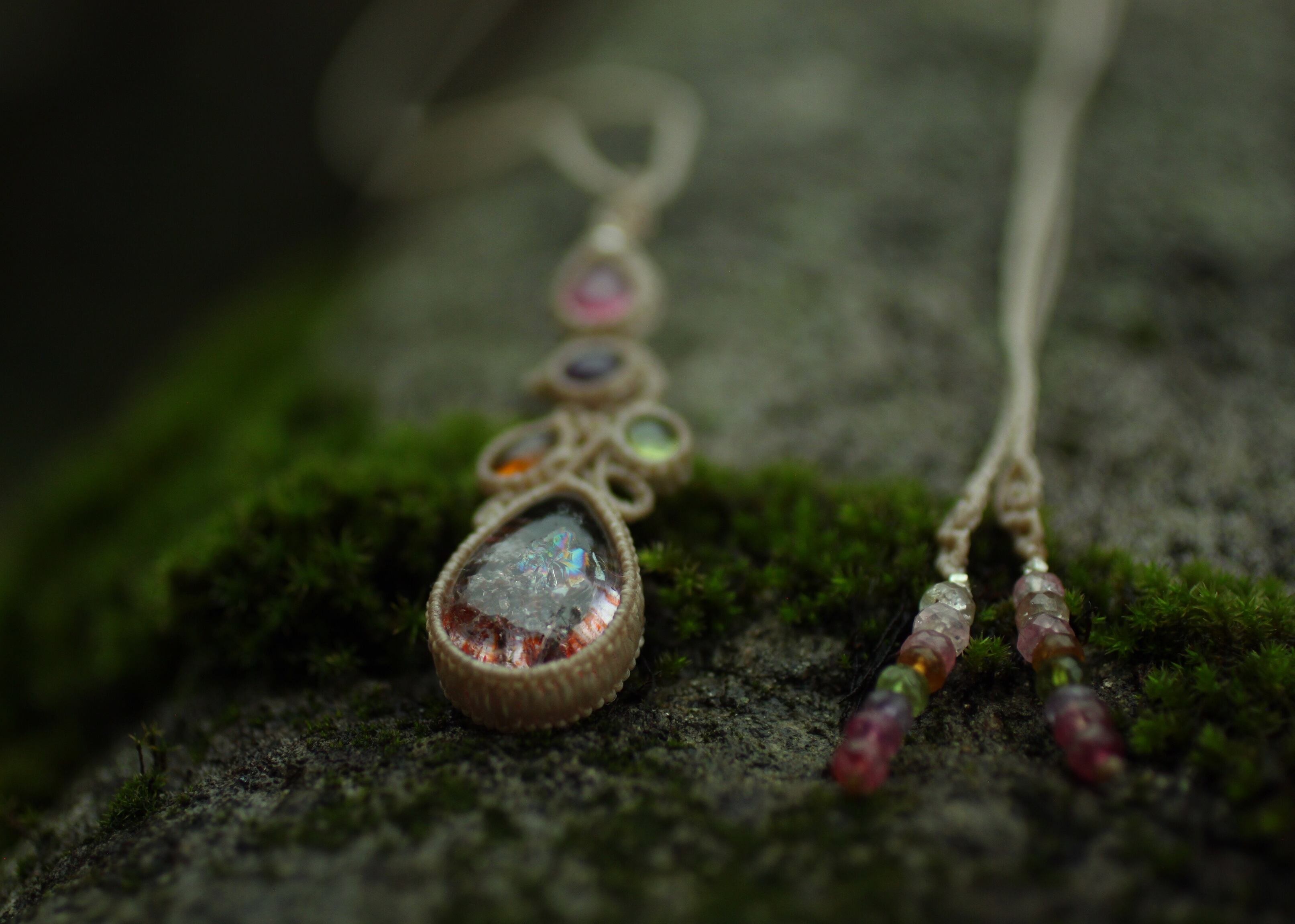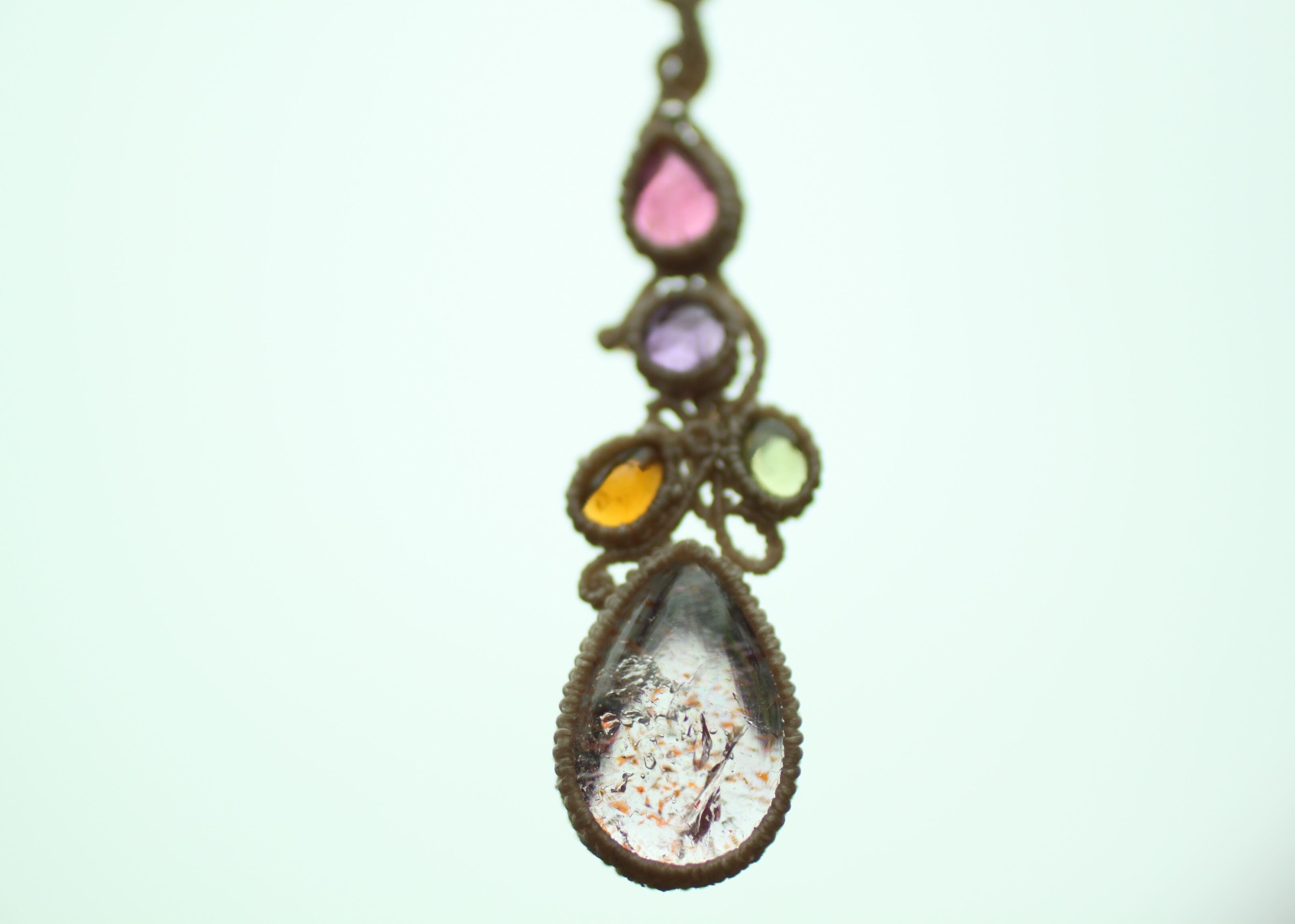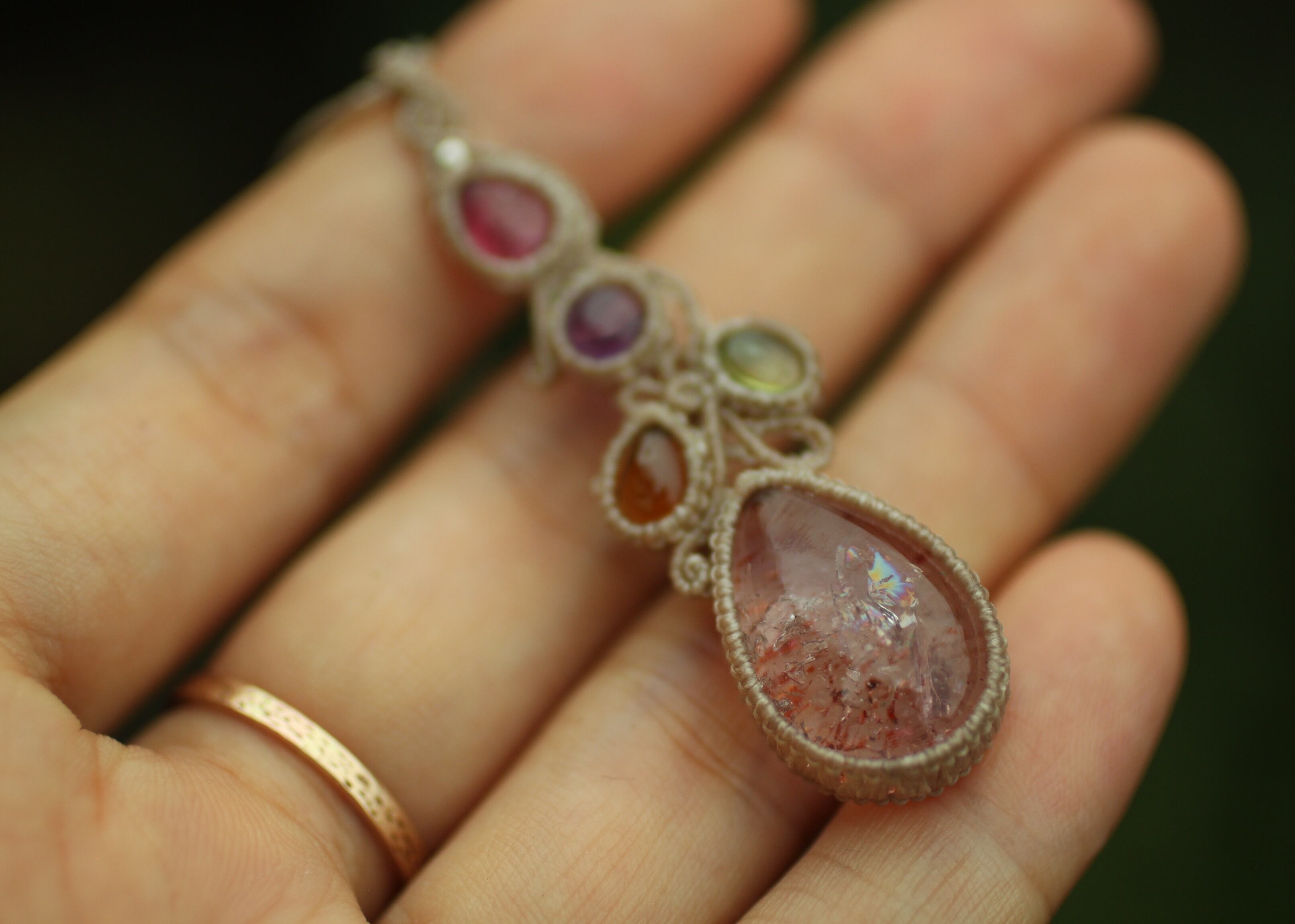 ※ 全ての天然石を包むコードを始めトップ部分に使用したマクラメ編みコードは、手縫い糸ほどの細いコードを使い出来る限り天然石の表情と繊細な仕上がりを重視し時間をかけ丁寧に編みました。