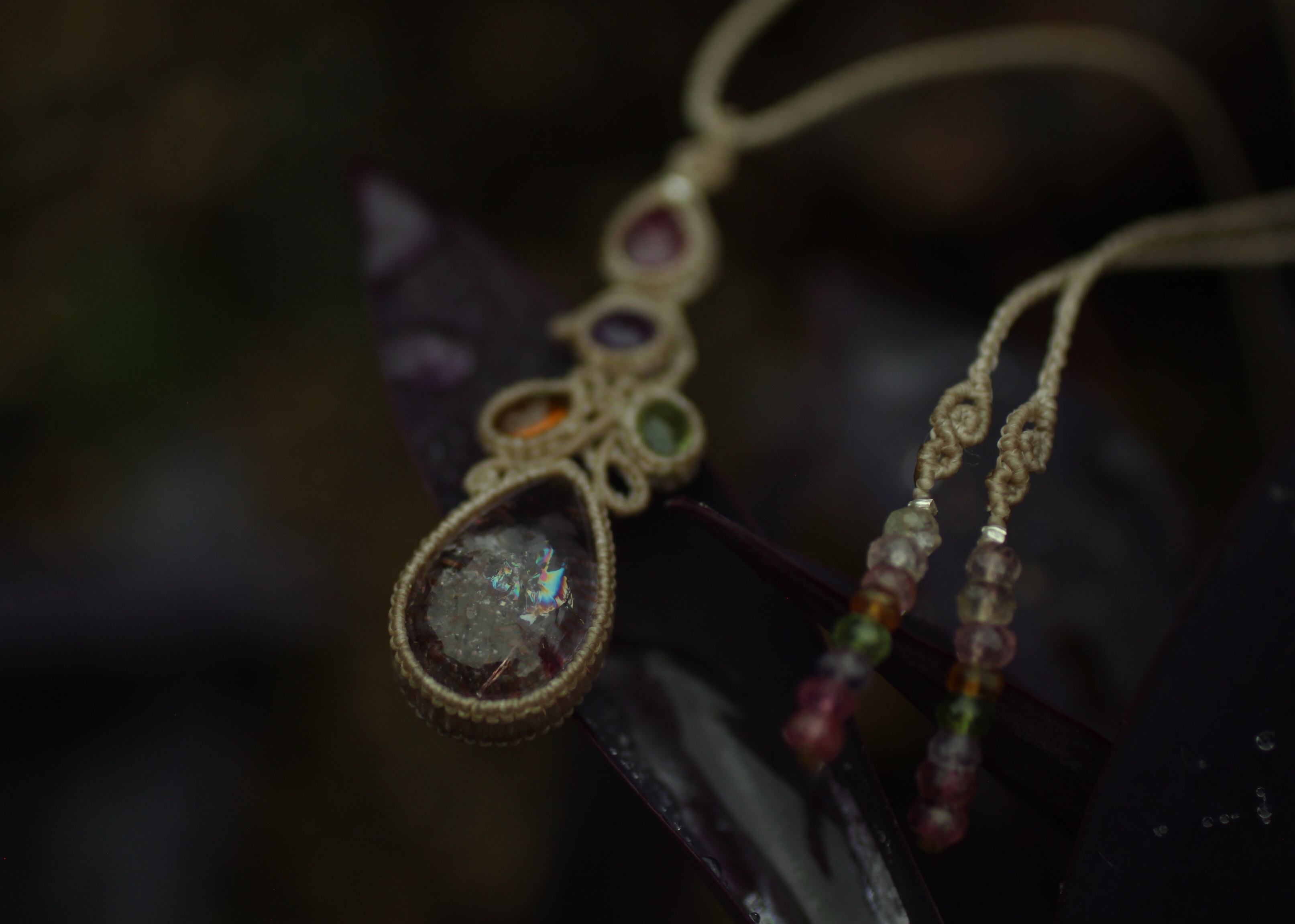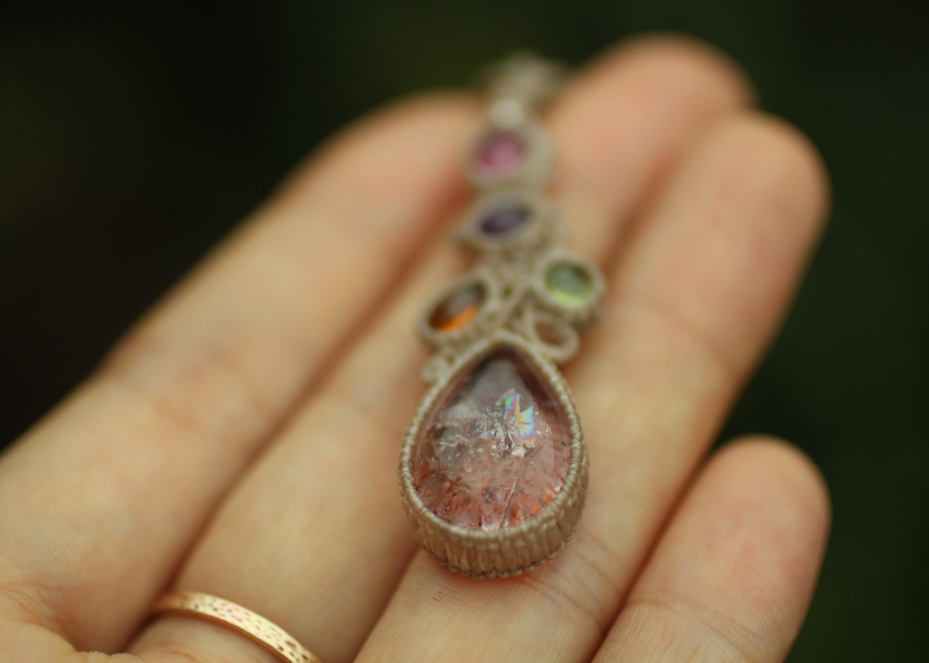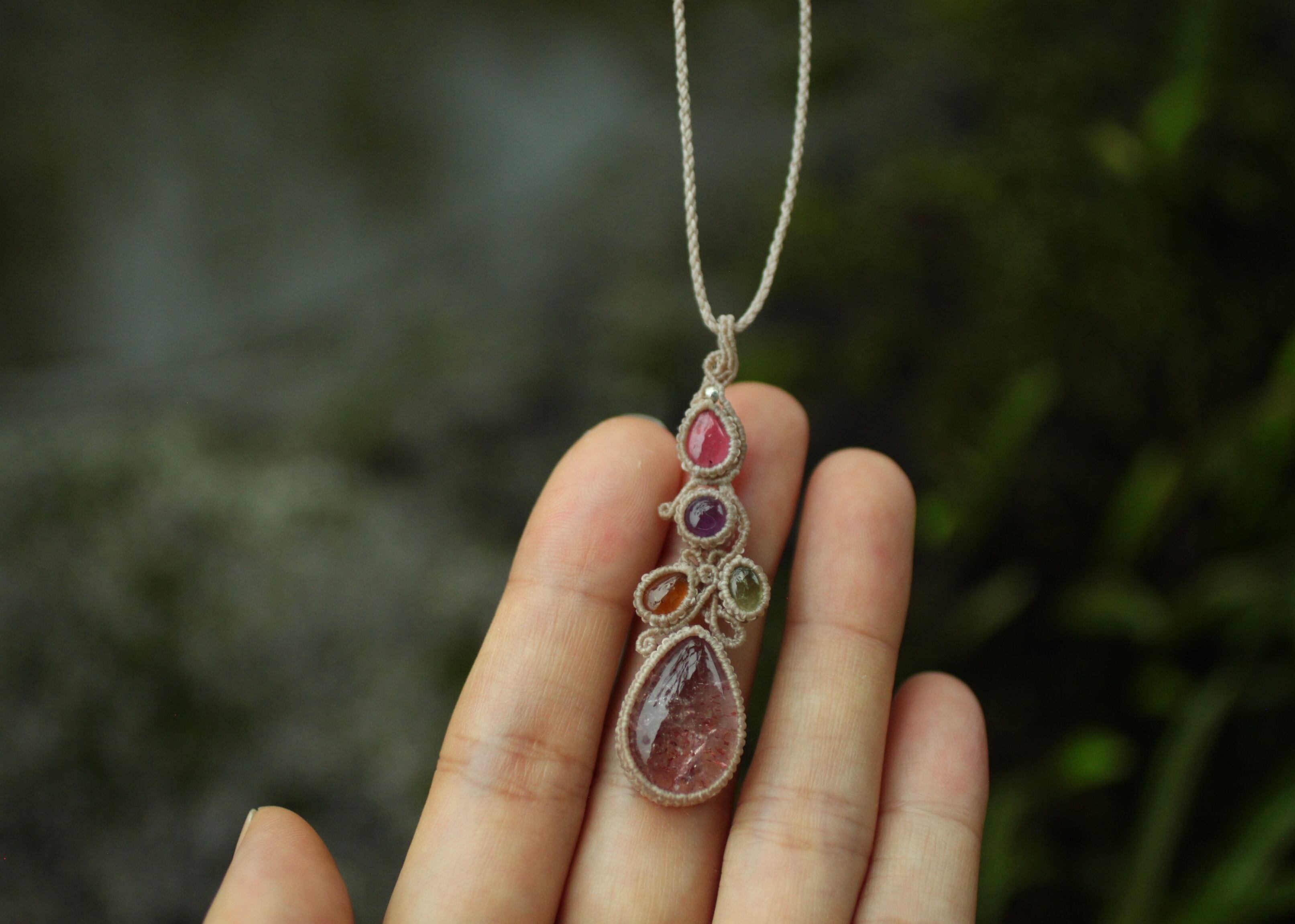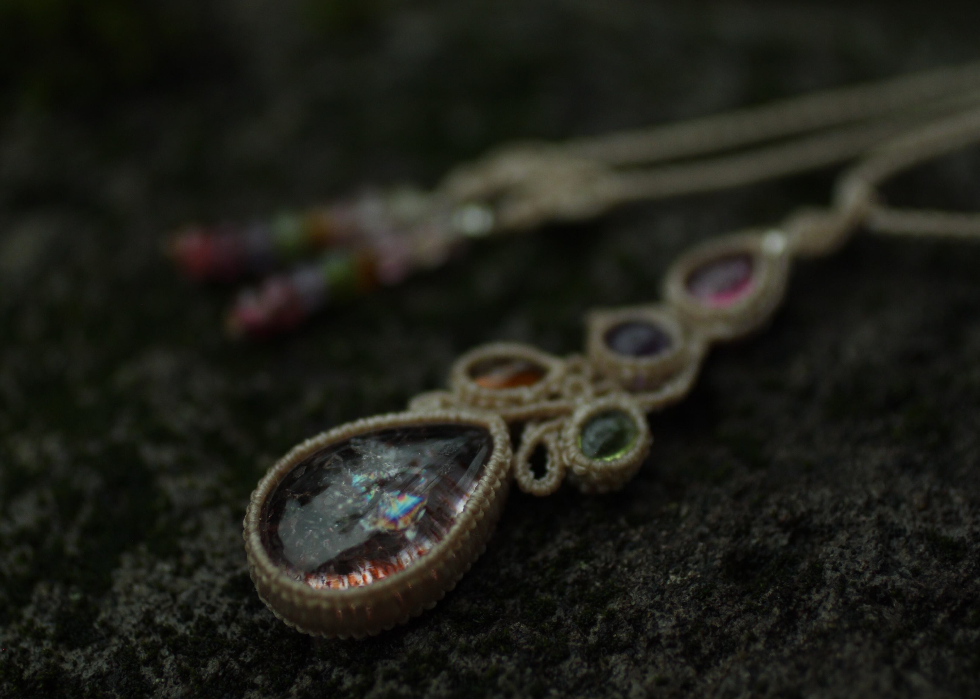 ※ 全ての天然石を包むコードを始めトップ部分に使用したマクラメ編みコードは、手縫い糸ほどの細いコードを使い出来る限り天然石の表情と繊細な仕上がりを重視し時間をかけ丁寧に編みました。