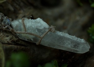 ダブル水晶ポイント (両剣水晶) の表面には小さな結晶や水晶ポイントがいくつも成長し、表面を結晶が着飾った珍しいタイプの水晶ポイント、