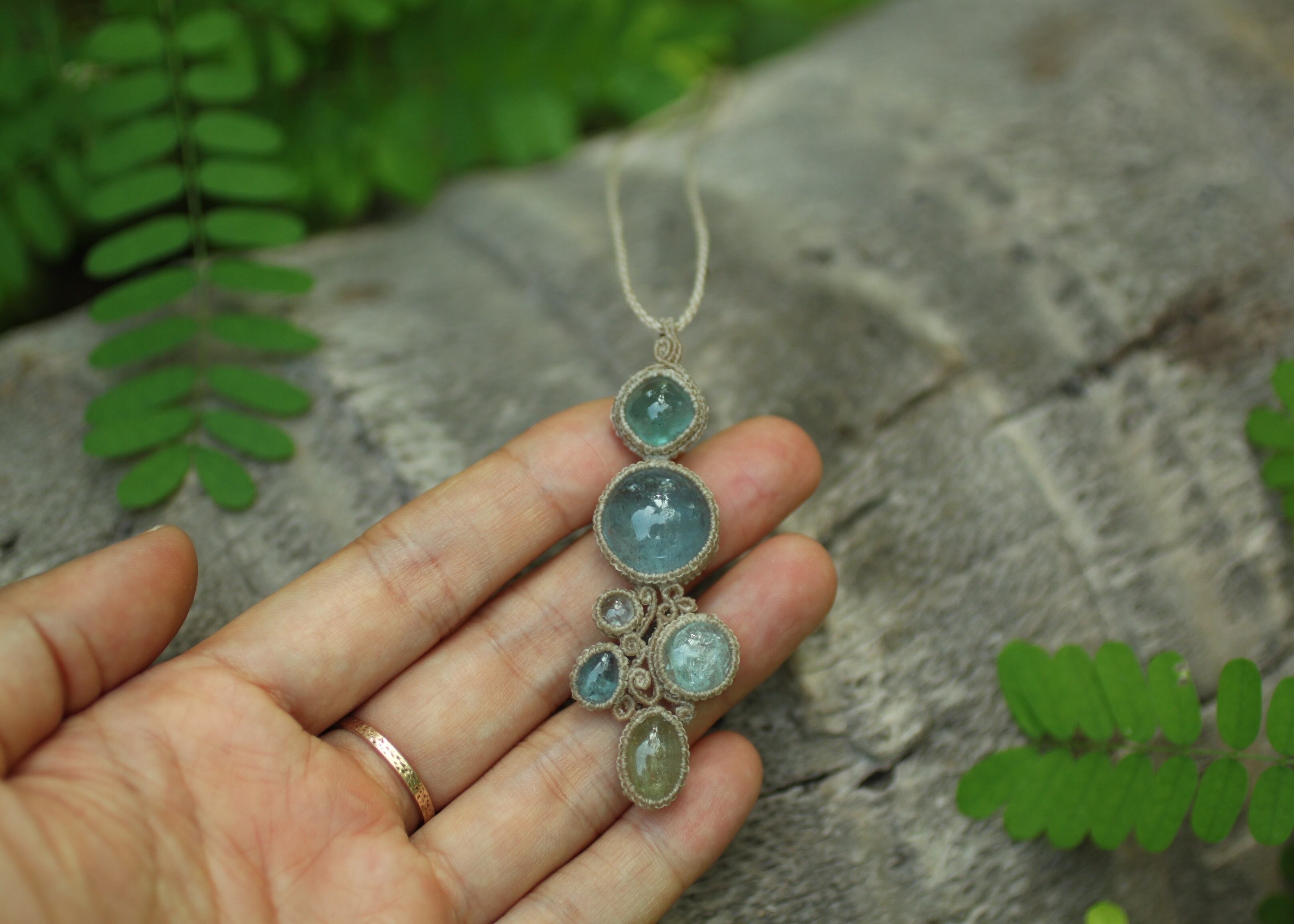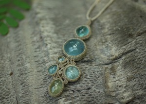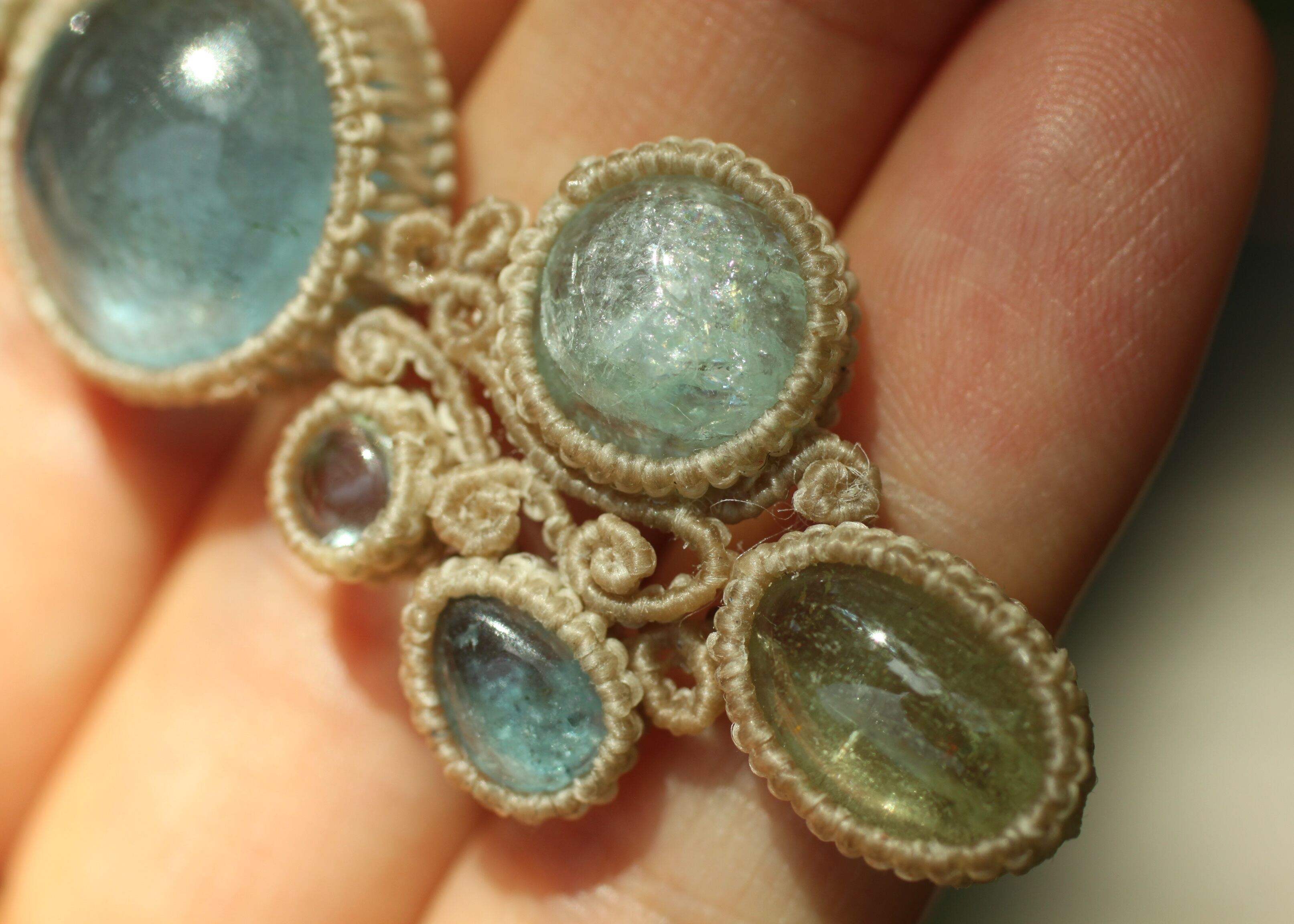 手縫い糸ほどの細いコードを使い出来る限り天然石の表情と繊細な仕上がりを重視し時間をかけ丁寧に編みました。