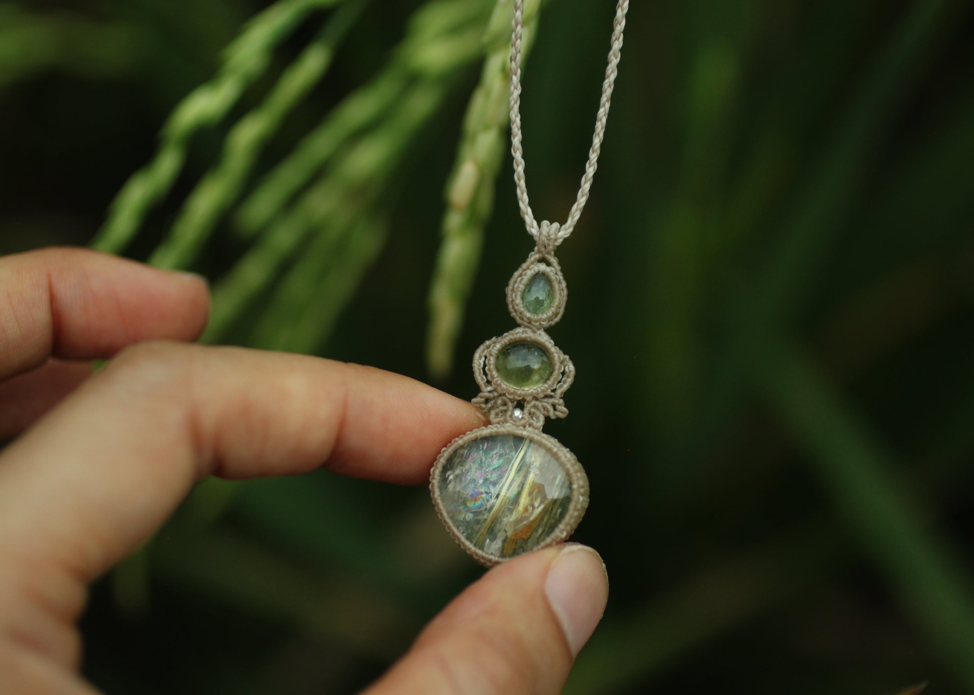 手縫い糸ほどの細いコードを使い出来る限り天然石の表情と繊細な仕上がりを重視し時間をかけ丁寧に編みました。