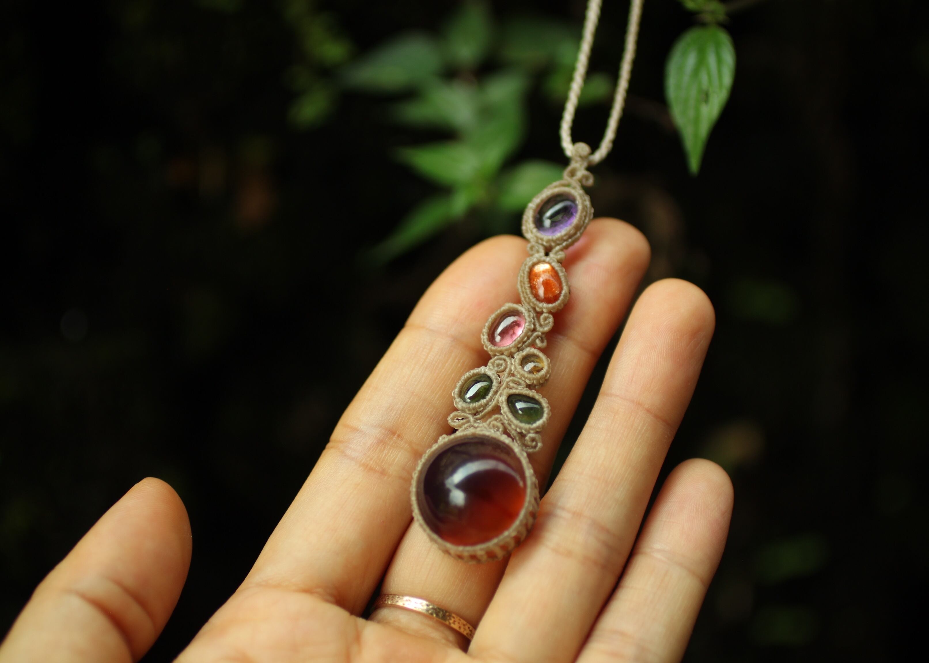 ※ 天然石を包むコードを始めトップ部分に使用したマクラメ編みコードは、
