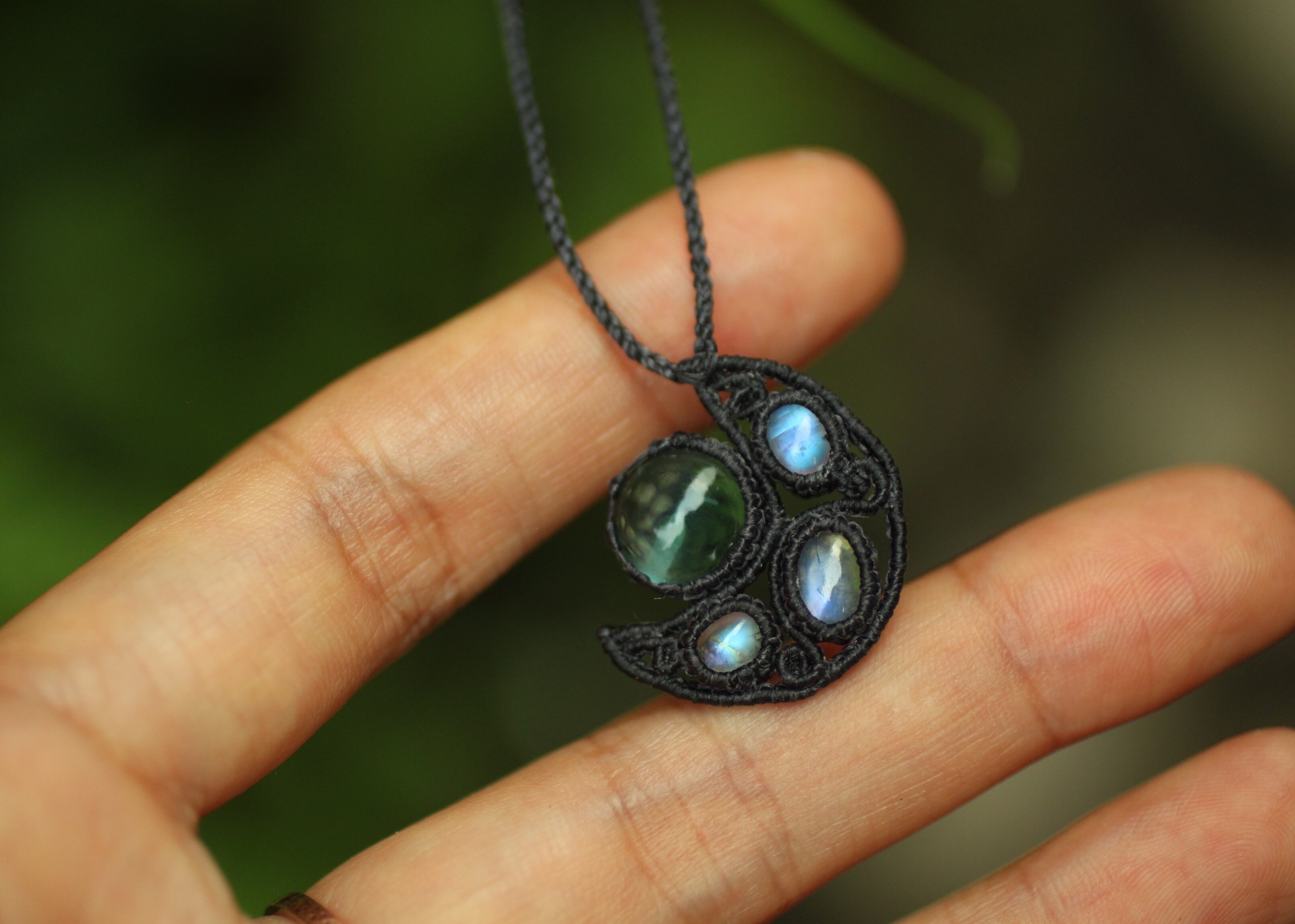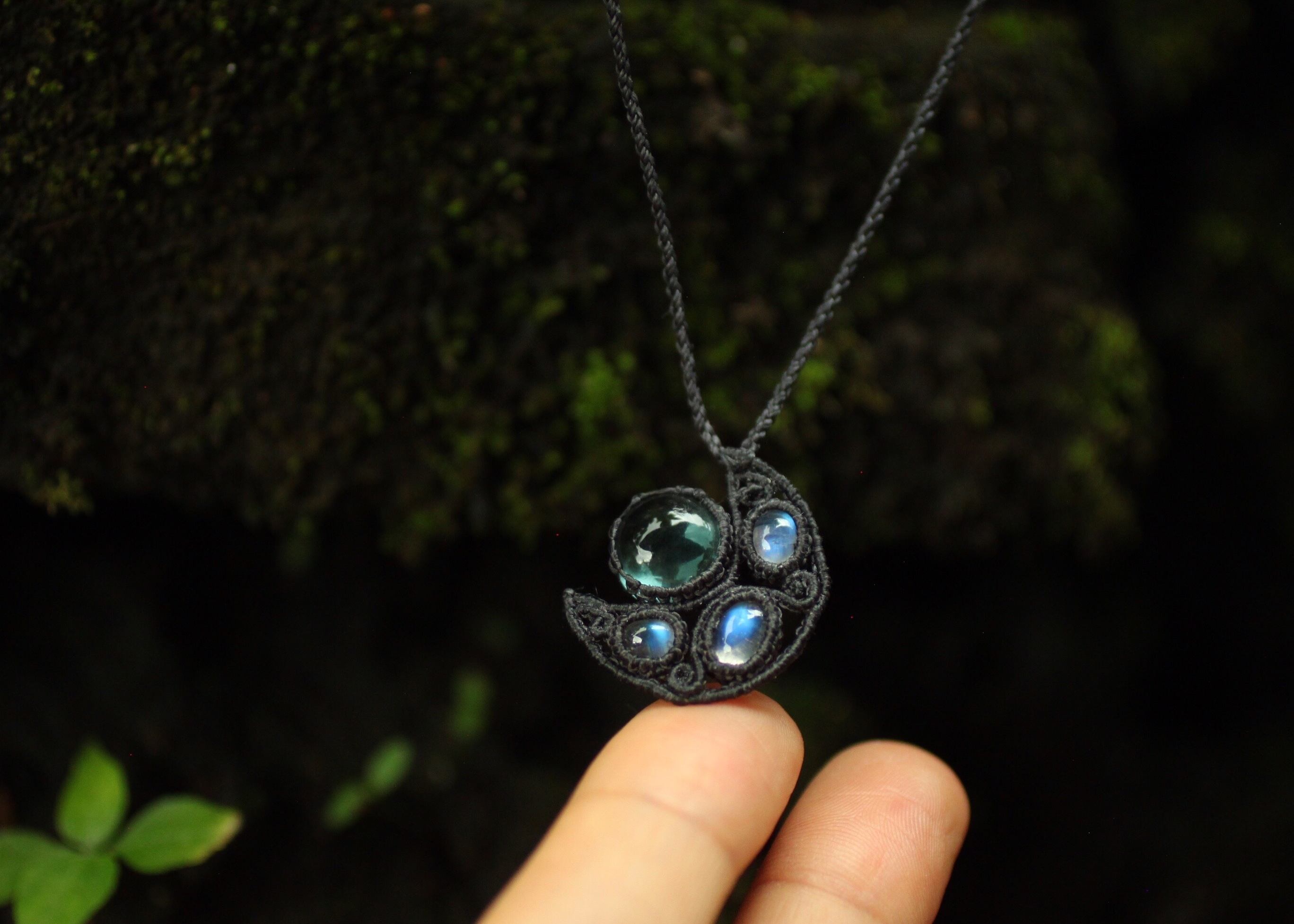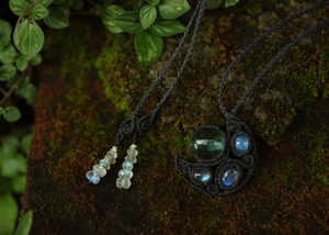 手縫い糸ほどの細いコードを使い出来る限り天然石の表情と繊細な仕上がりを重視し時間をかけ丁寧に編みました。