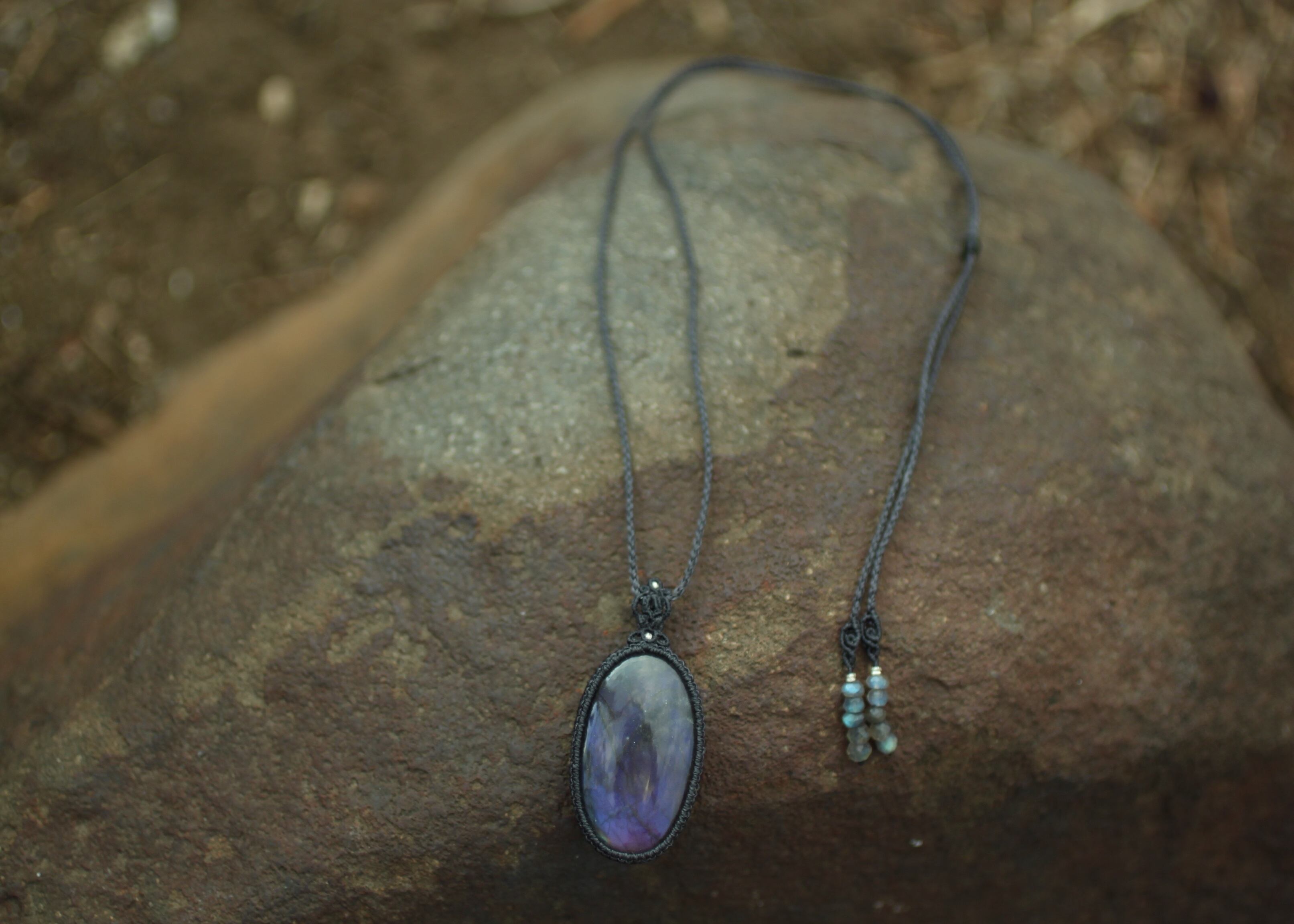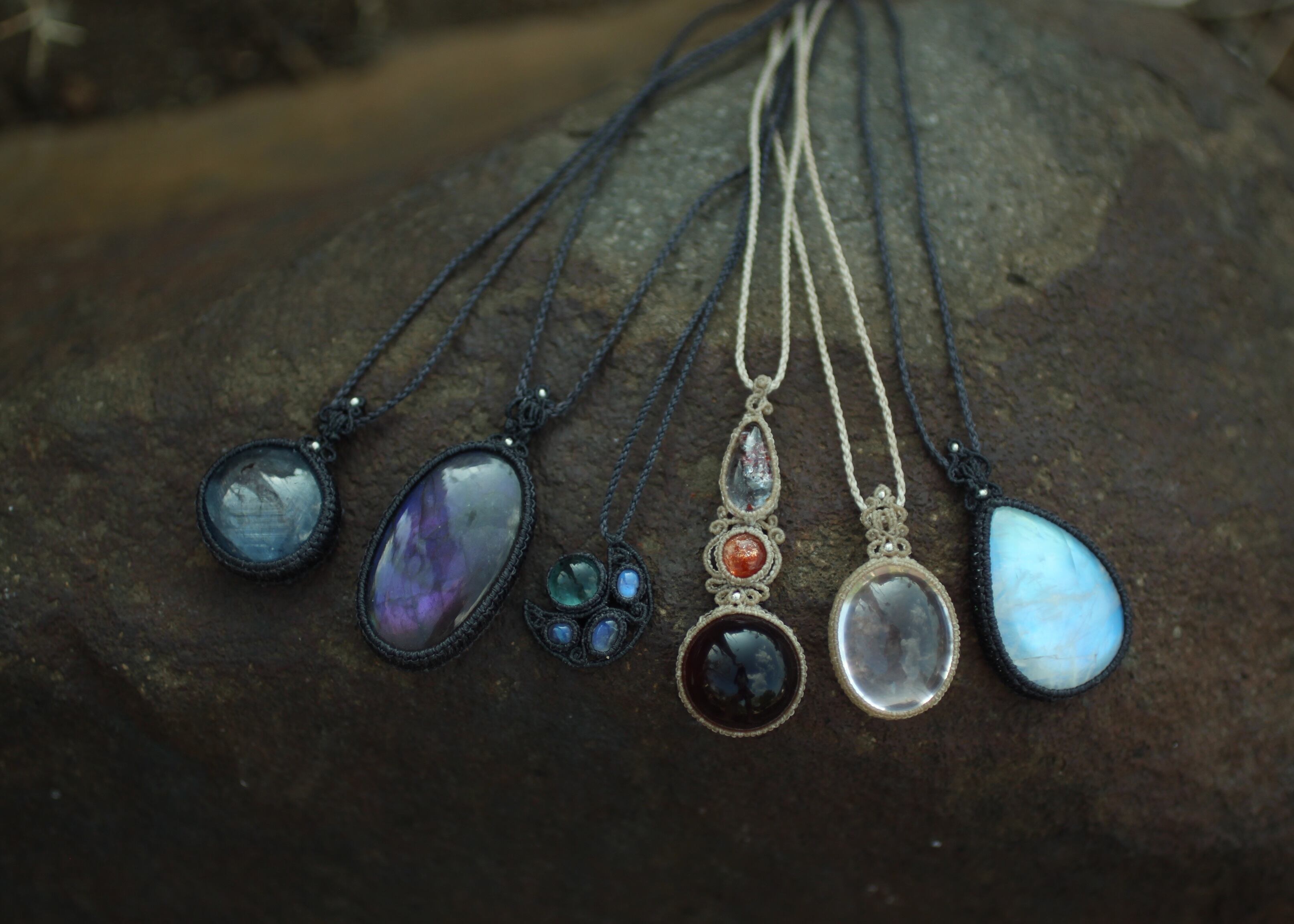 ※ 天然石のトップ部分に施したマクラメ編みのコードは、