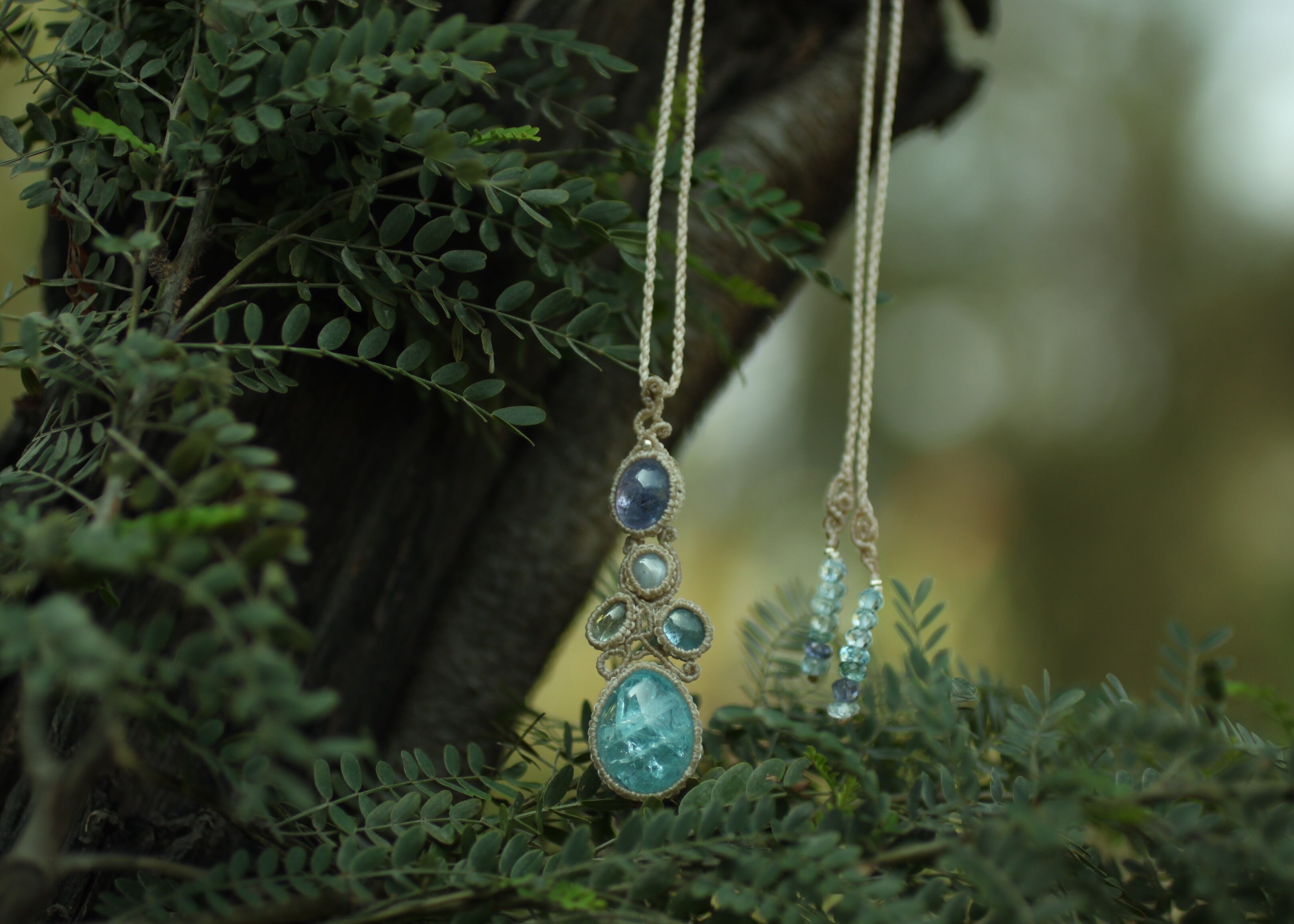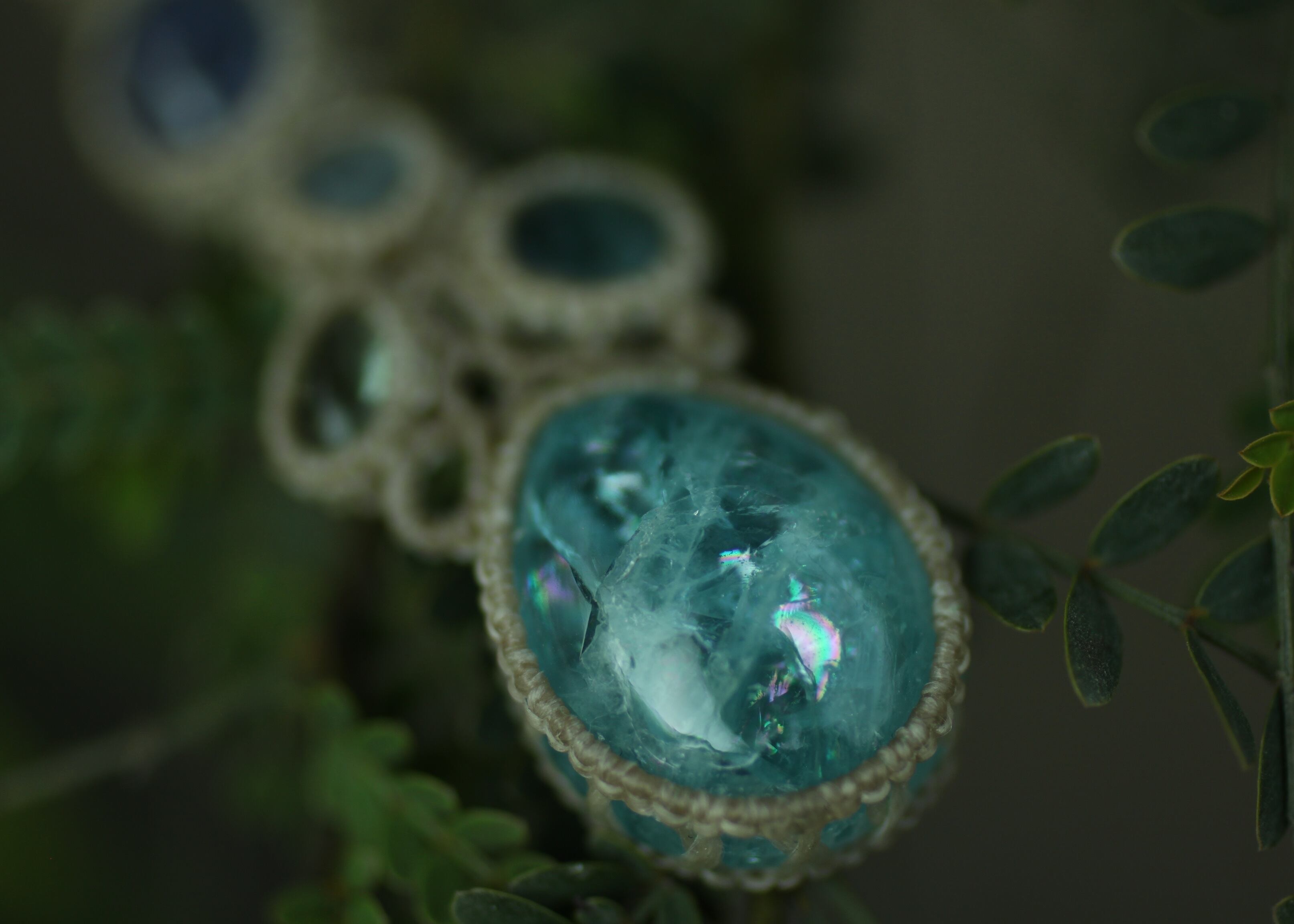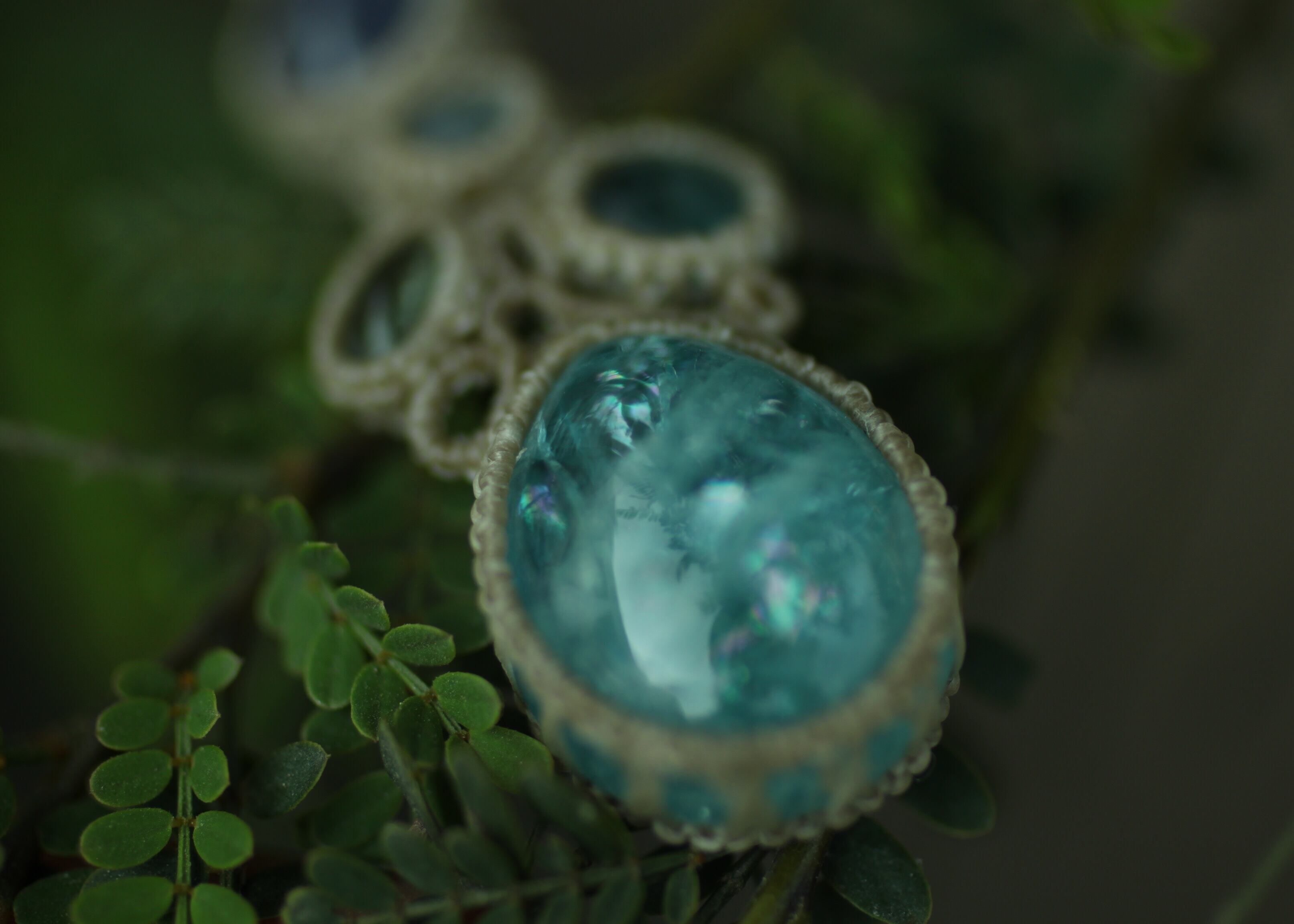 手縫い糸ほどの細いコードを使い出来る限り天然石の表情と繊細な仕上がりを重視し時間をかけ丁寧に編みました。
