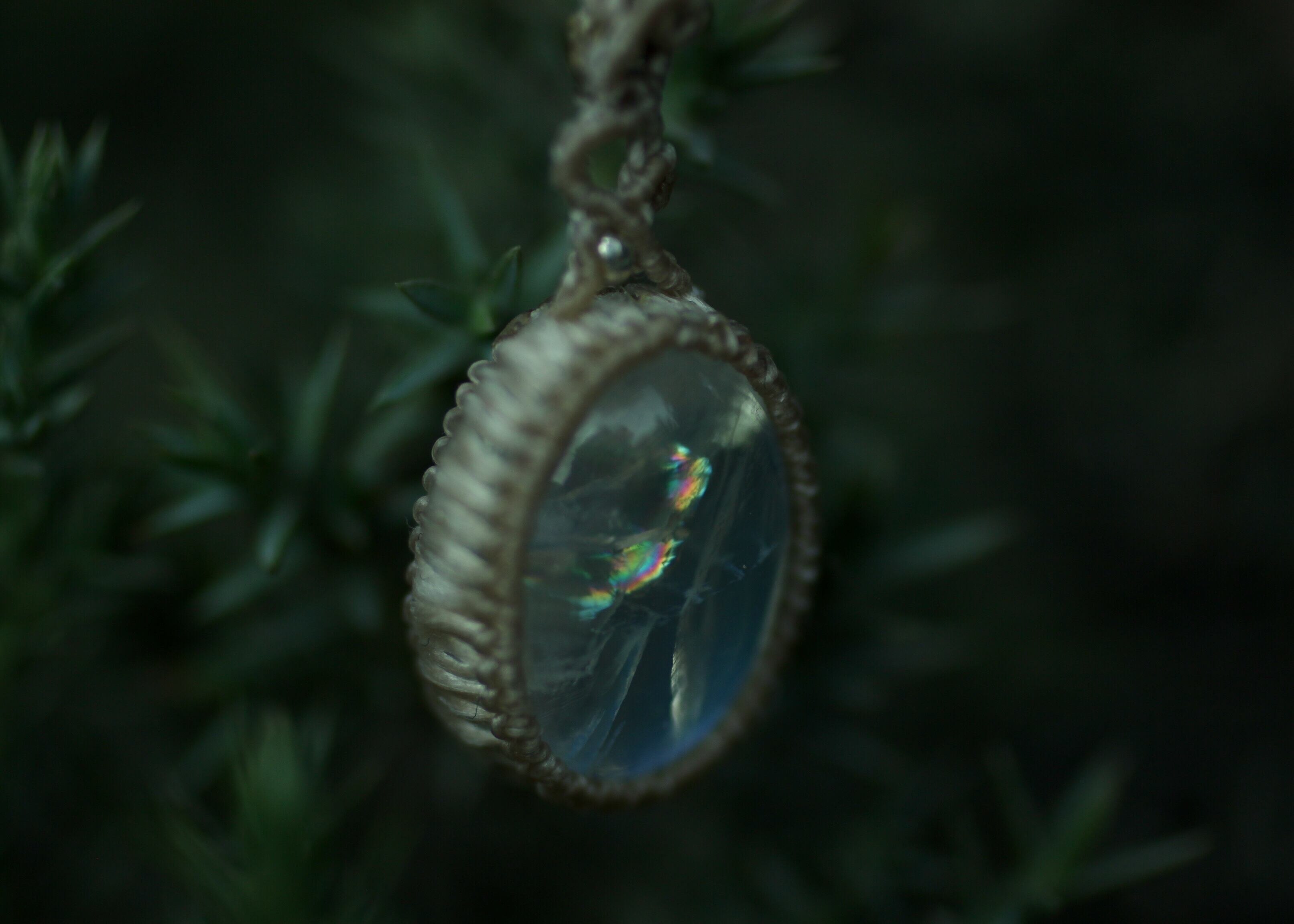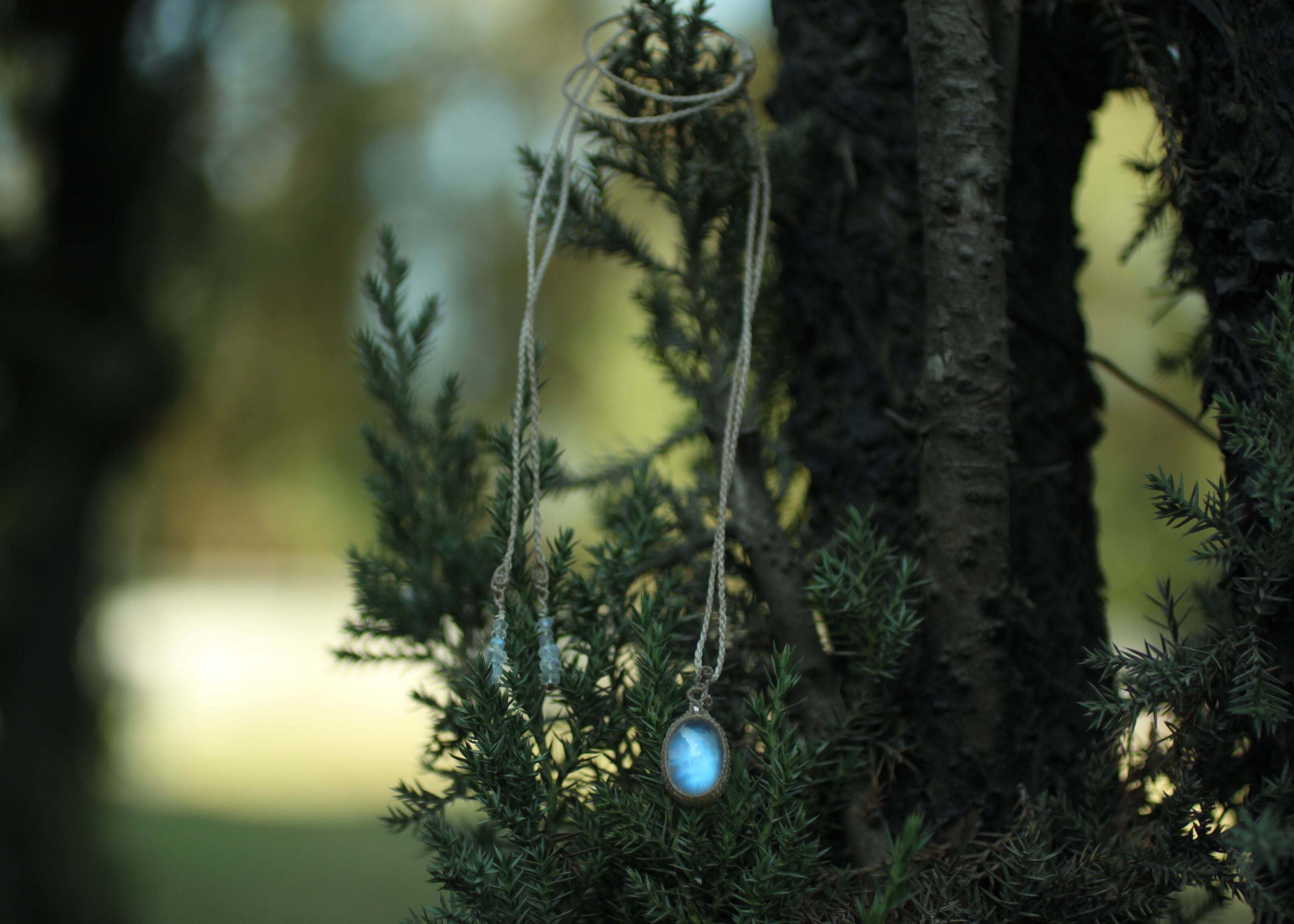 手縫い糸ほどの細いコードを使い出来る限り天然石の表情と繊細な仕上がりを重視し時間をかけ丁寧に編みました。