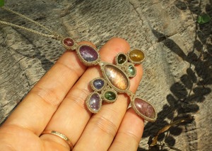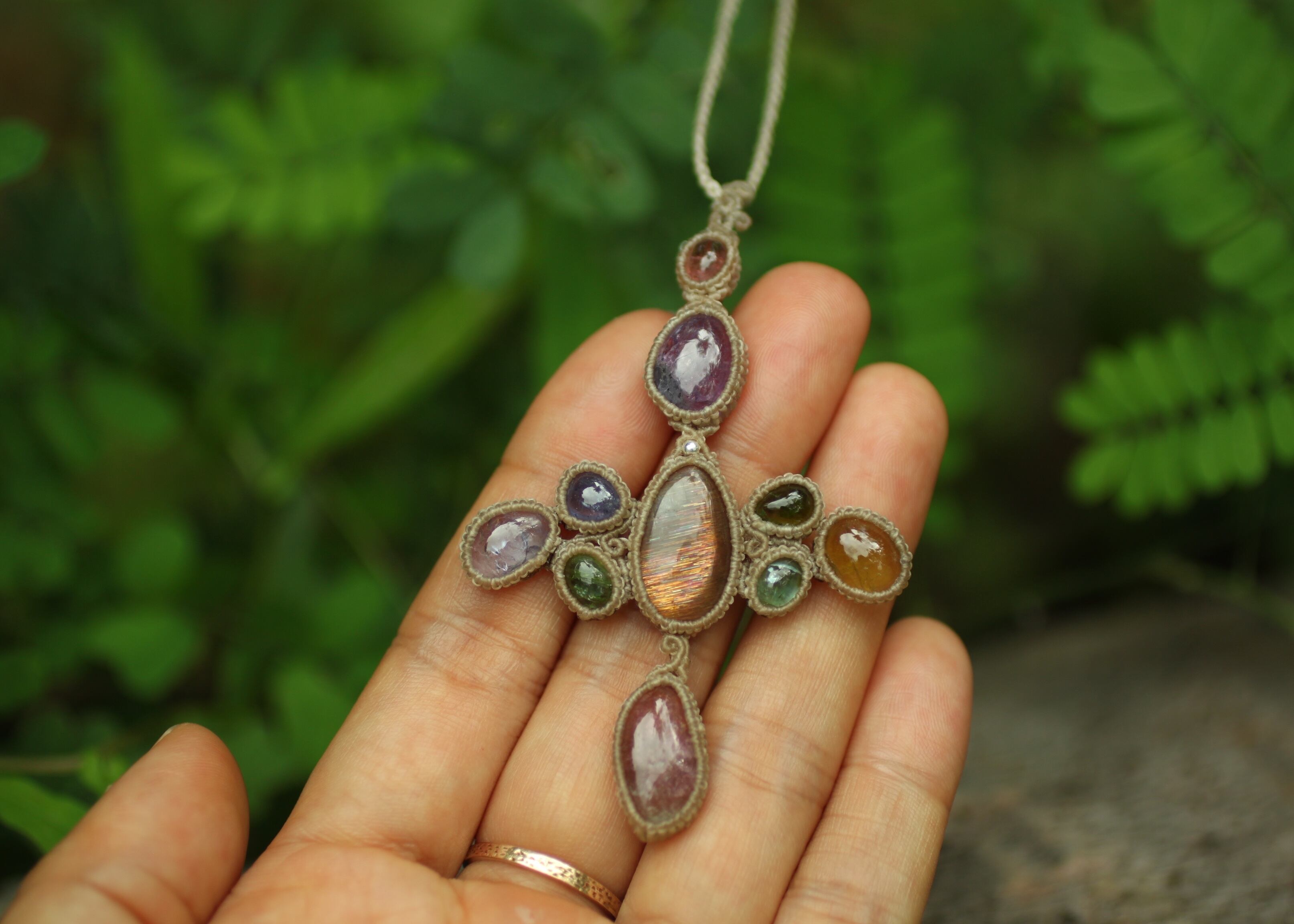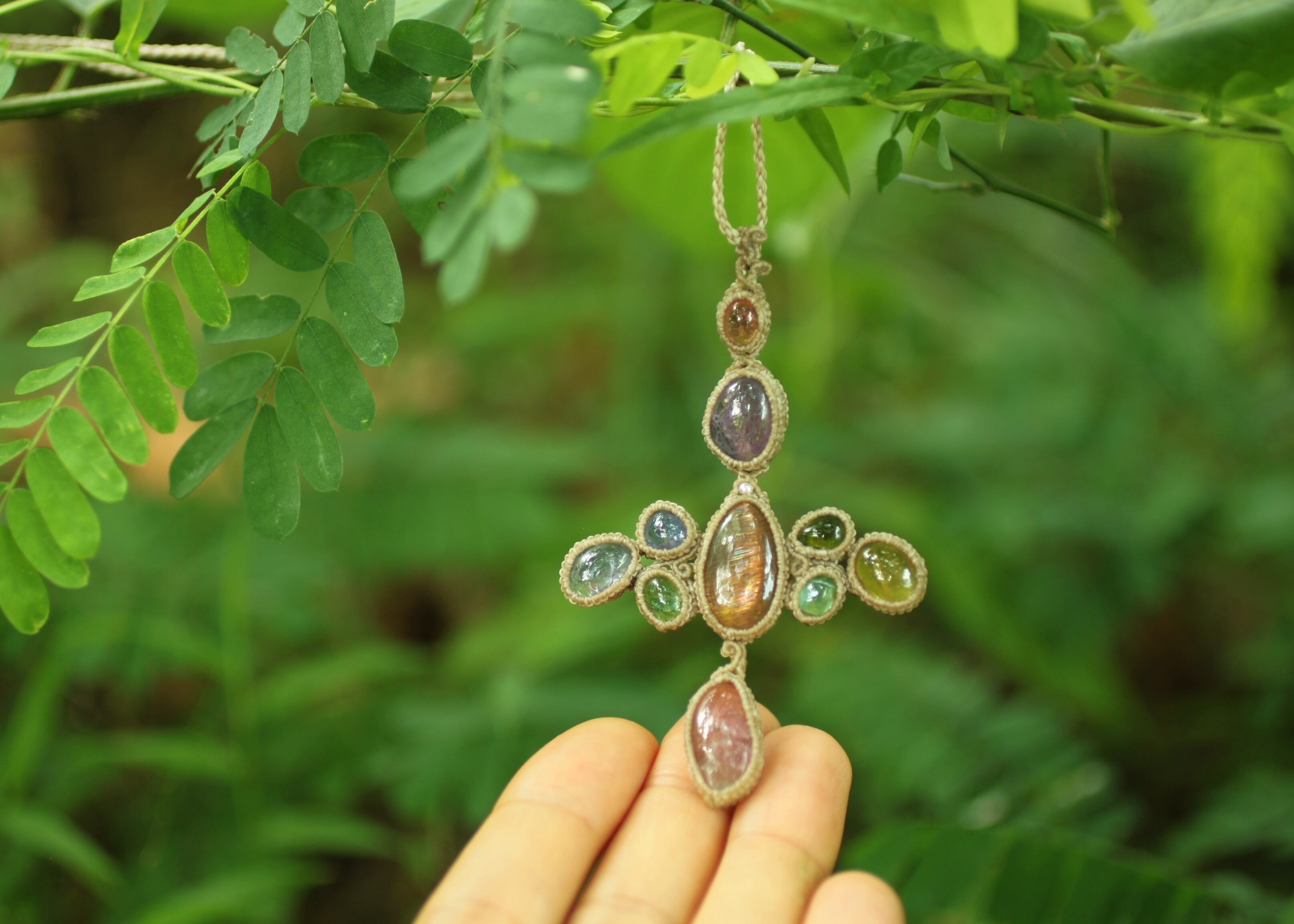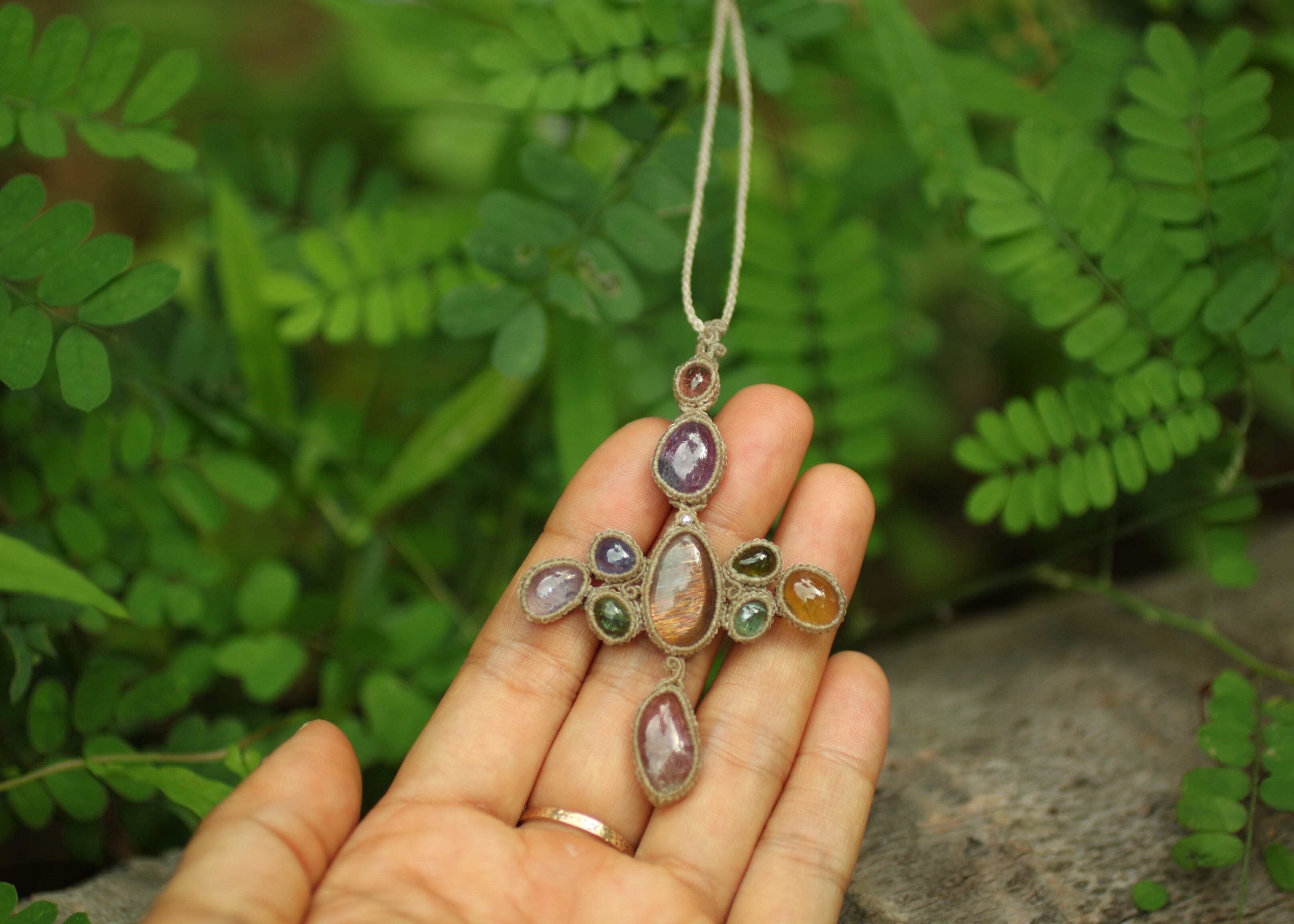 手縫い糸ほどの細いコードを使い出来る限り天然石の表情と繊細な仕上がりを重視し時間をかけ丁寧に編みました。