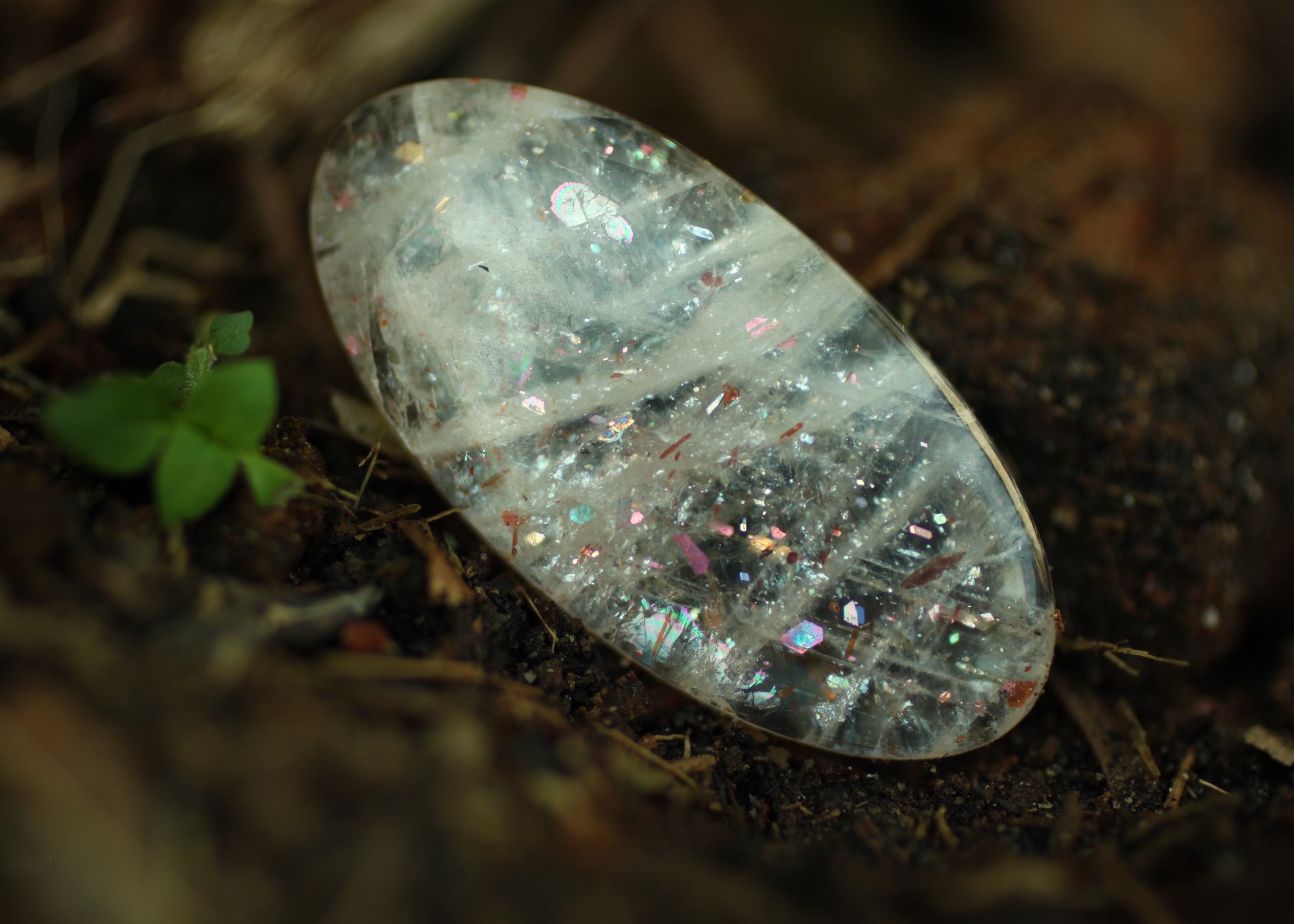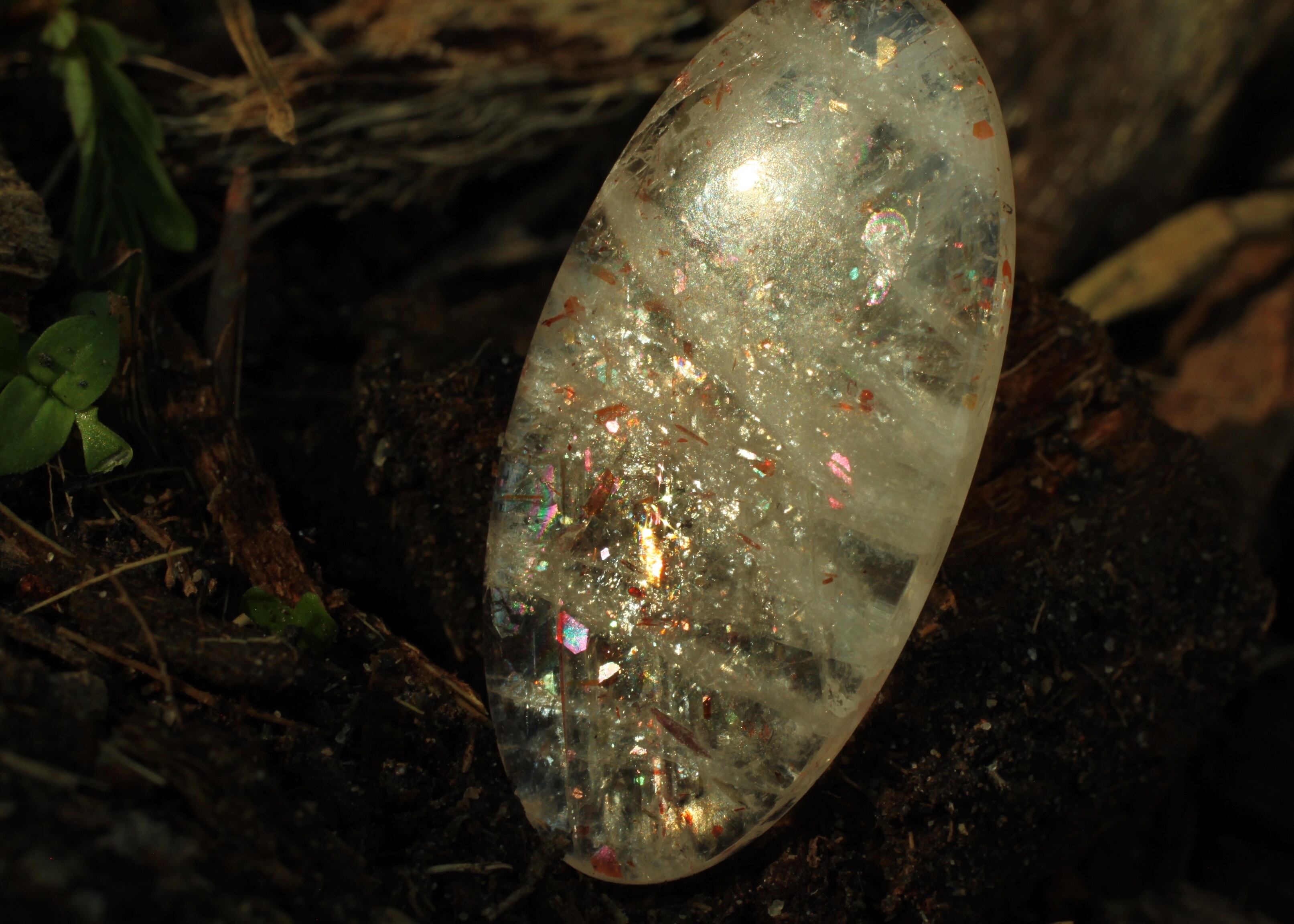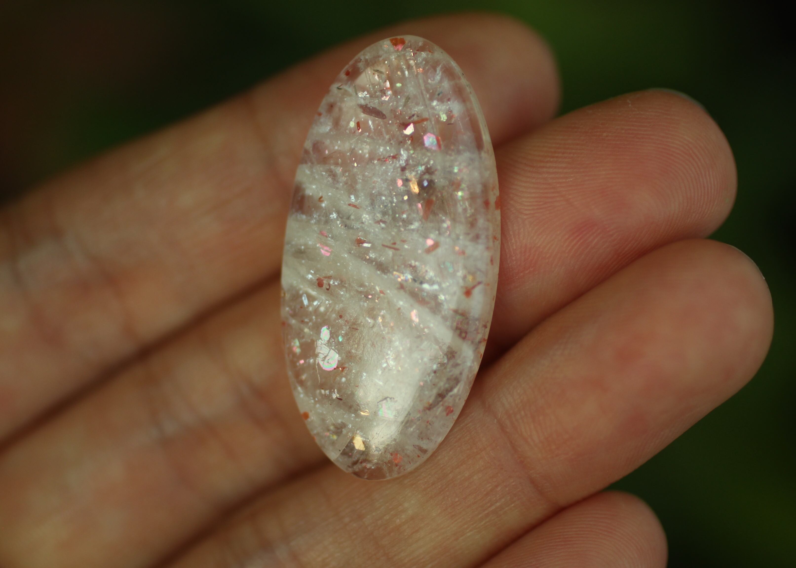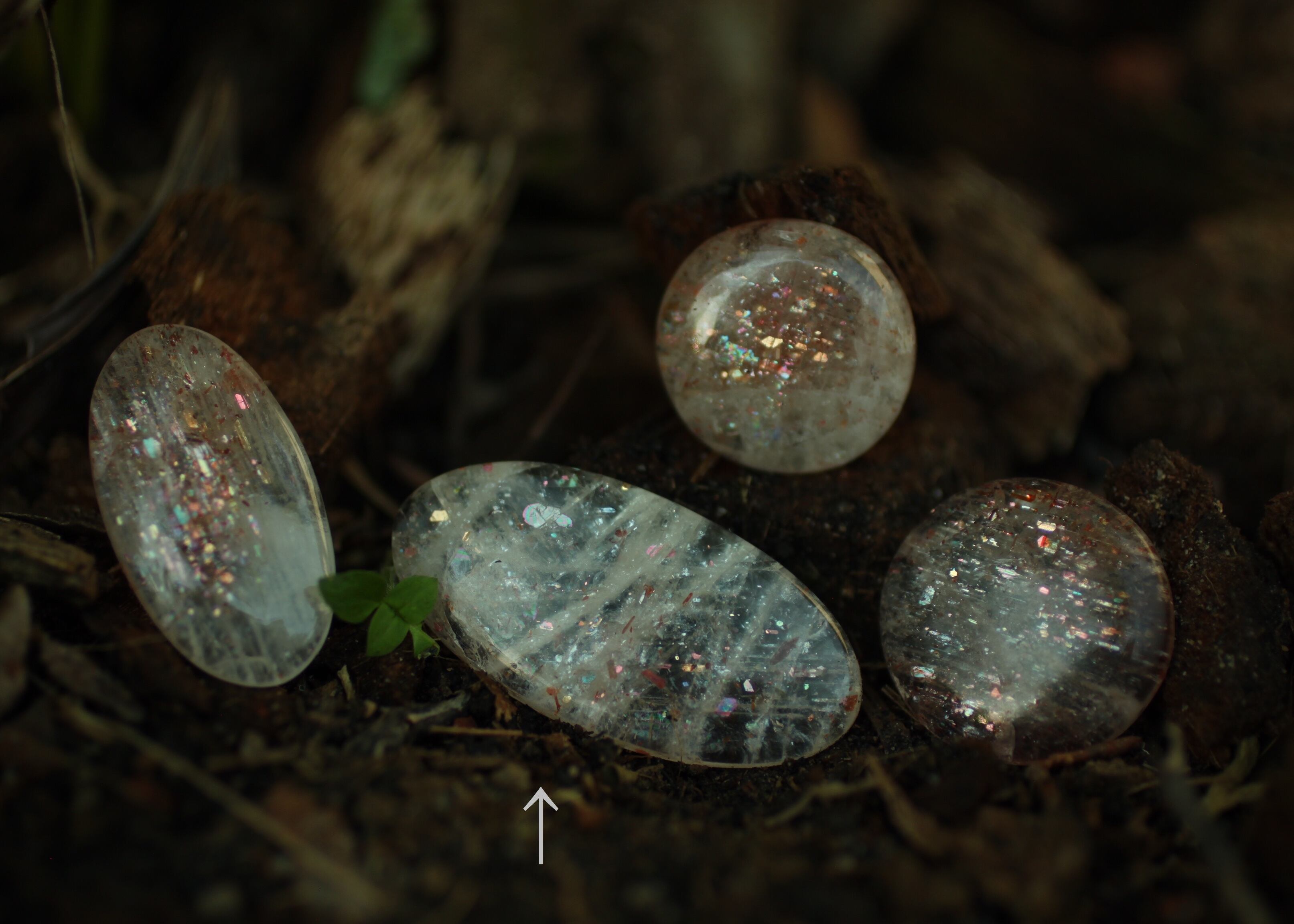 間隔をあけるように様々なタイプの虹色のラメが光るサンストーン