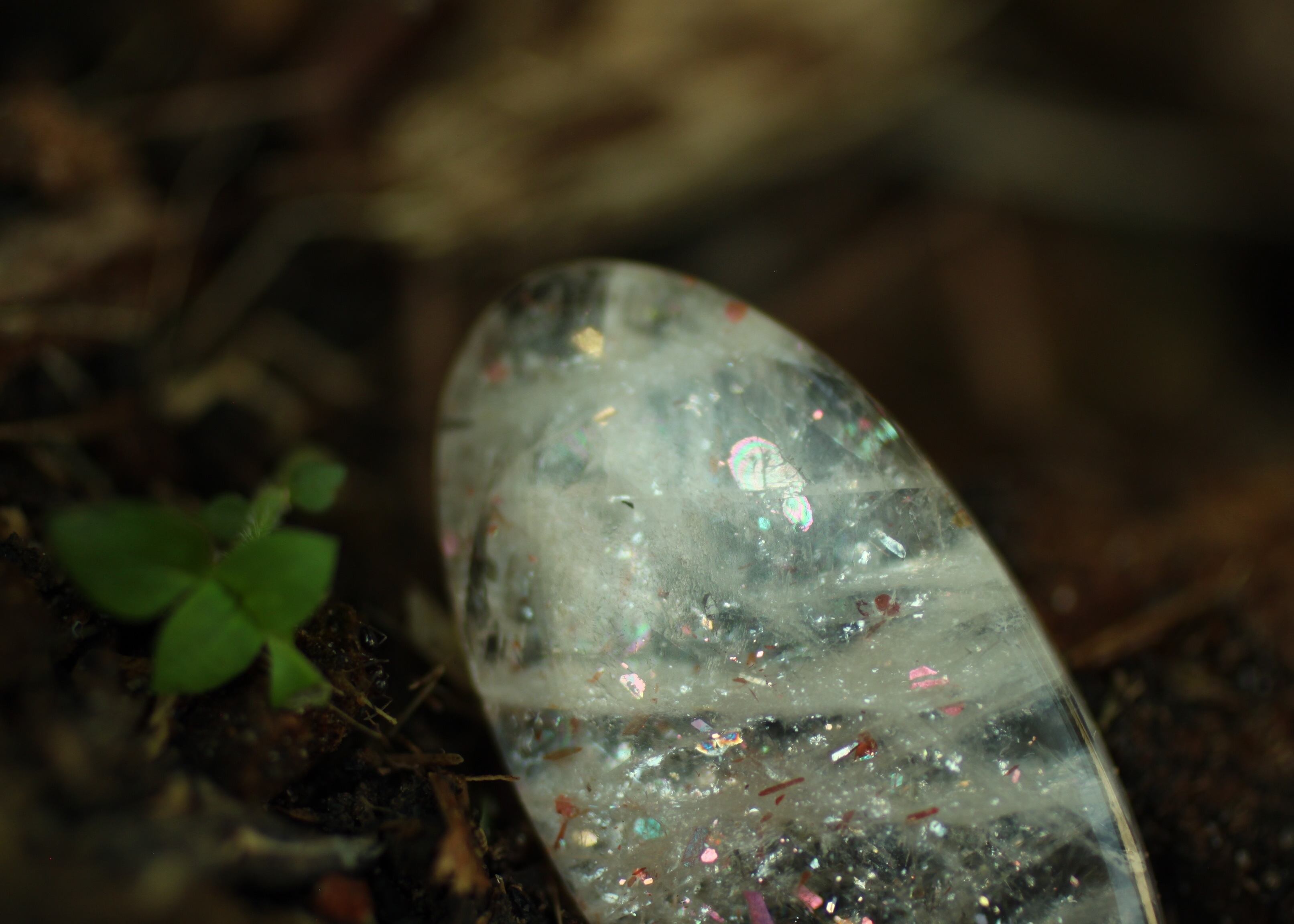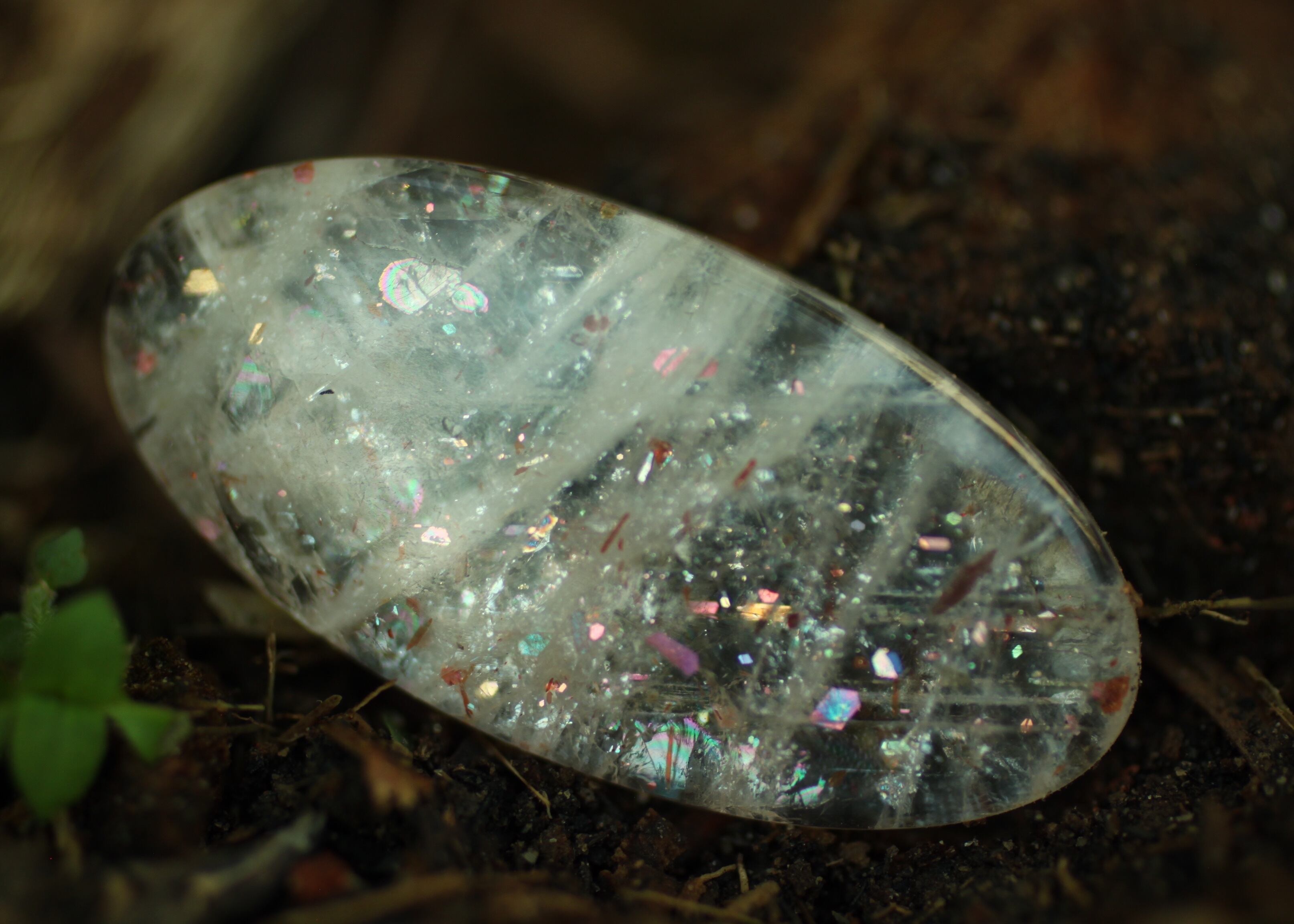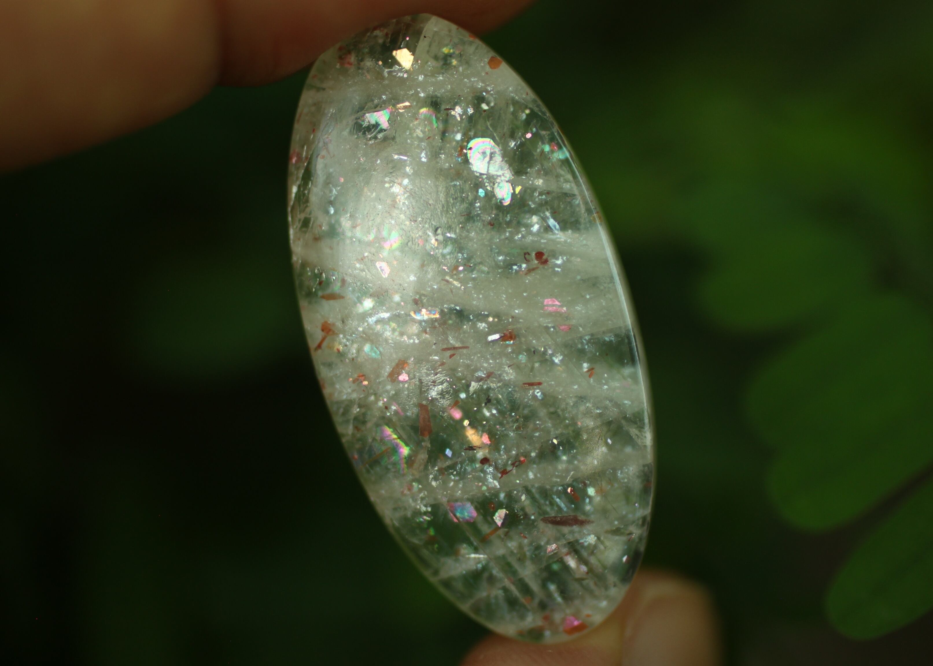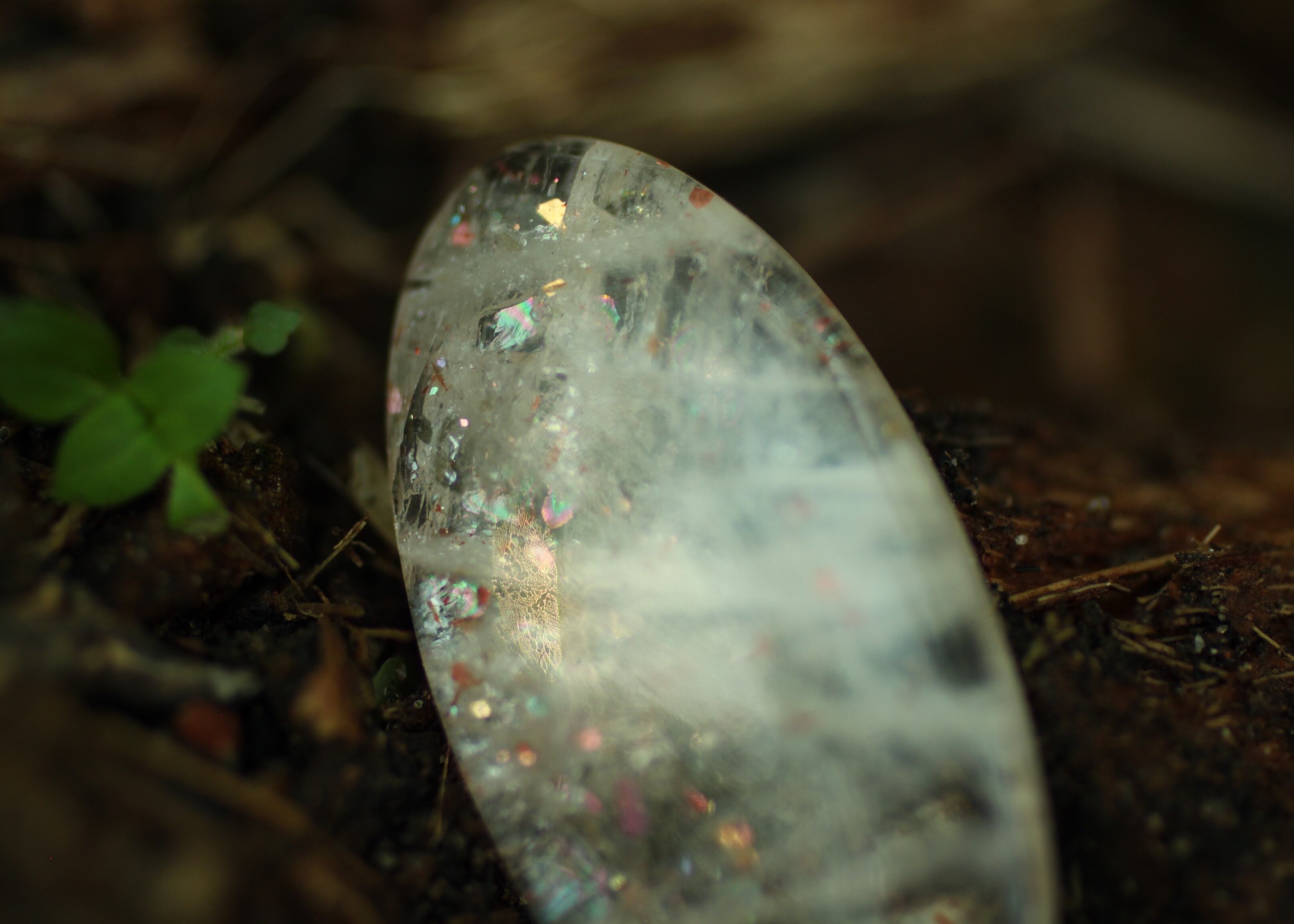 間隔をあけるように様々なタイプの虹色のラメが光るサンストーン