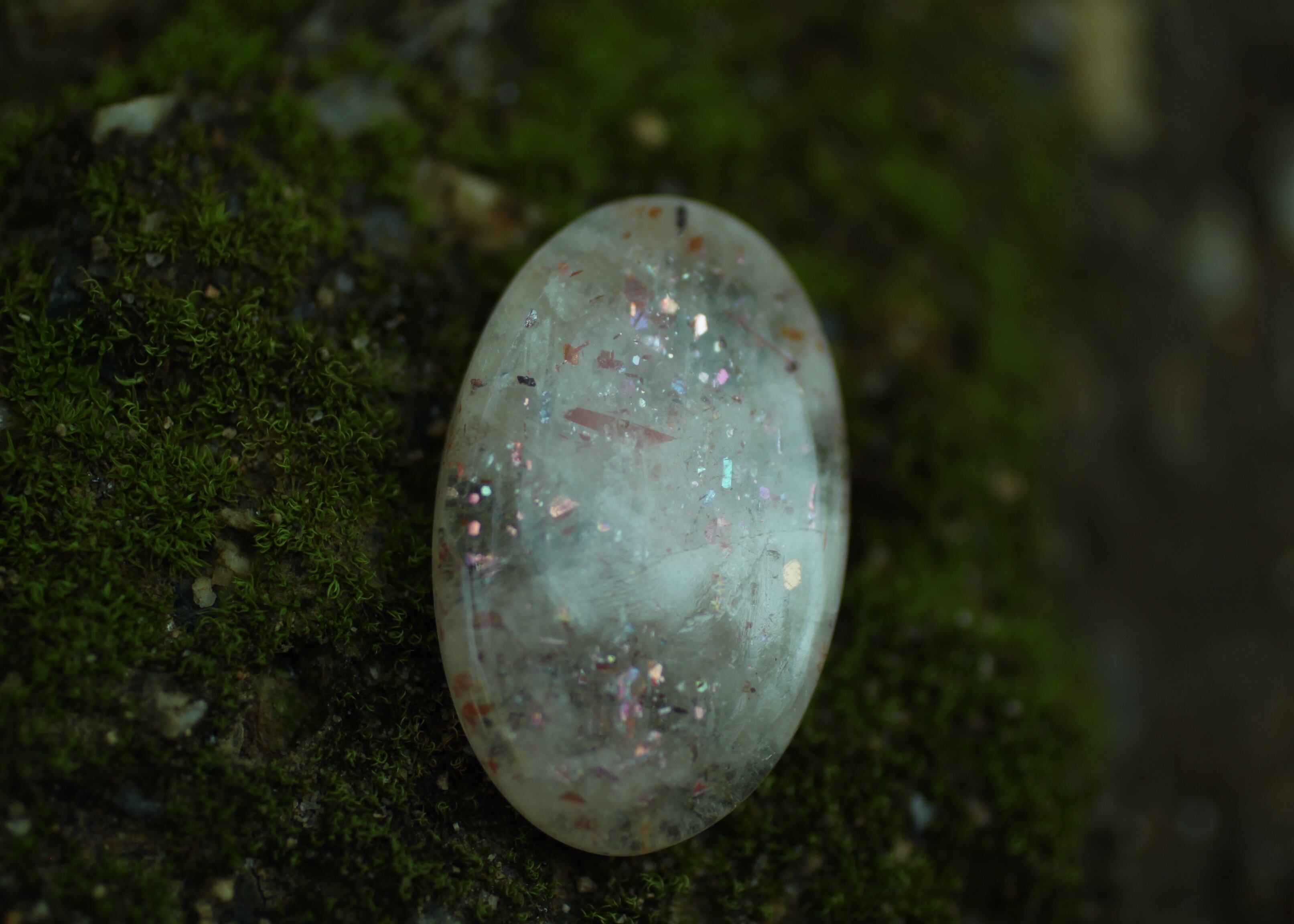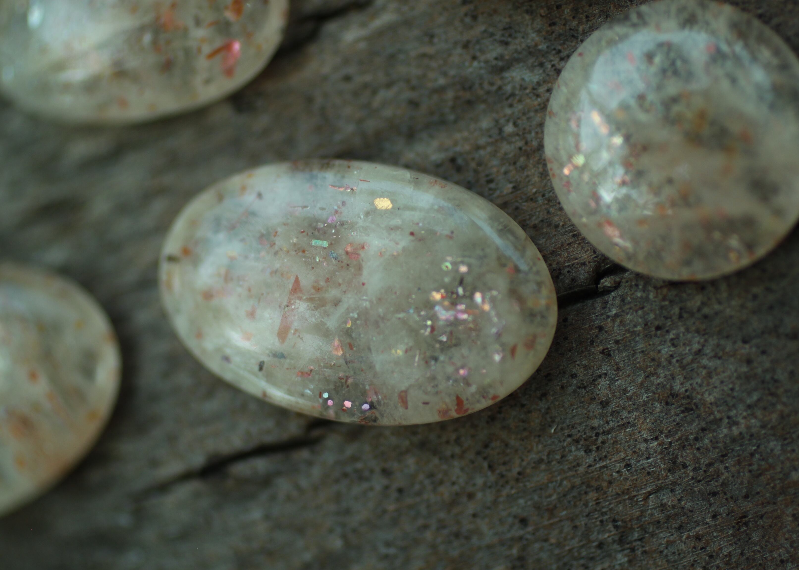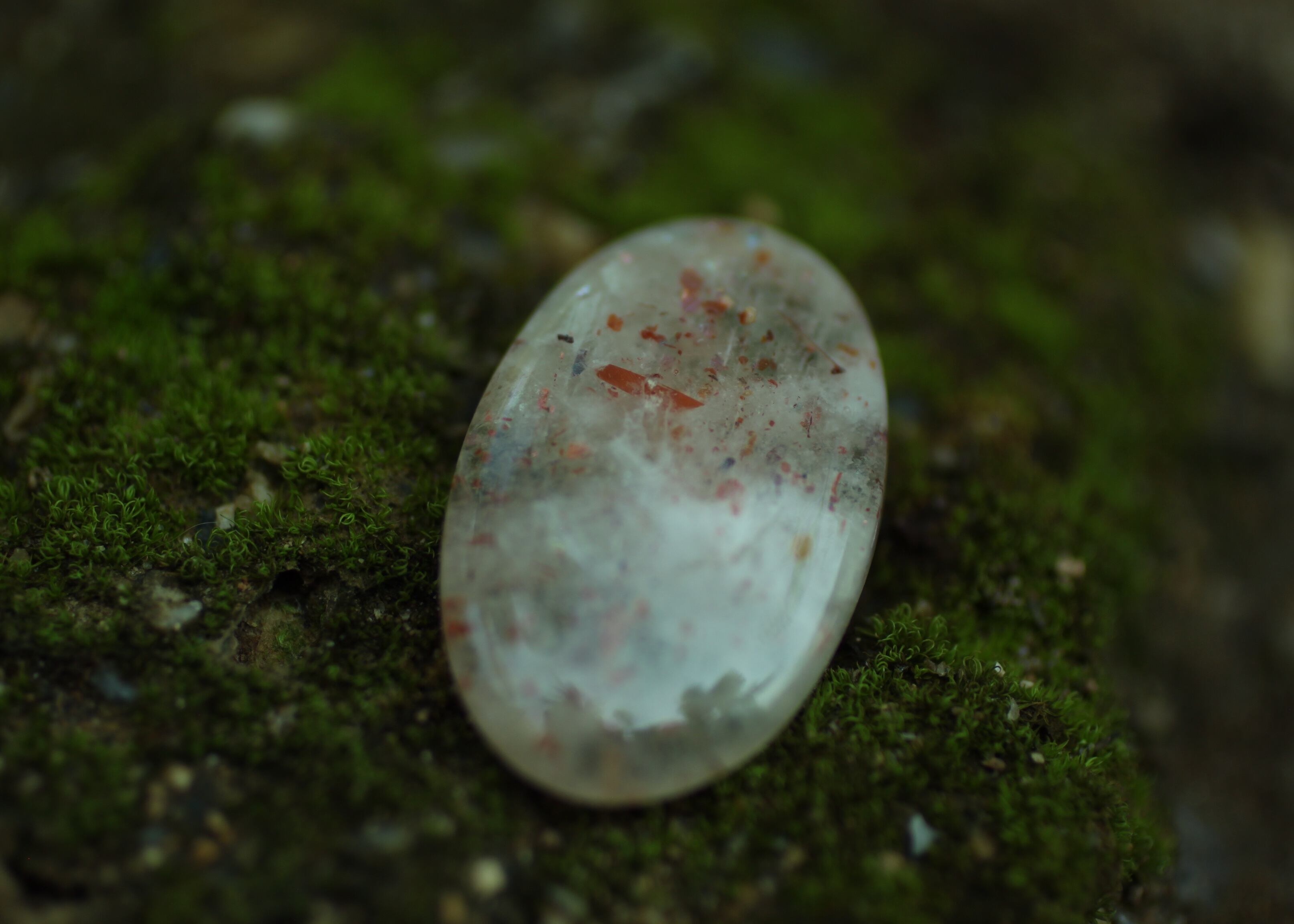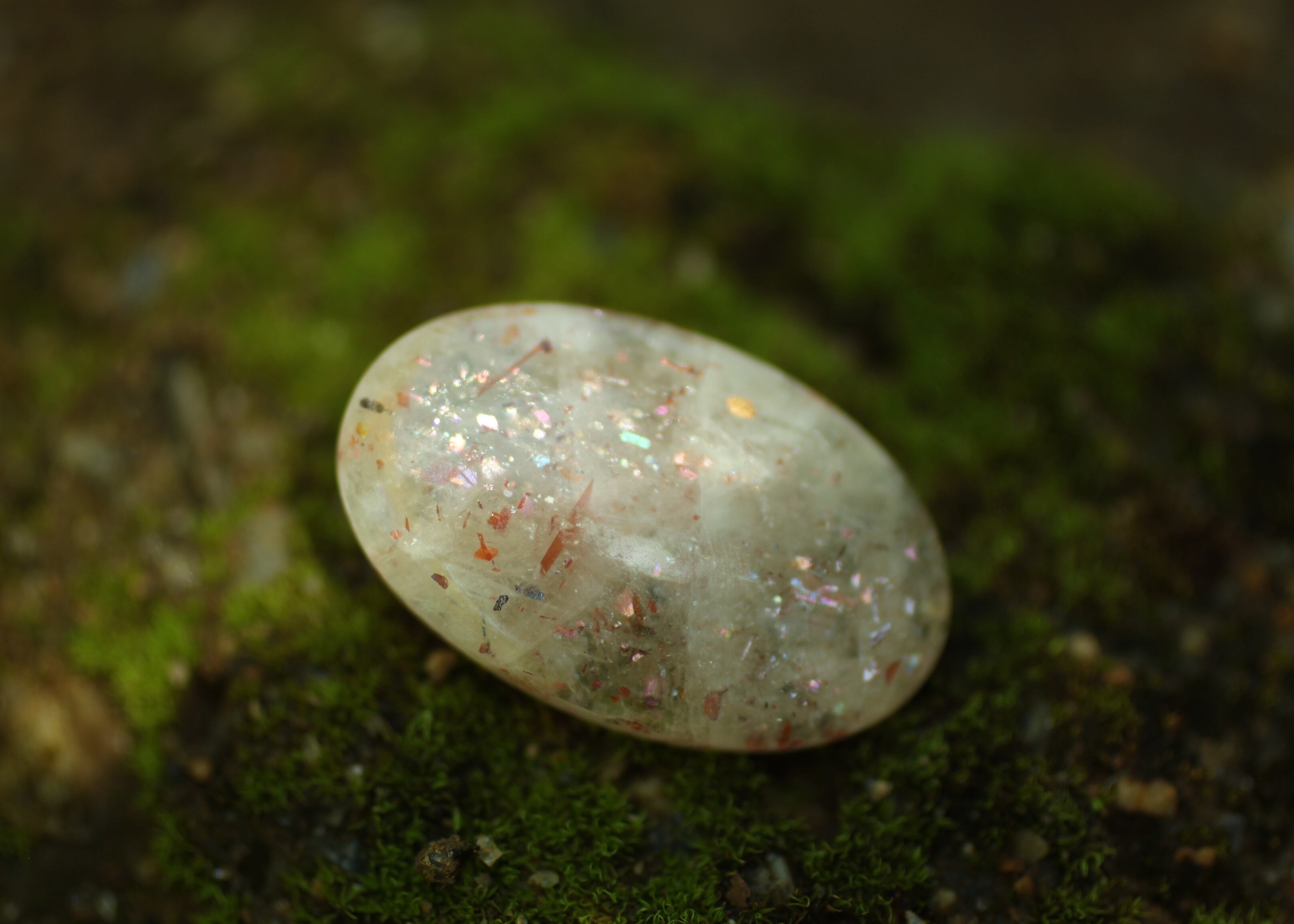白を基調に赤ピンクのラメが散りばめられた様子が可愛いサンストーンです。