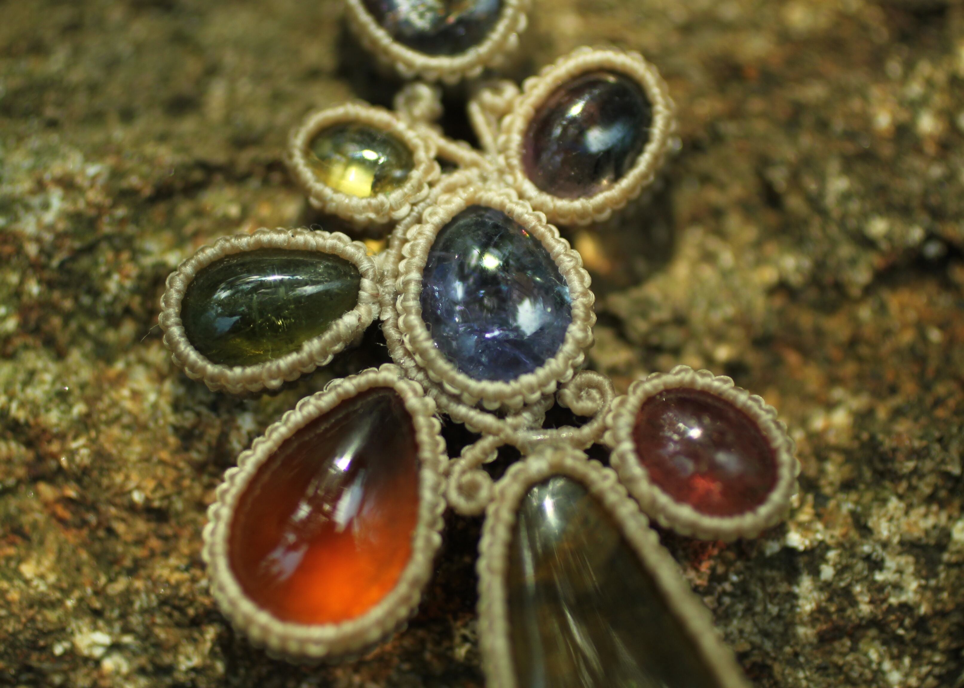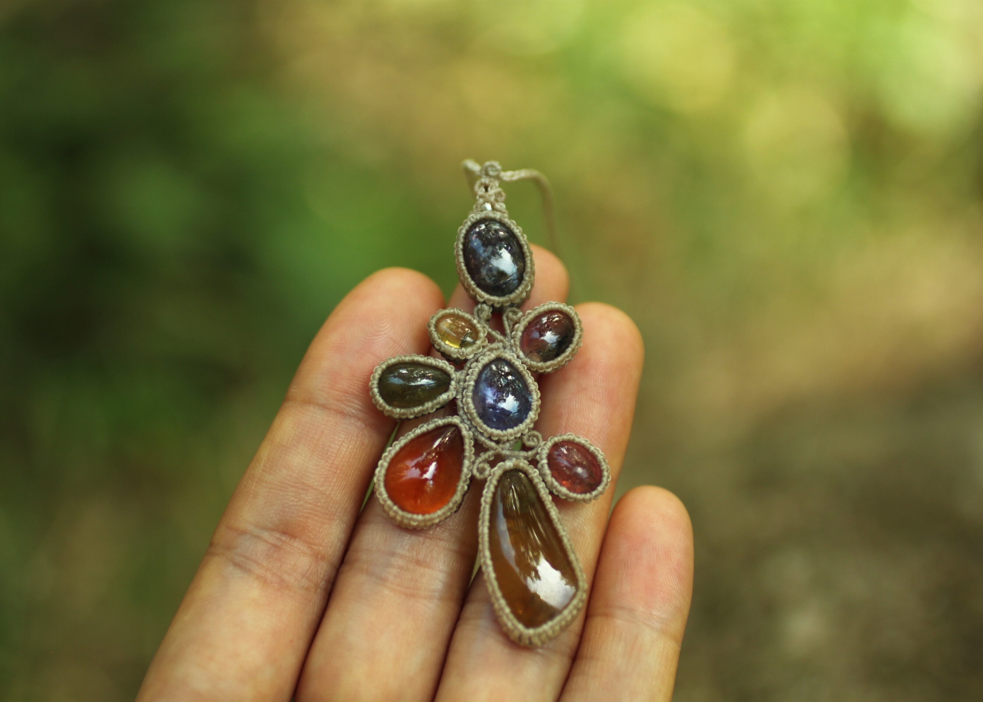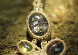 手縫い糸ほどの細いコードを使い出来る限り天然石の表情と繊細な仕上がりを重視し時間をかけ丁寧に編みました。