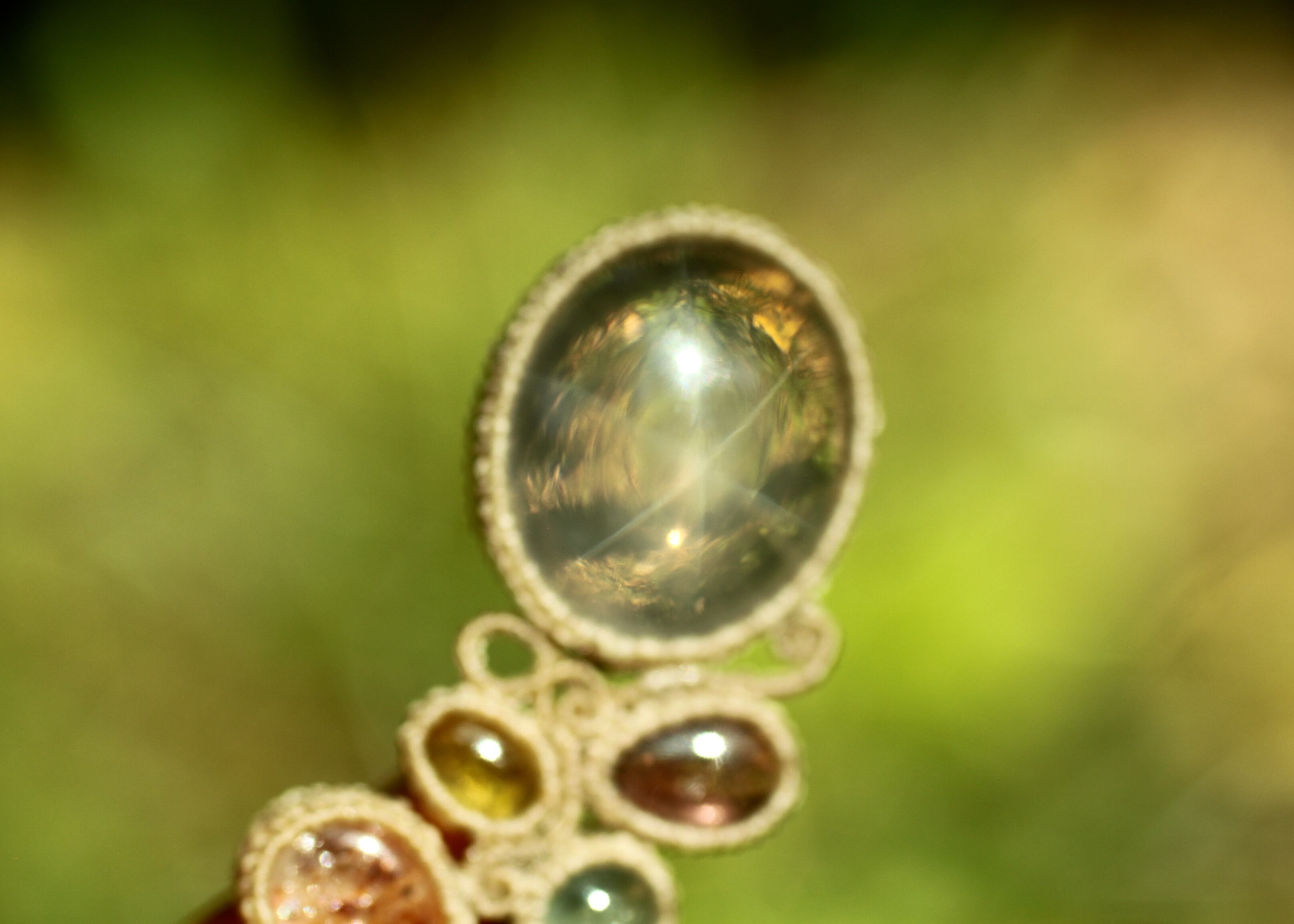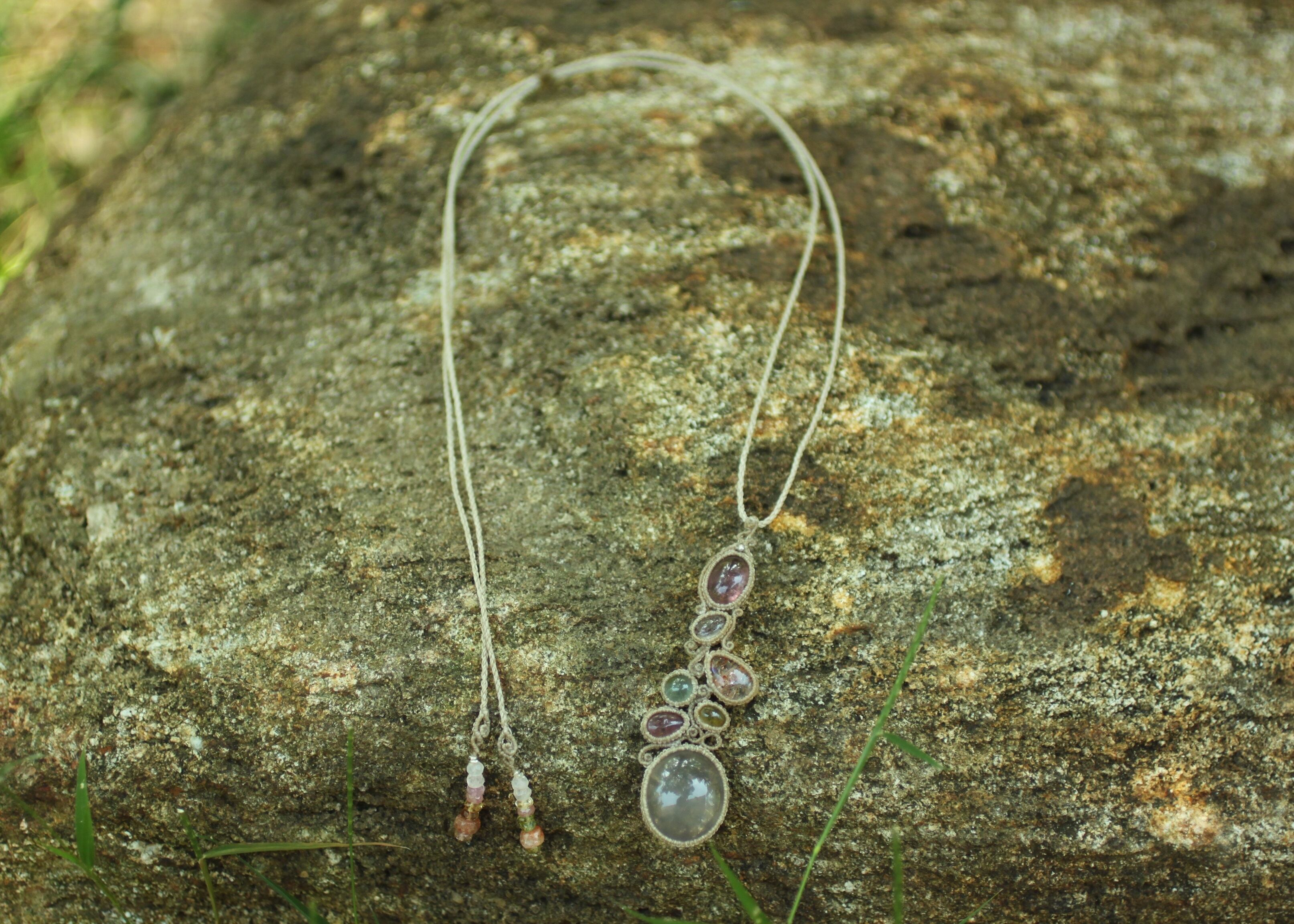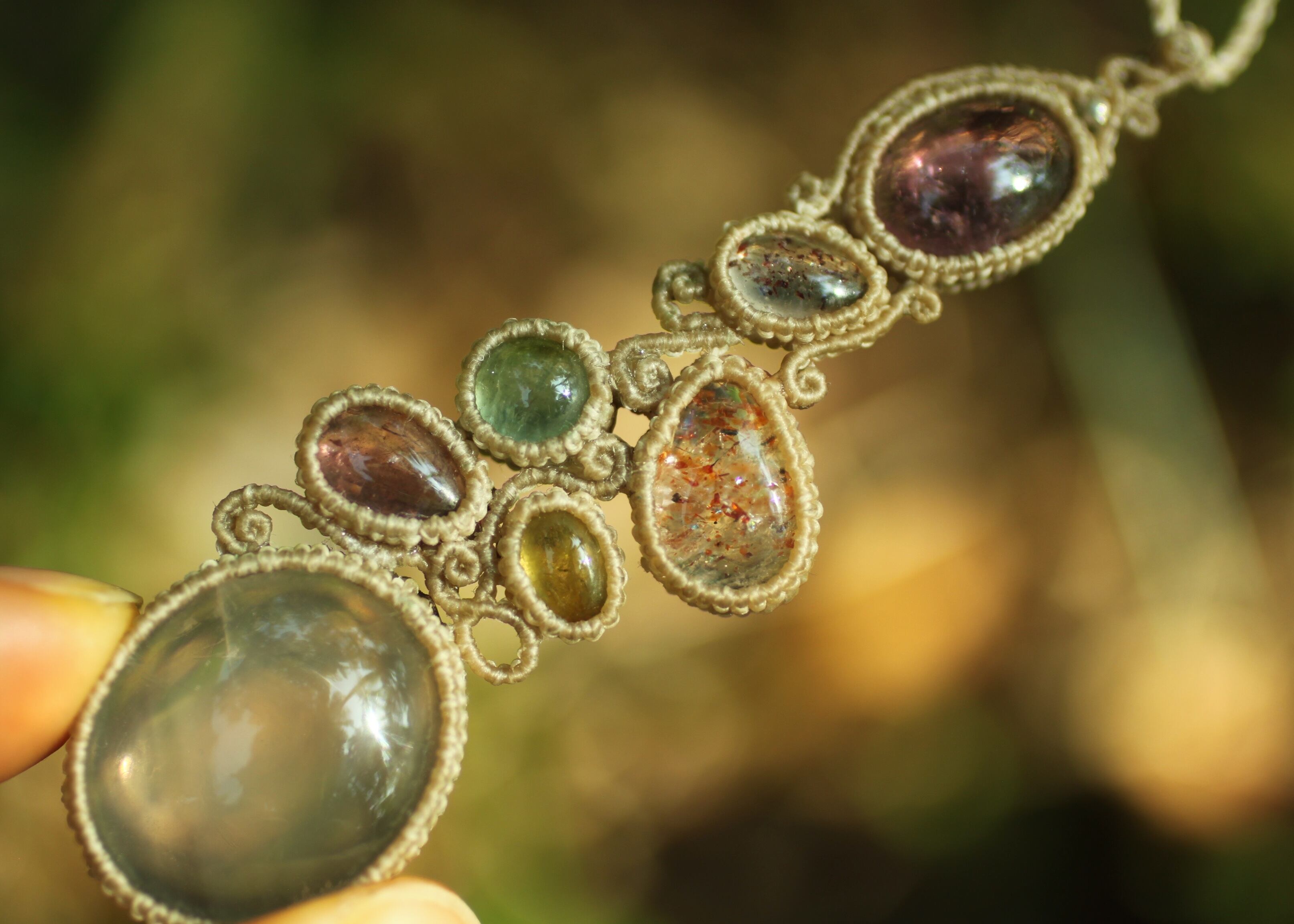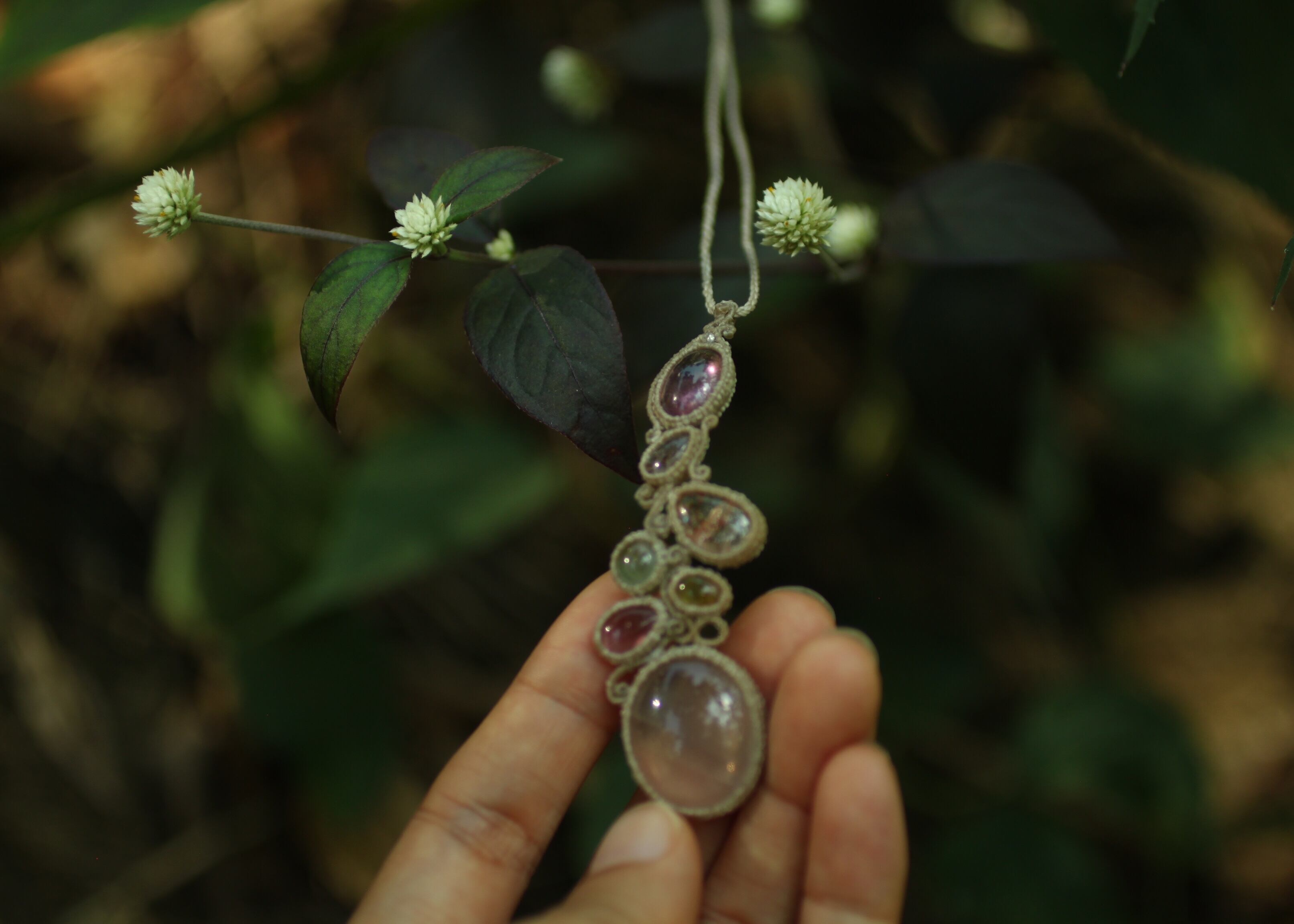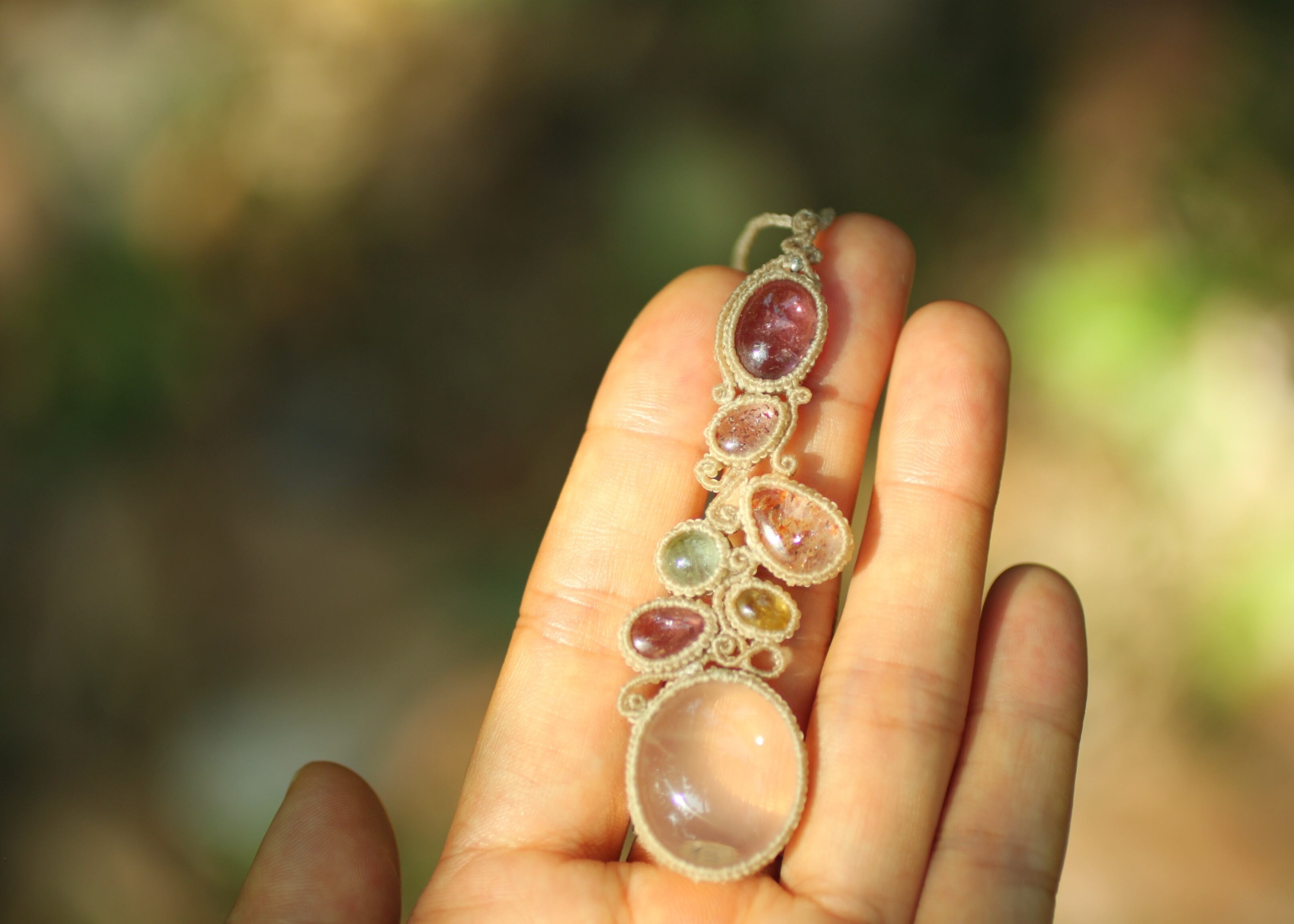 手縫い糸ほどの細いコードを使い出来る限り天然石の表情と繊細な仕上がりを重視し時間をかけ丁寧に編みました。