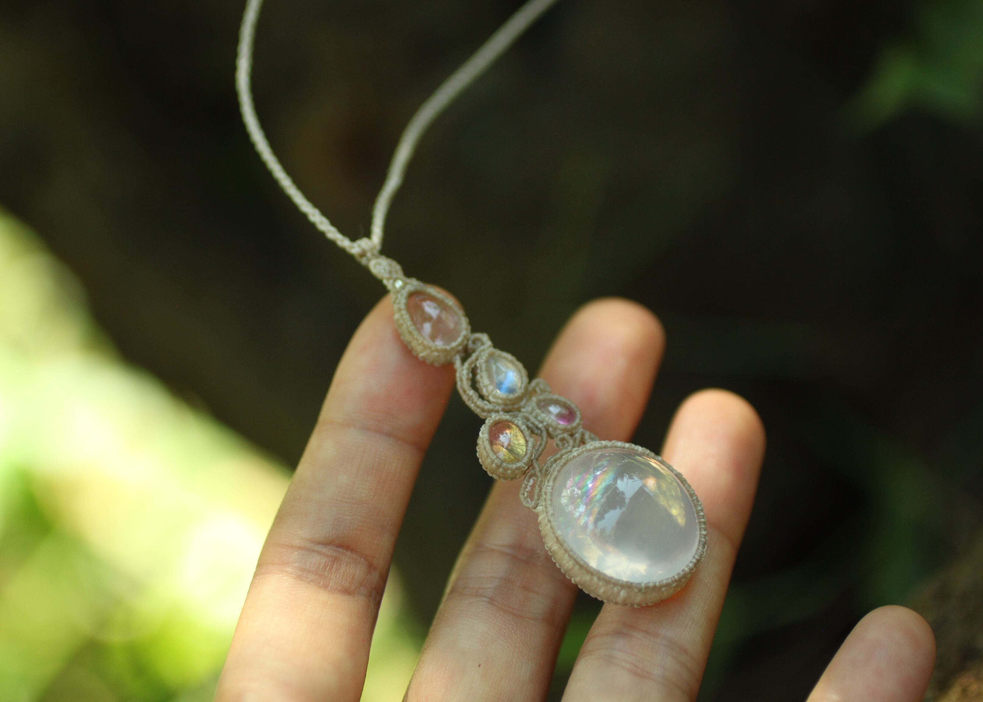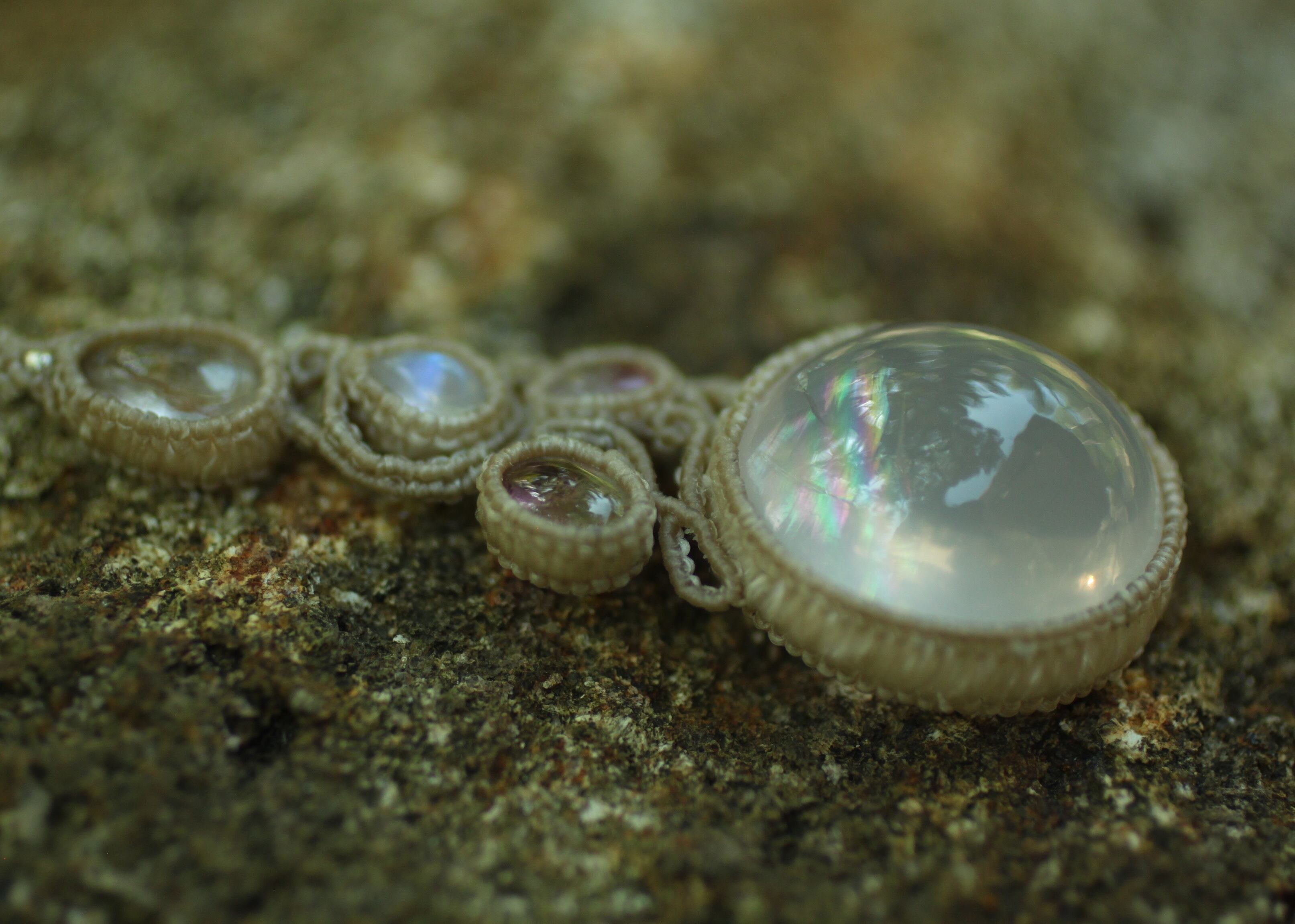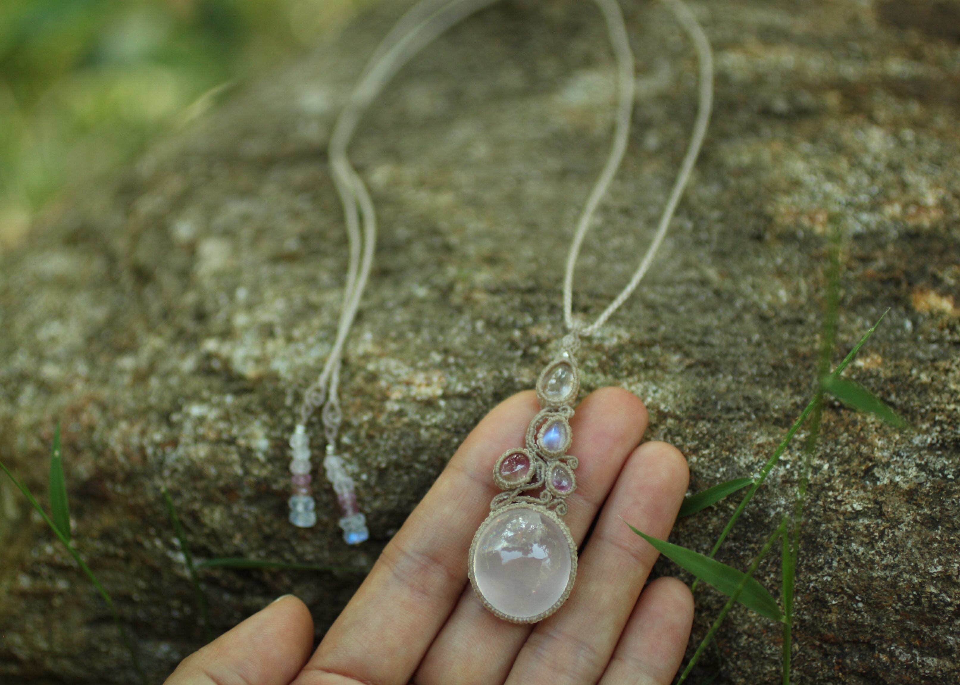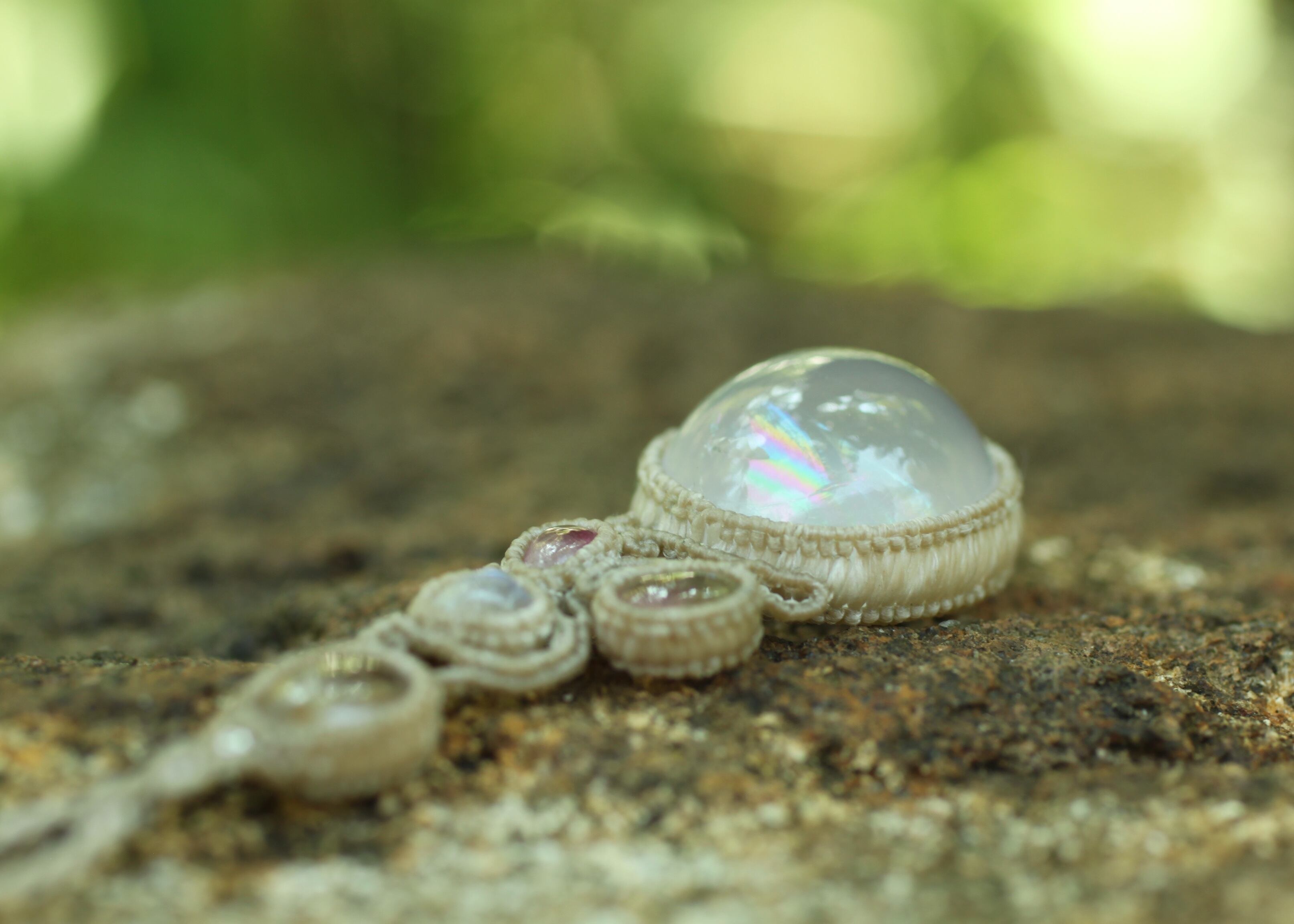 手縫い糸ほどの細いコードを使い出来る限り天然石の表情と繊細な仕上がりを重視し時間をかけ丁寧に編みました。