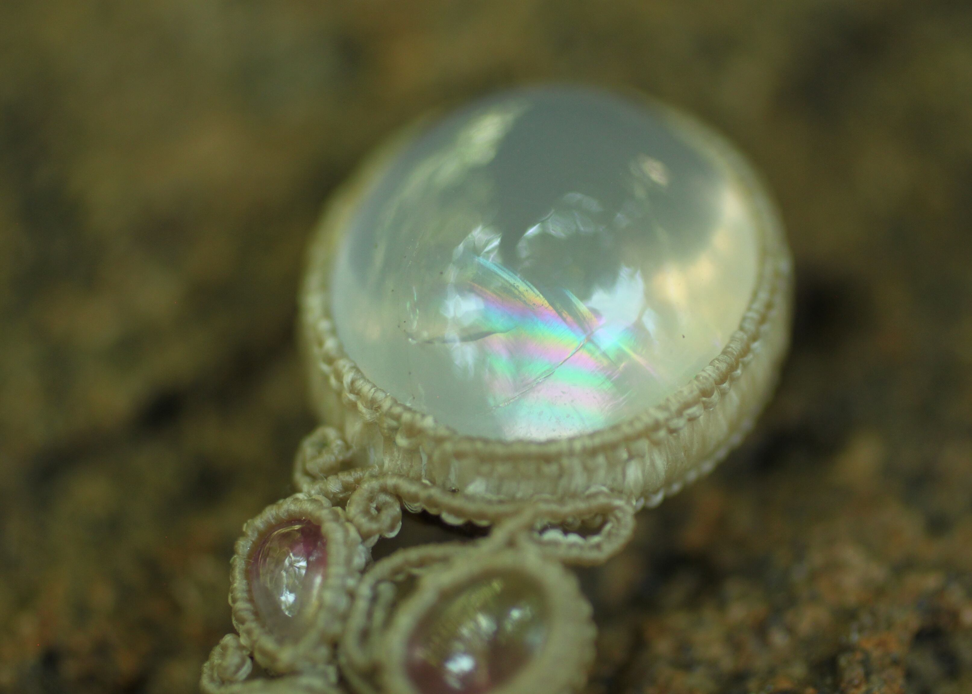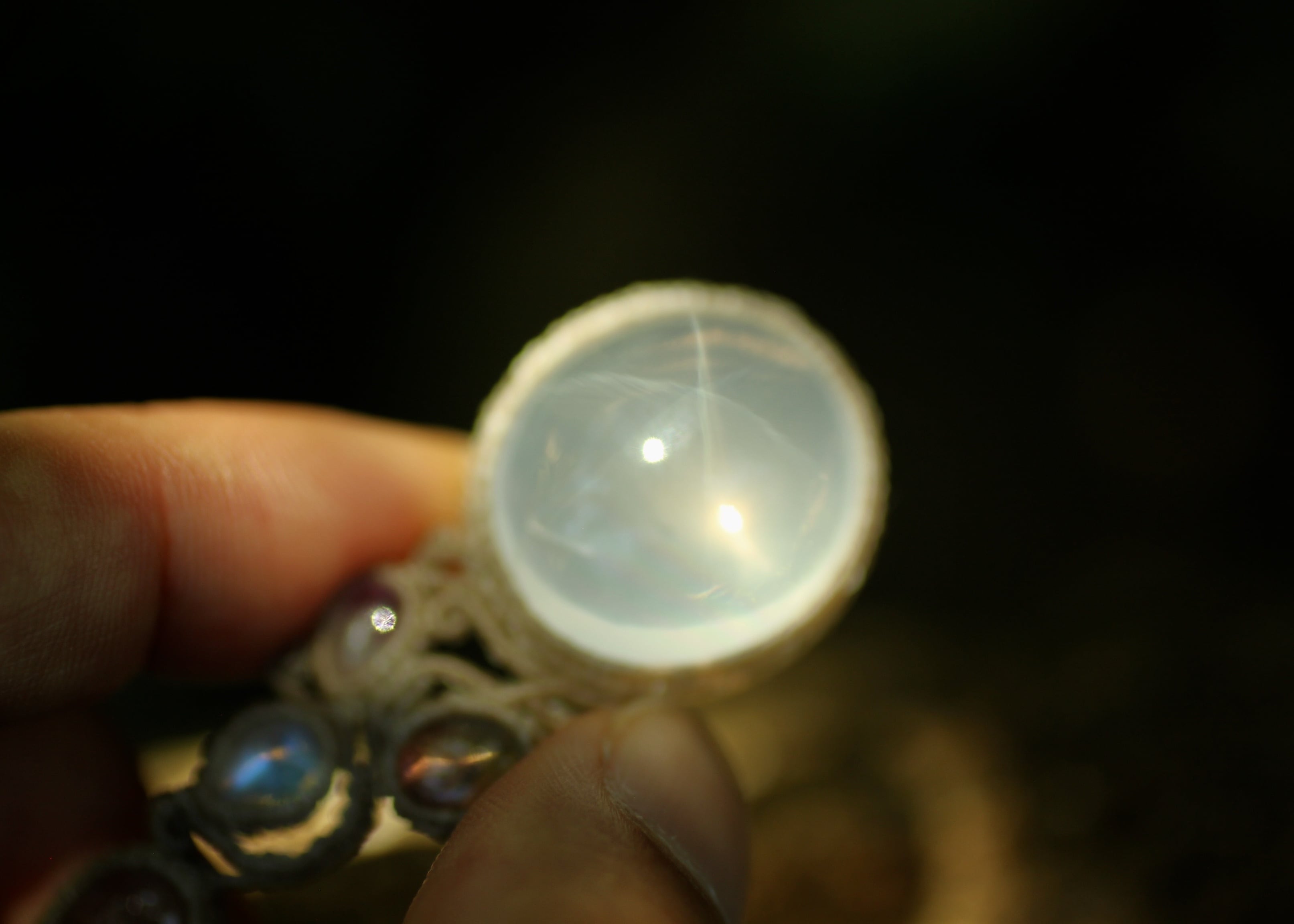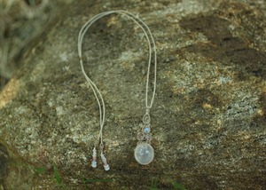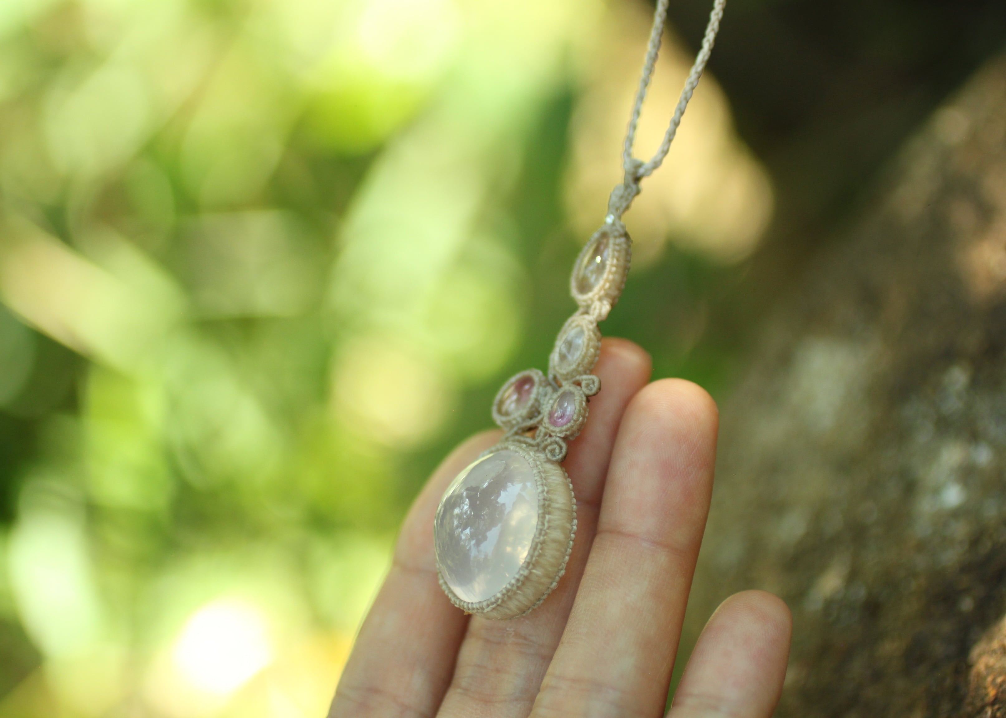 手縫い糸ほどの細いコードを使い出来る限り天然石の表情と繊細な仕上がりを重視し時間をかけ丁寧に編みました。