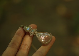 手縫い糸ほどの細いコードを使い出来る限り天然石の表情と繊細な仕上がりを重視し時間をかけ丁寧に編みました。