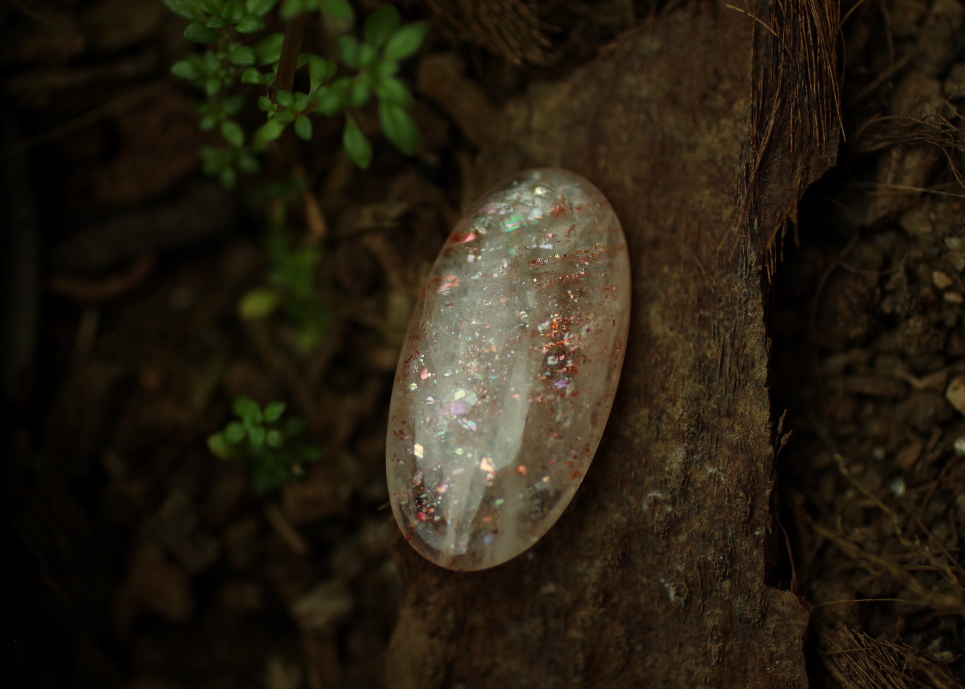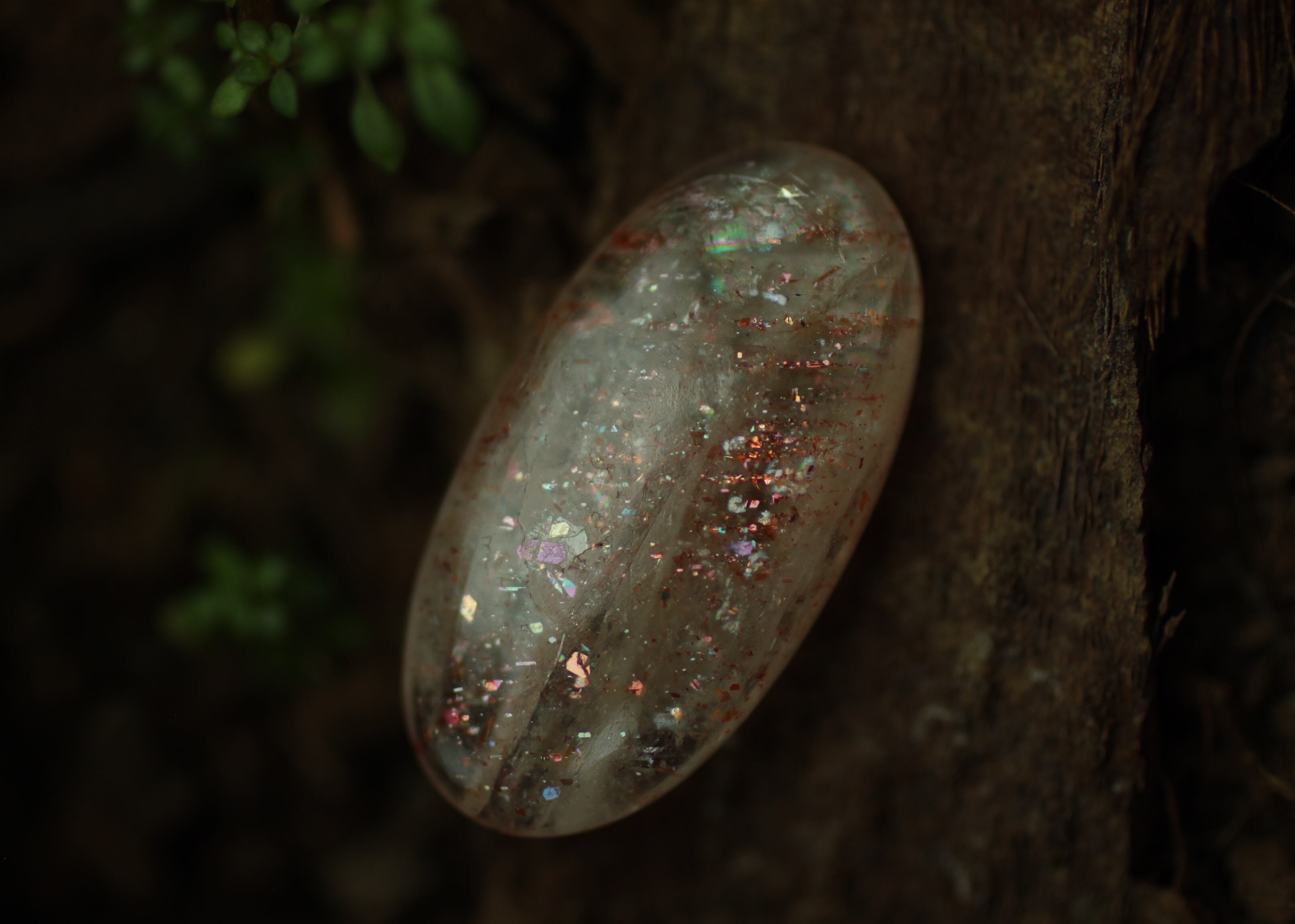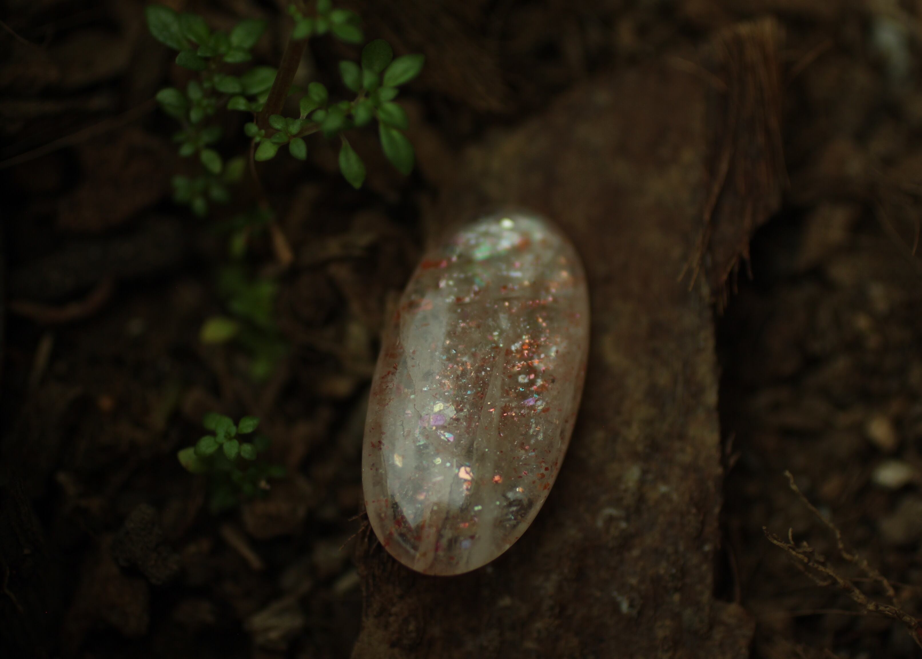 隠れていたミクロの白銀の内包物がキラキラと虹色のラメと重なるように光り