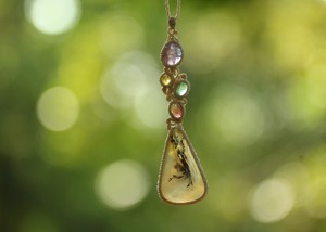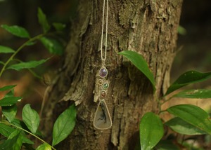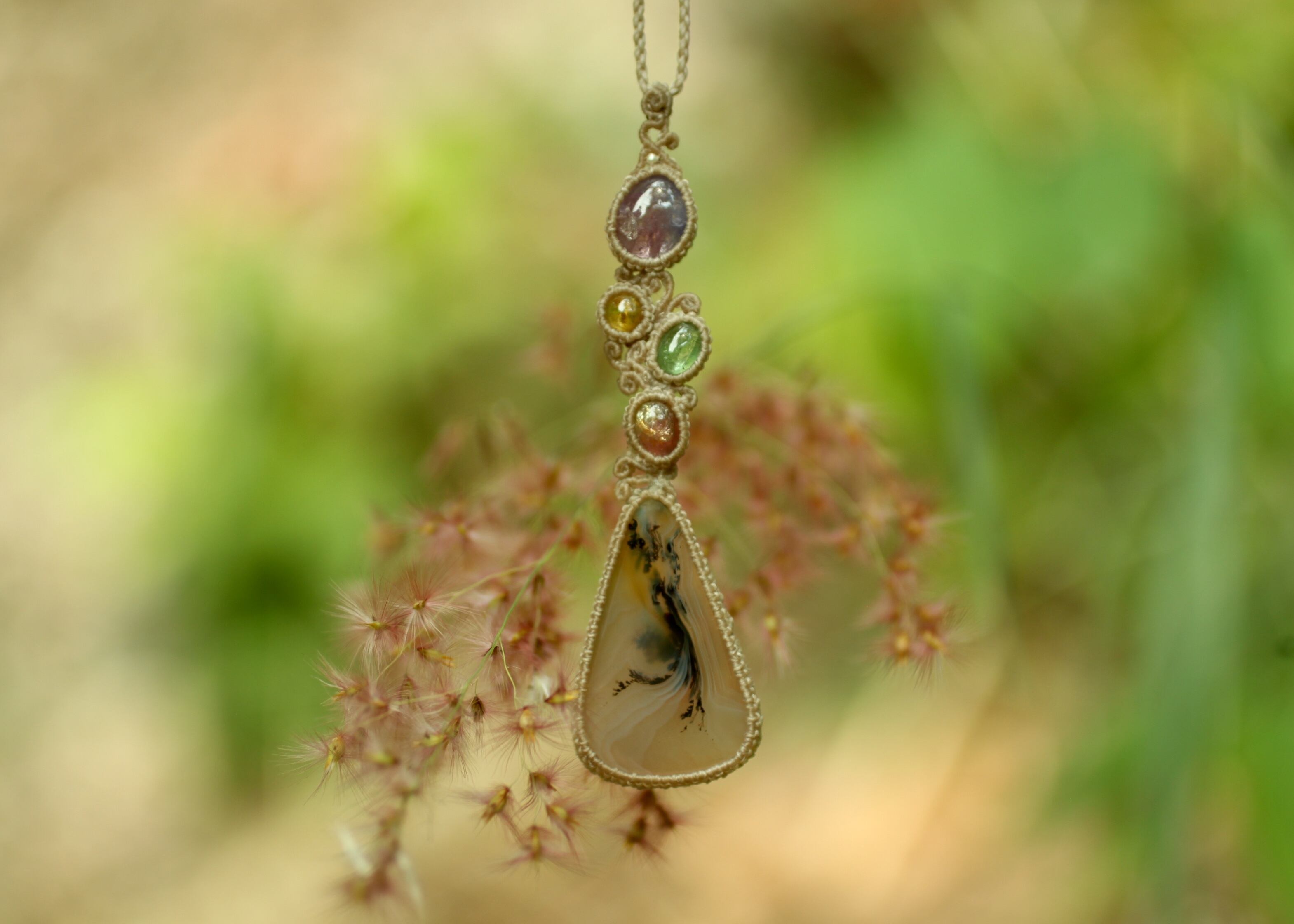 デンドリティックアゲートの上には花をイメージして色とりどりの天然石をあしらいました。