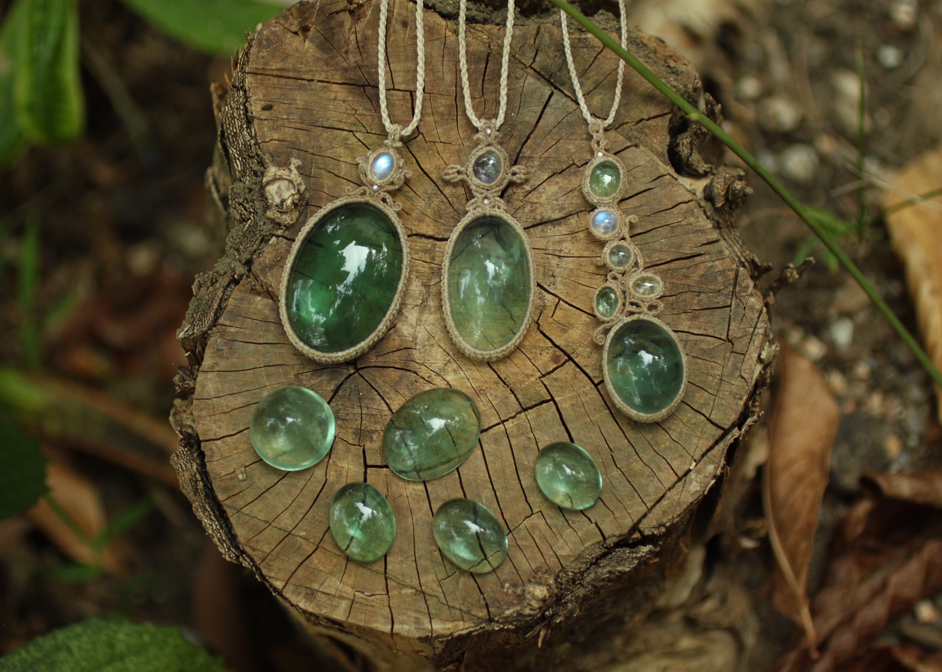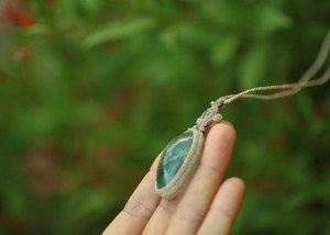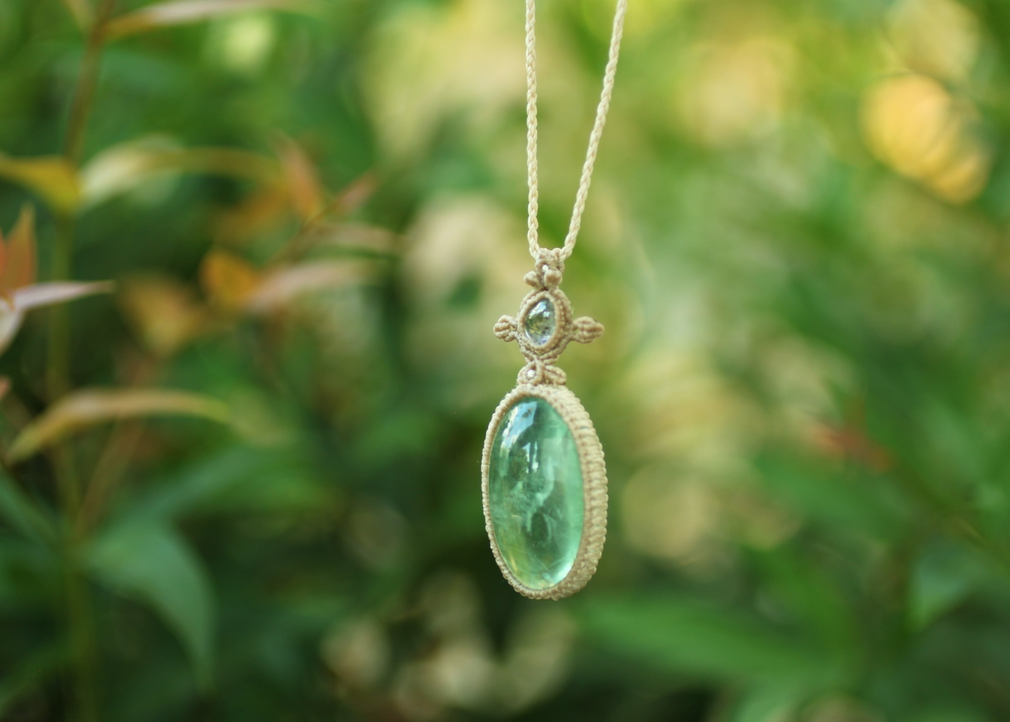 ※ マクラメ編み装飾は、手縫い糸ほどの細いコードを使い出来る限り天然石の表情と繊細な仕上がりを重視し時間をかけ丁寧に編みました。