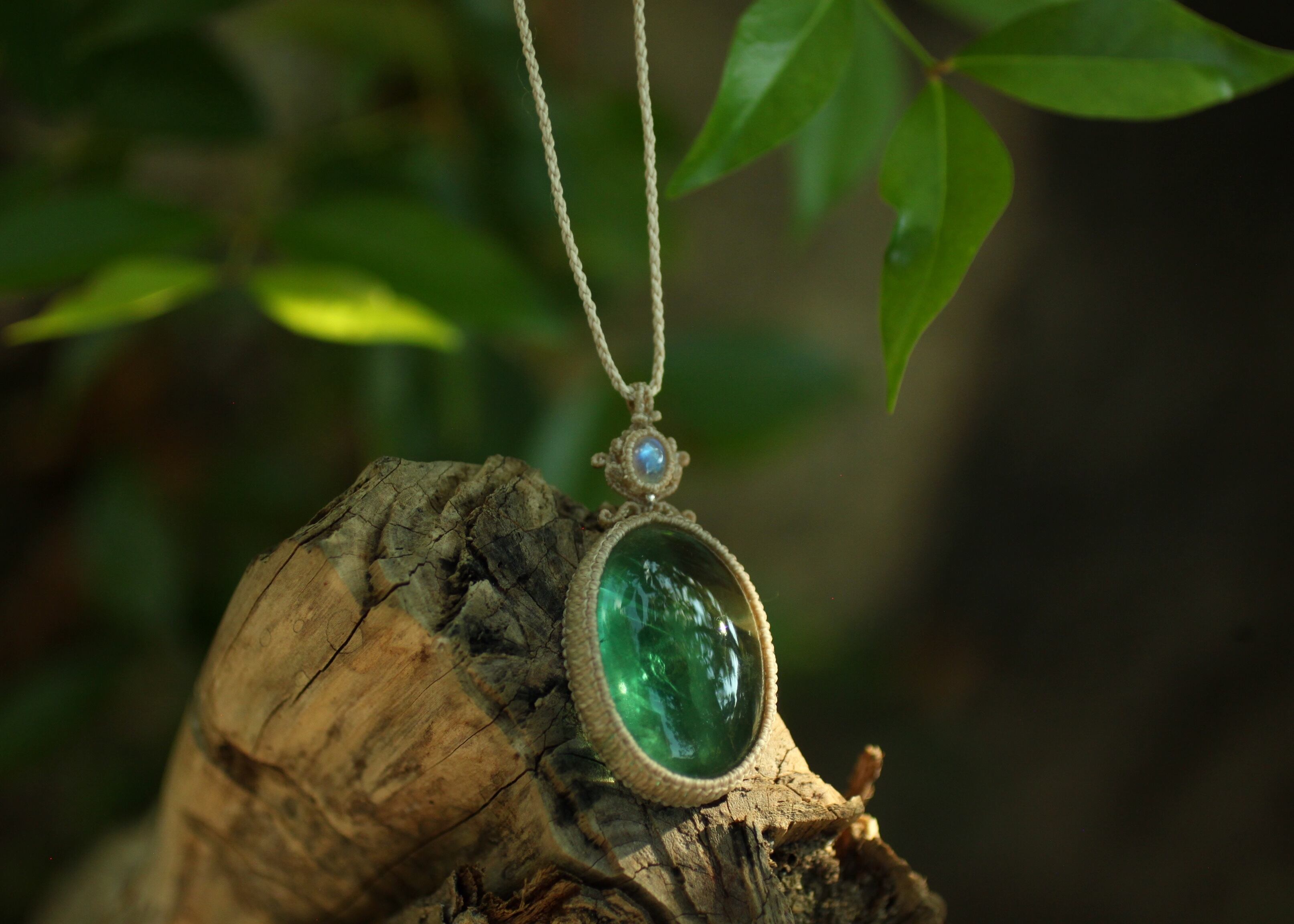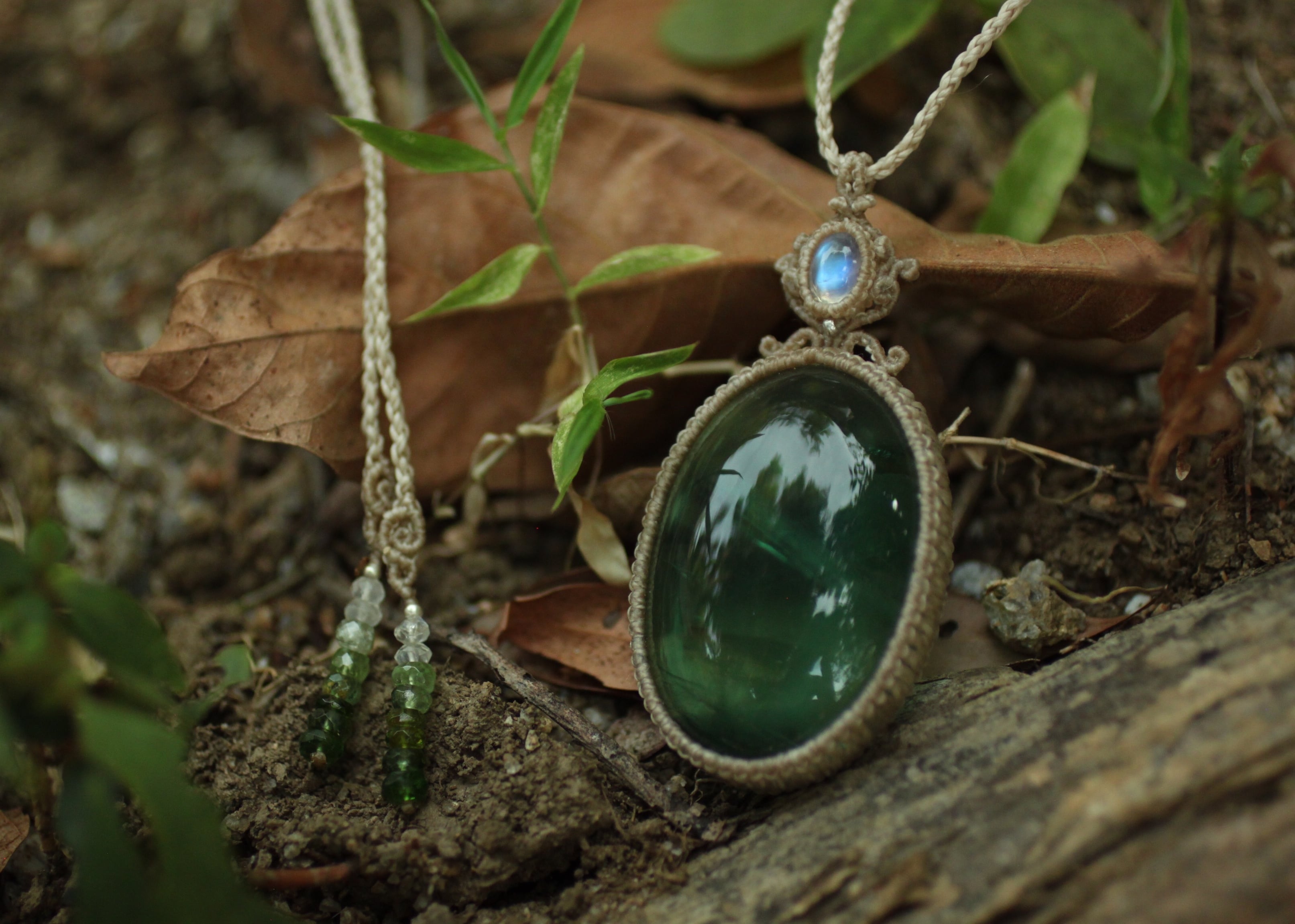※ マクラメ編み装飾は、手縫い糸ほどの細いコードを使い出来る限り天然石の表情と繊細な仕上がりを重視し時間をかけ丁寧に編みました。