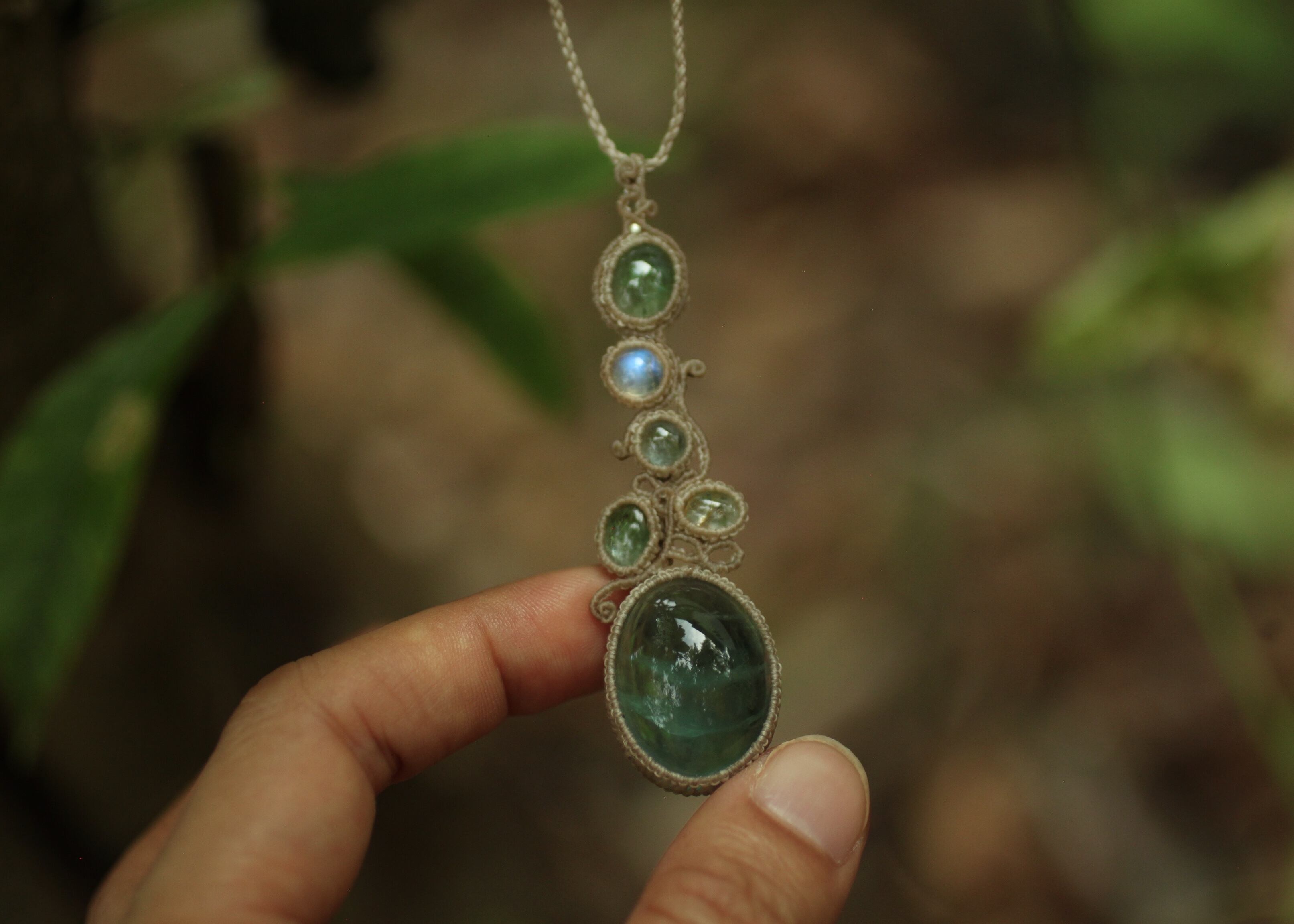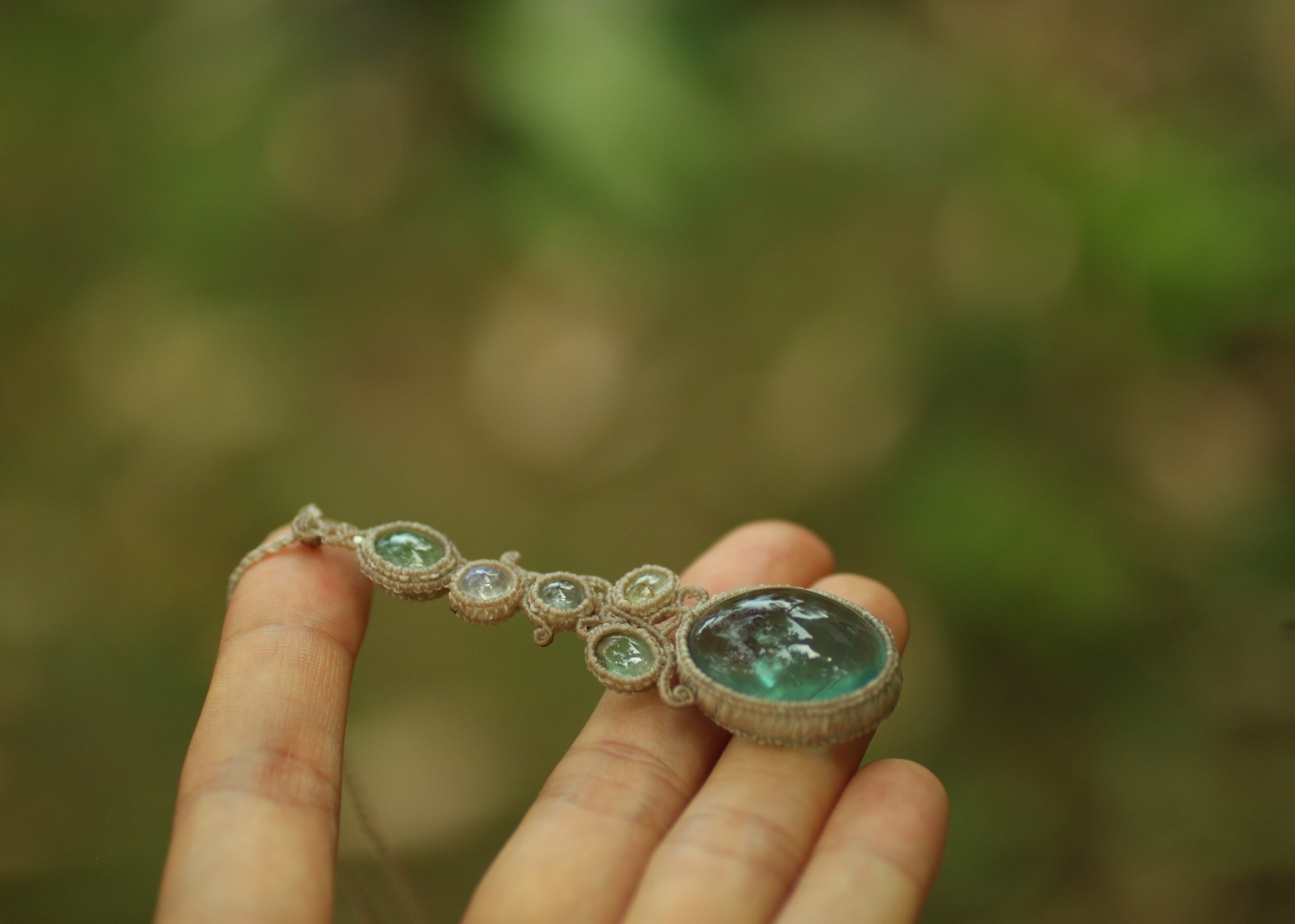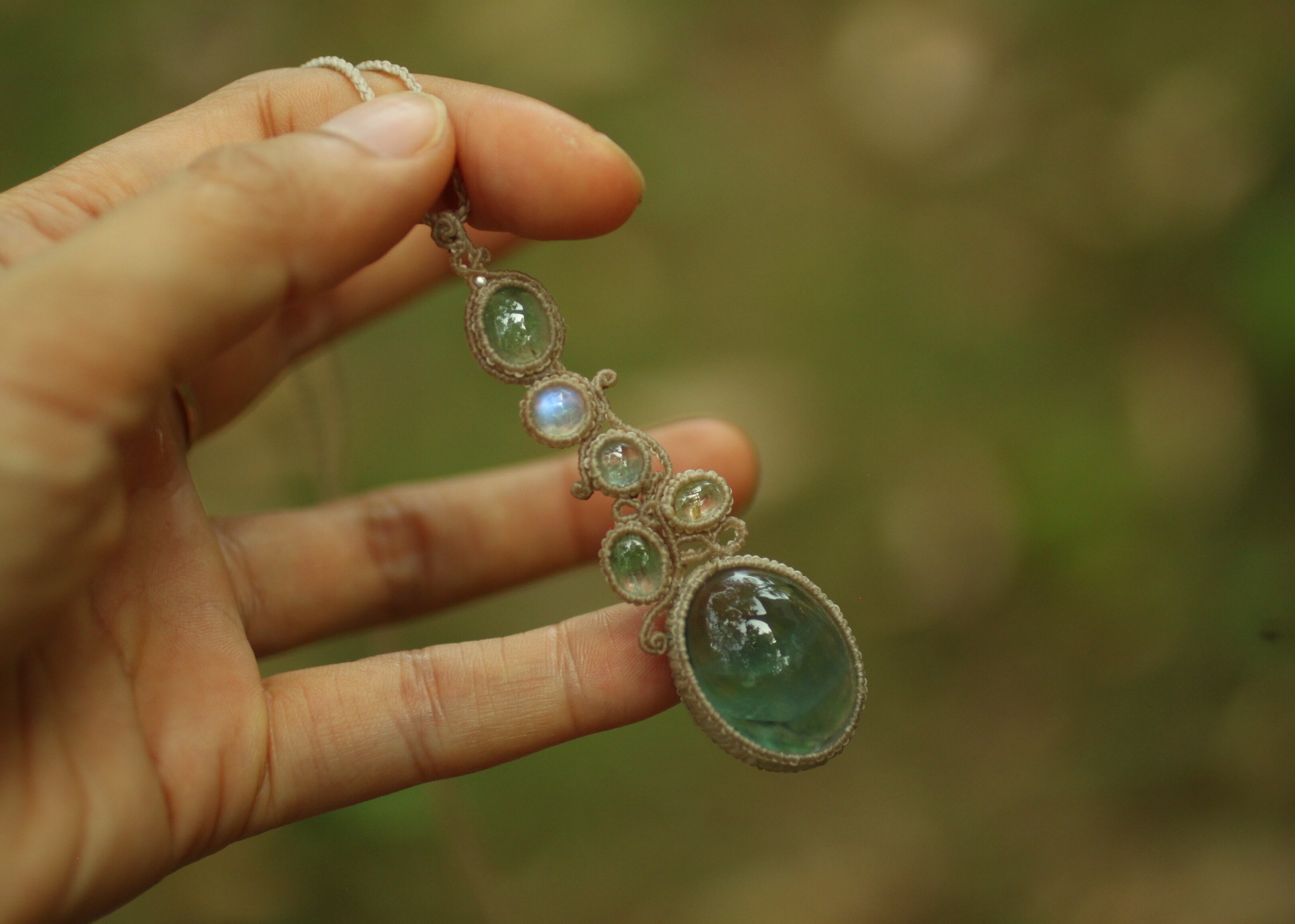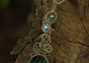 手縫い糸ほどの細いコードを使い出来る限り天然石の表情と繊細な仕上がりを重視し時間をかけ丁寧に編みました。