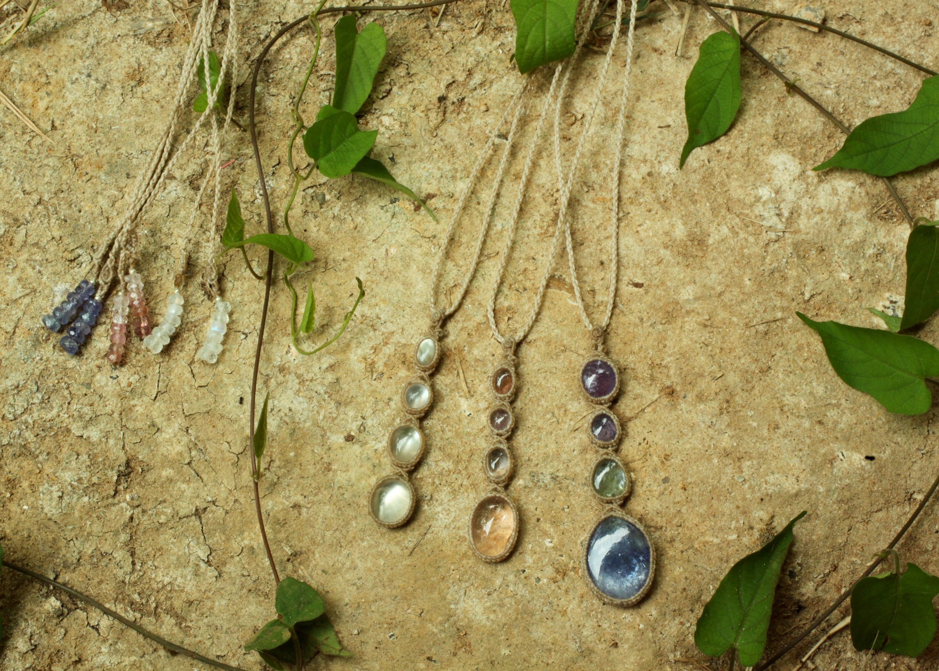 手縫い糸ほどの細いコードを使い出来る限り天然石の表情と繊細な仕上がりを重視し時間をかけ丁寧に編みました。