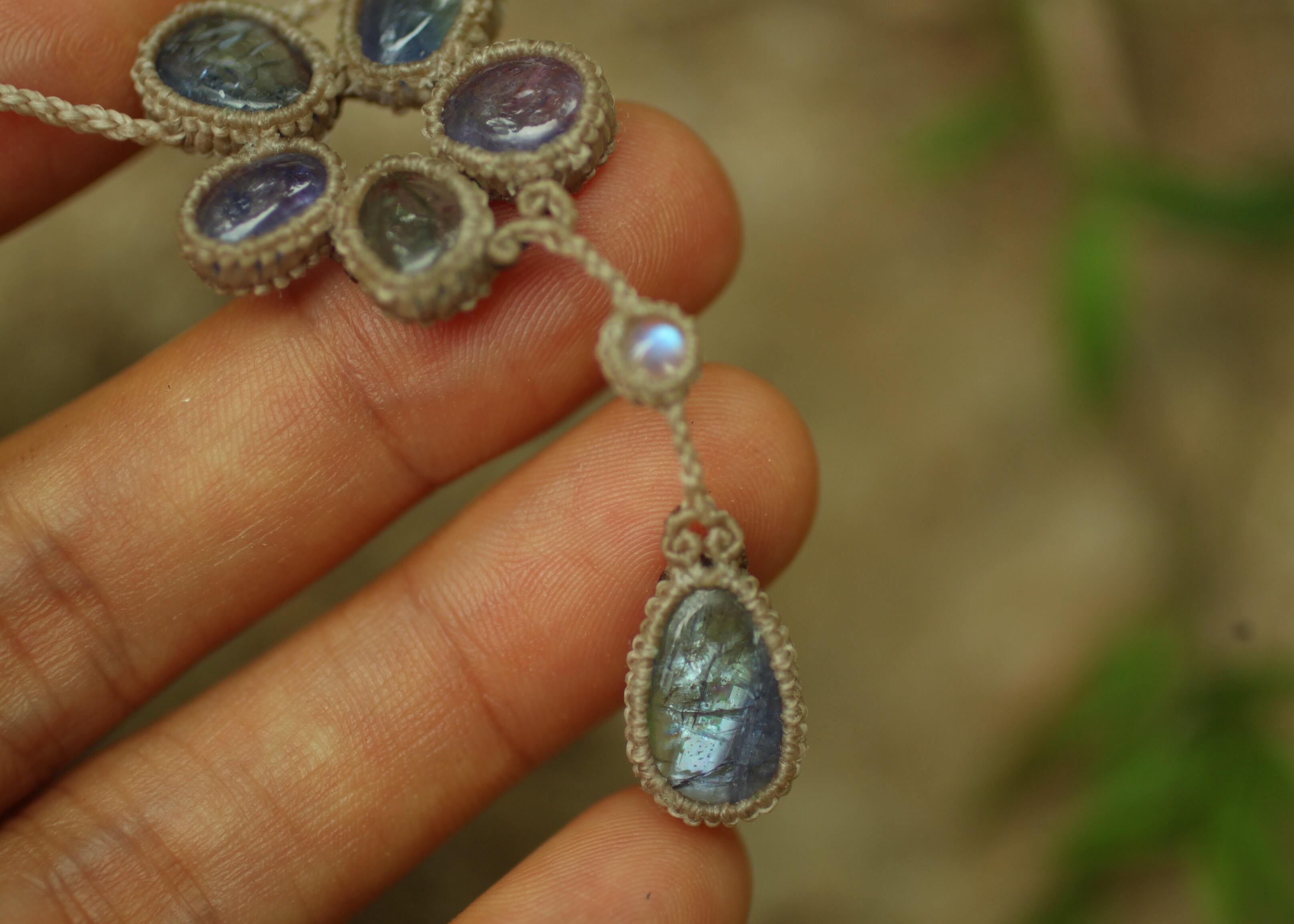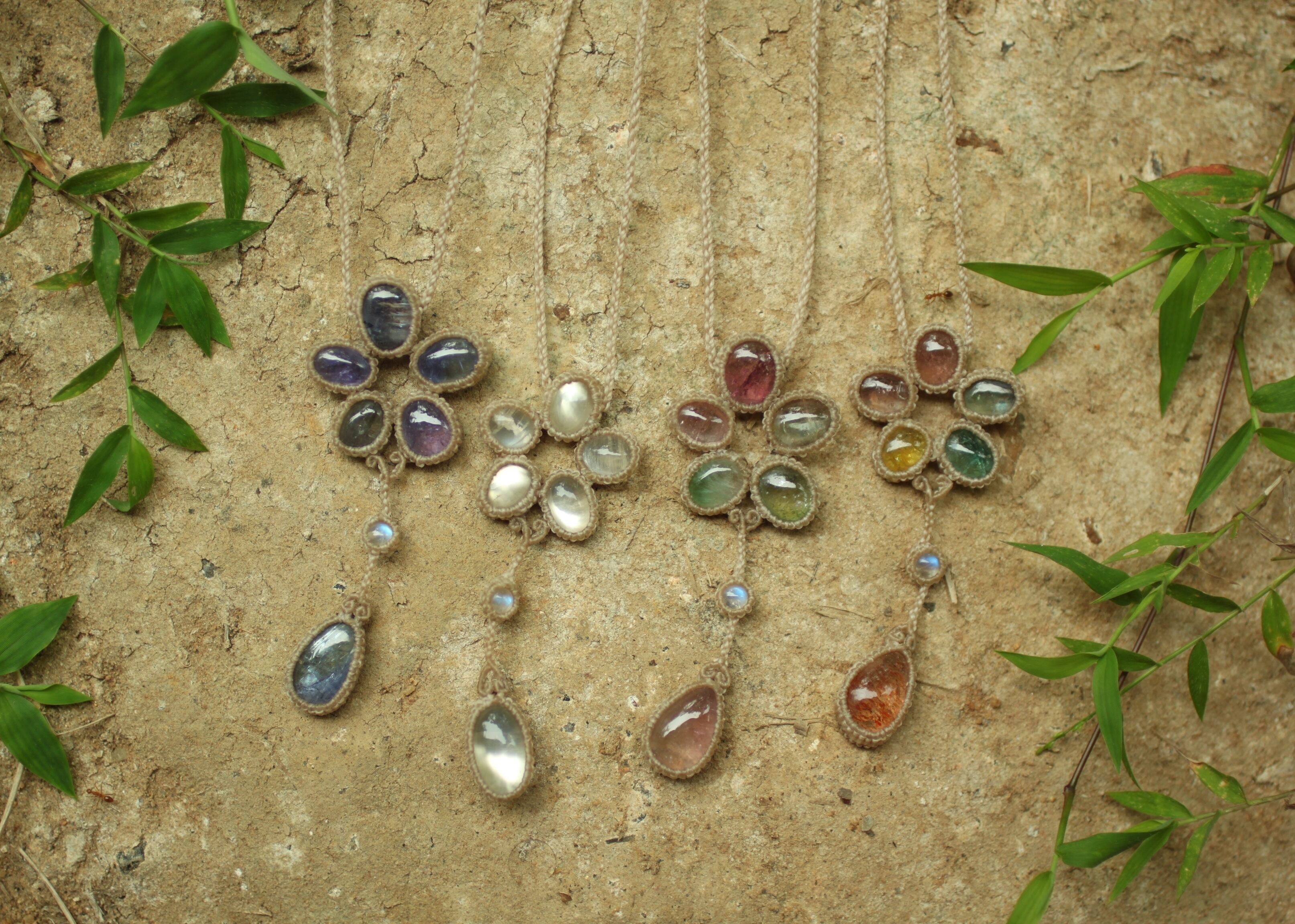 手縫い糸ほどの細いコードを使い出来る限り天然石の表情と繊細な仕上がりを重視し時間をかけ丁寧に編みました。