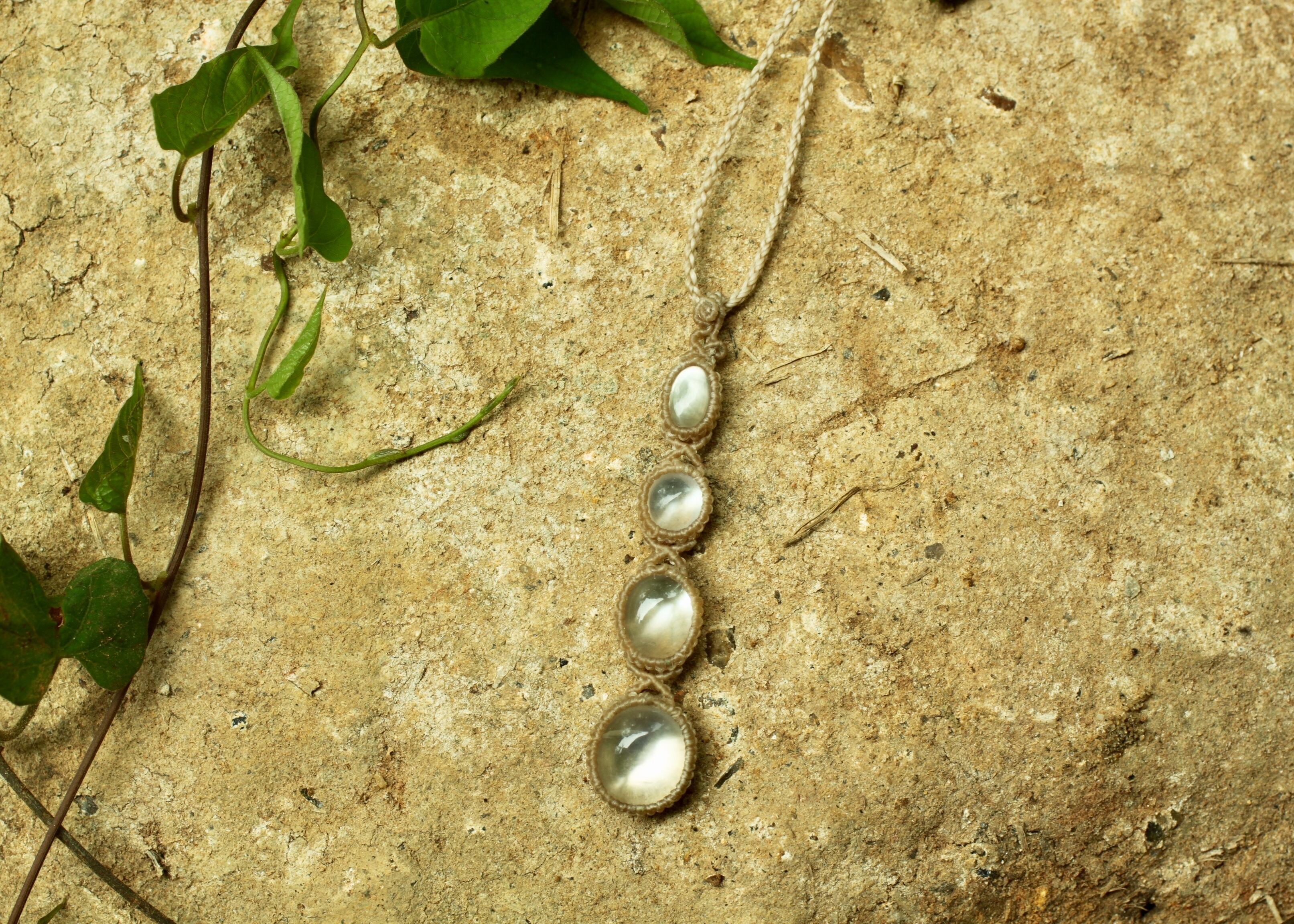 高い透明度に強い反射を見せ、コントラストが美しい小さなスリランカ産ムーンストーンをあしらった4連ペンダント