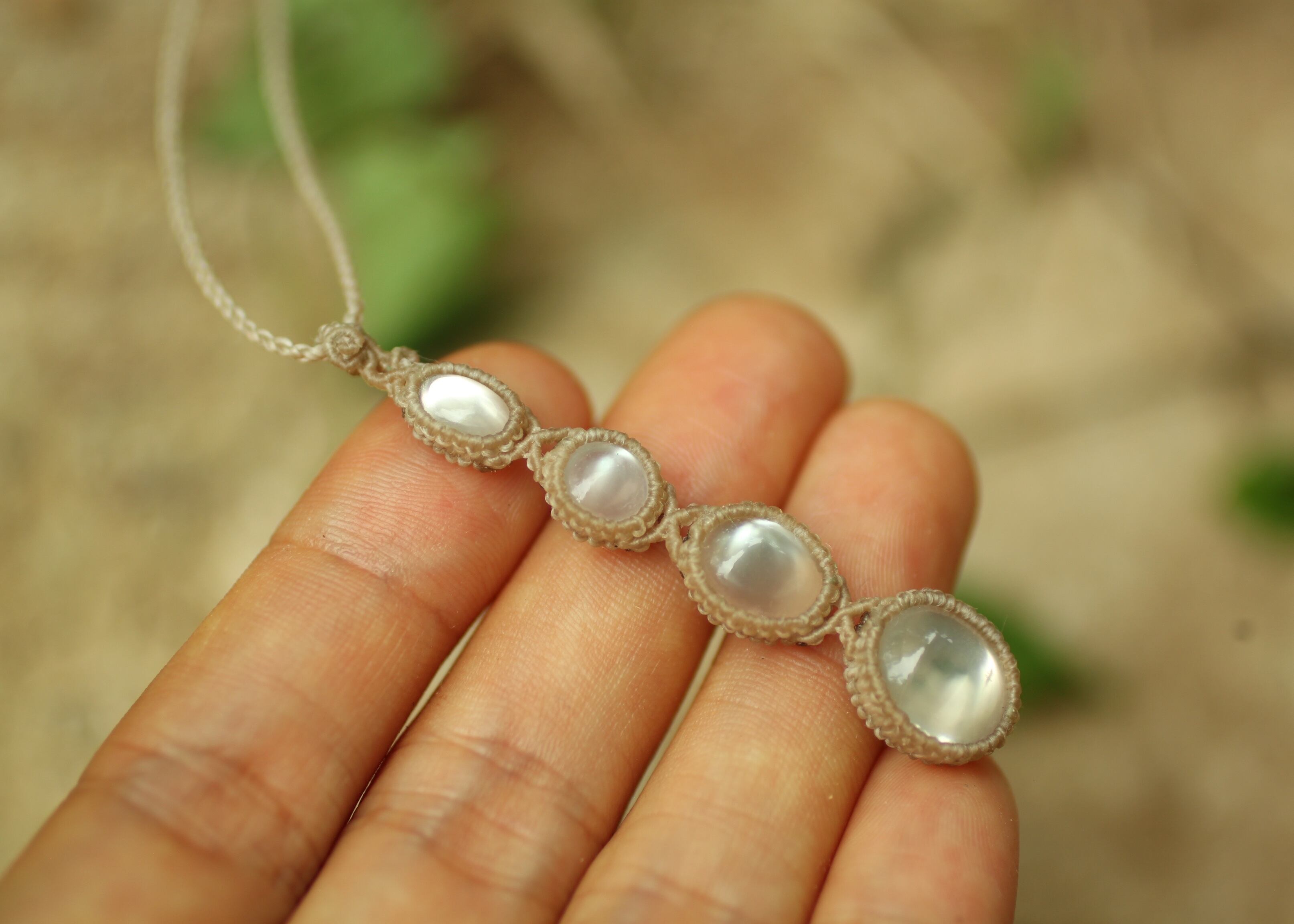 手縫い糸ほどの細いコードを使い出来る限り天然石の表情と繊細な仕上がりを重視し時間をかけ丁寧に編みました。