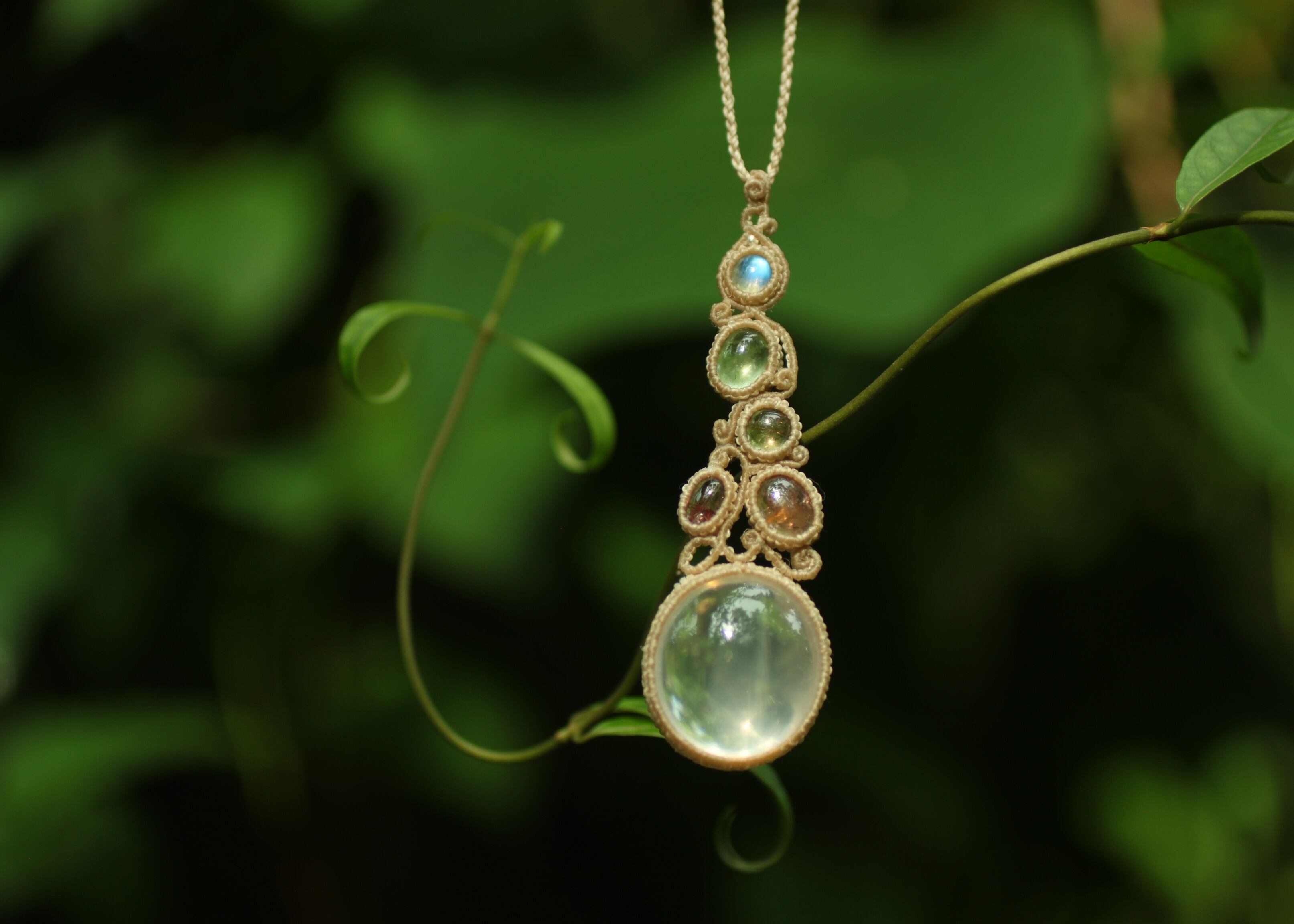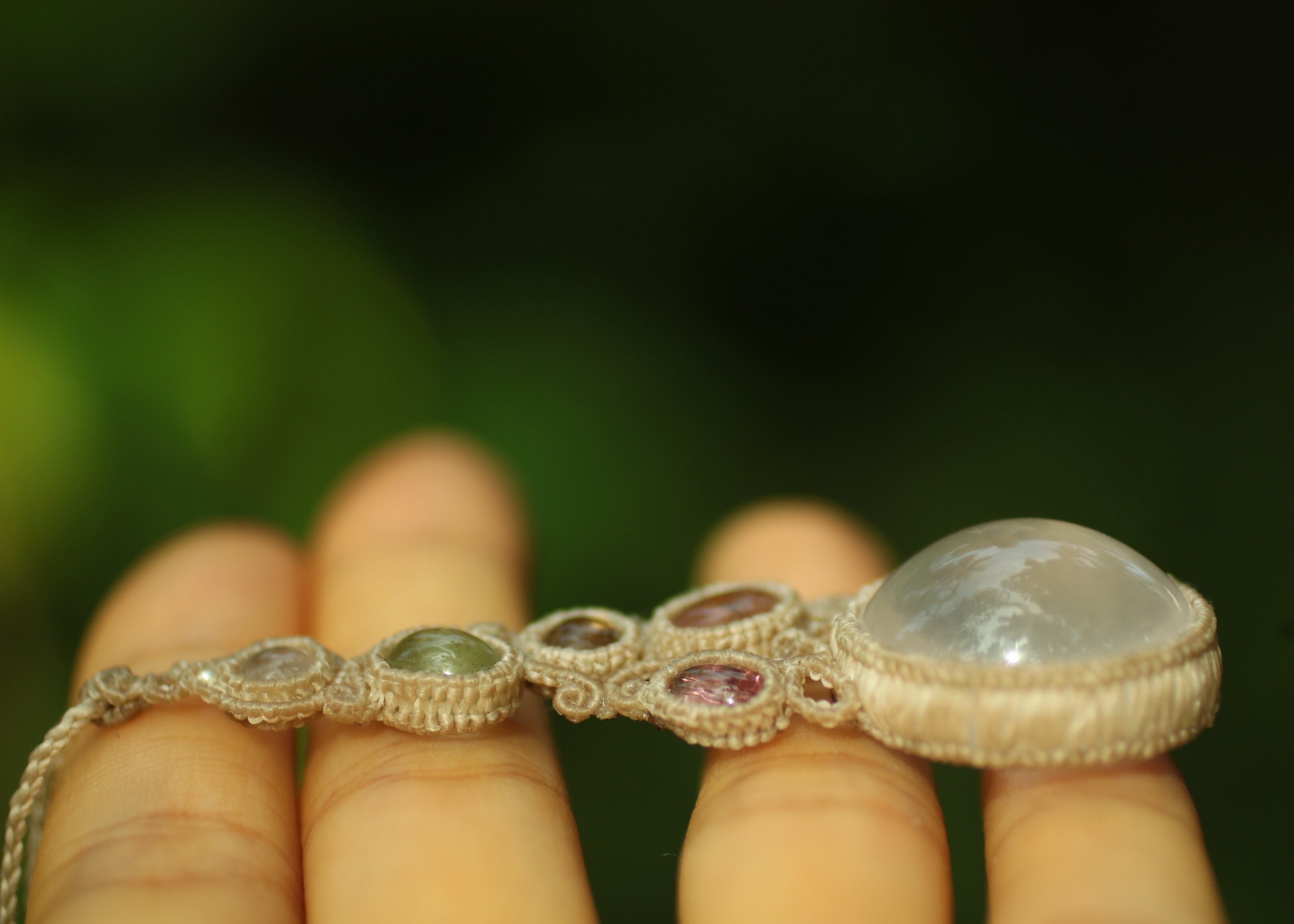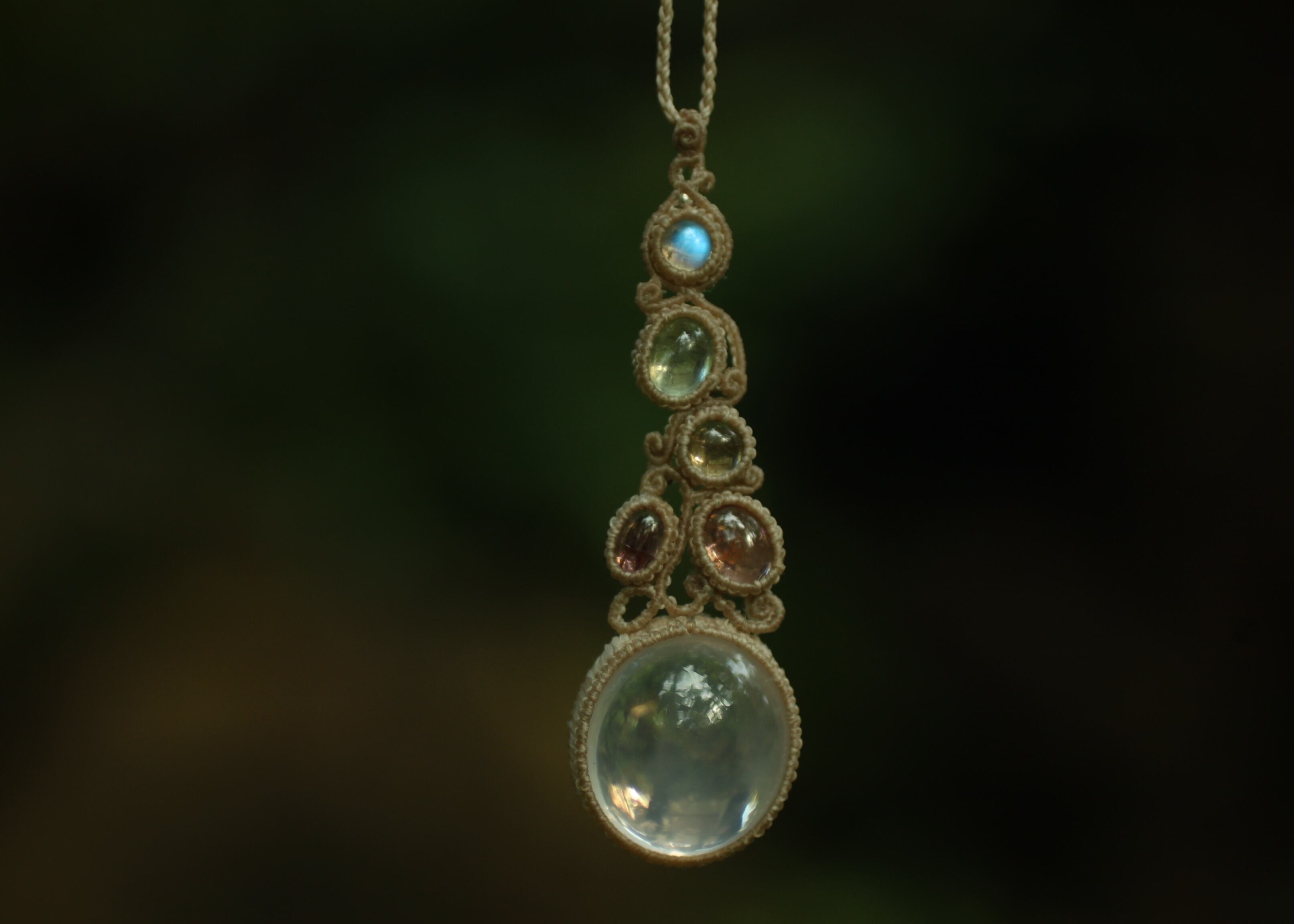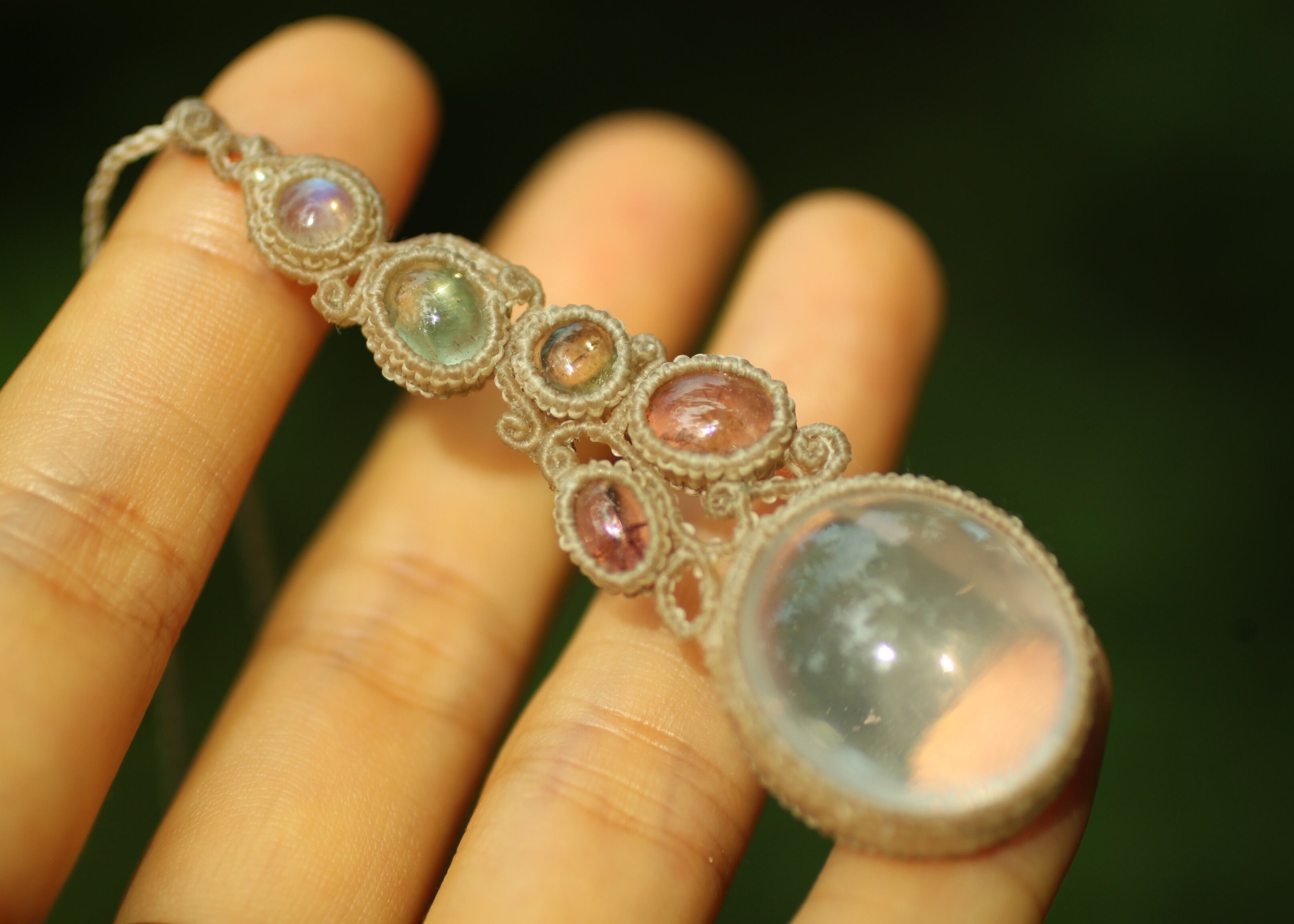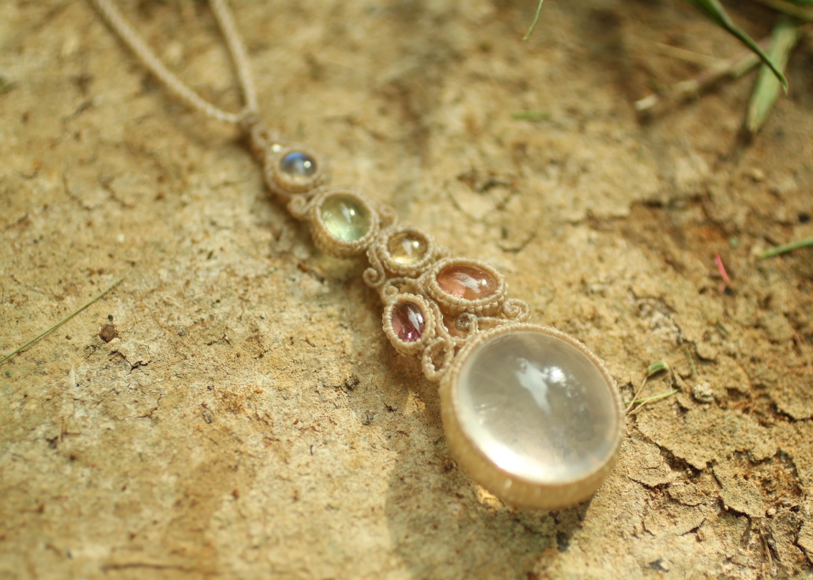手縫い糸ほどの細いコードを使い出来る限り天然石の表情と繊細な仕上がりを重視し時間をかけ丁寧に編みました。
