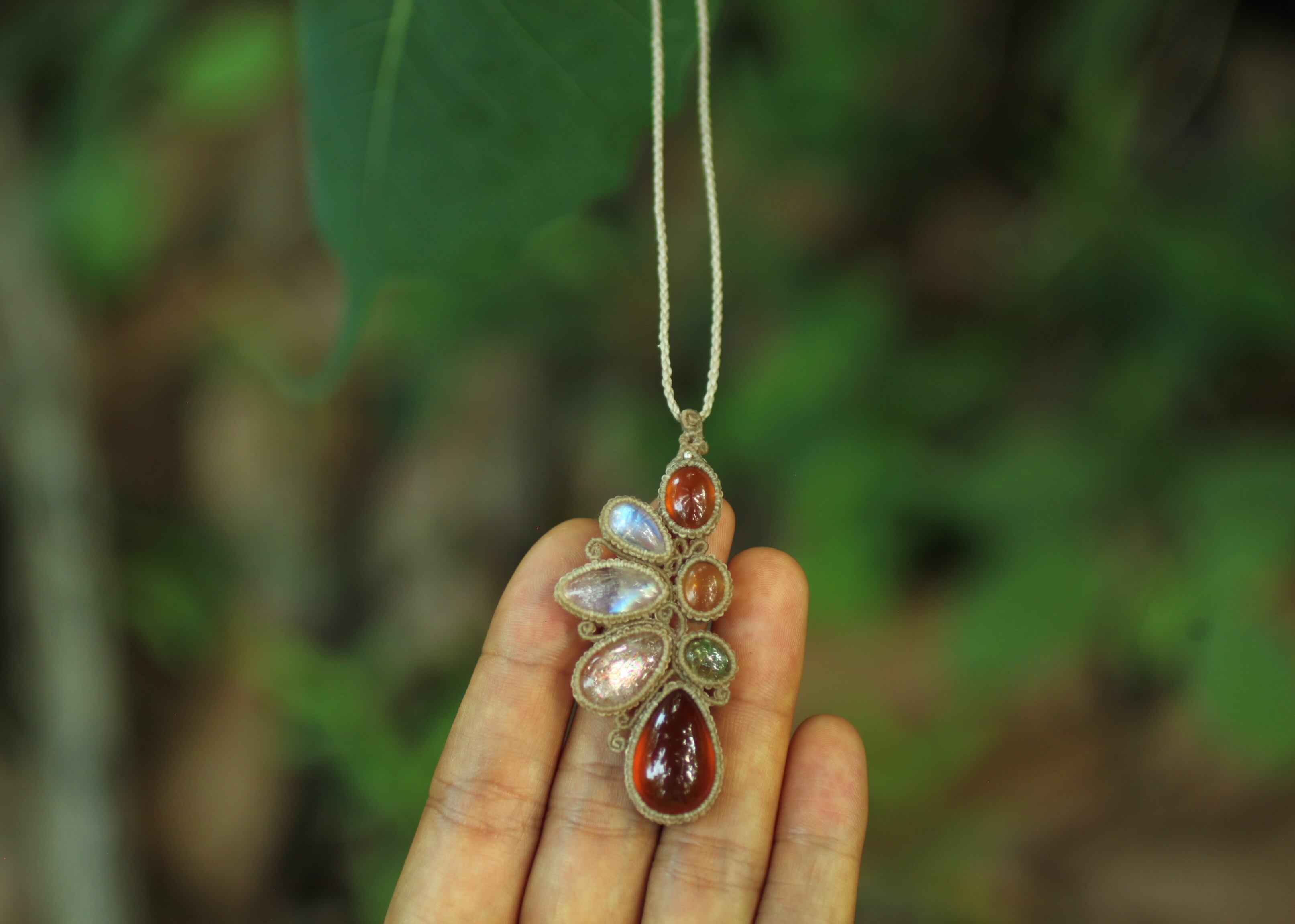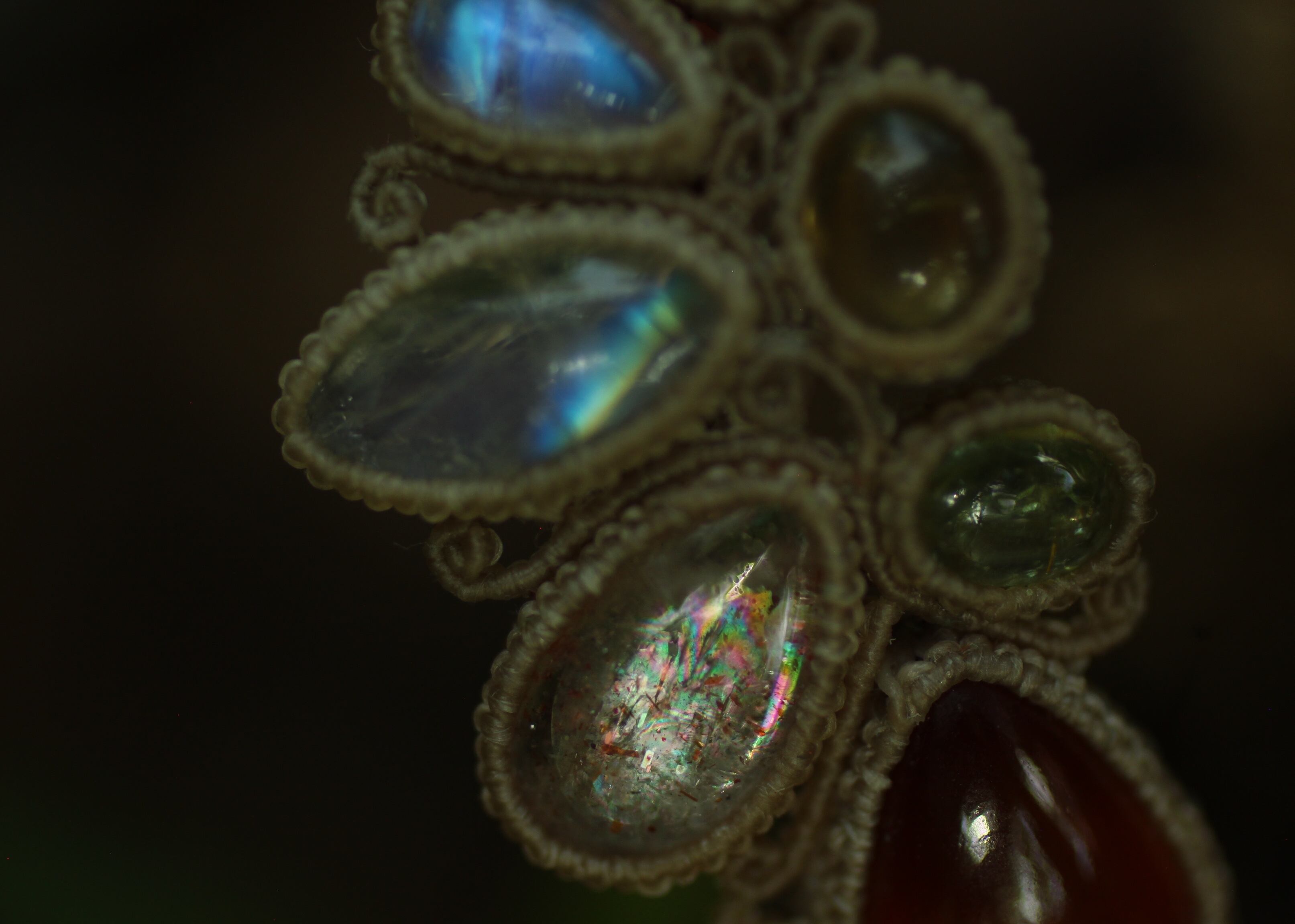 手縫い糸ほどの細いコードを使い出来る限り天然石の表情と繊細な仕上がりを重視し時間をかけ丁寧に編みました。
