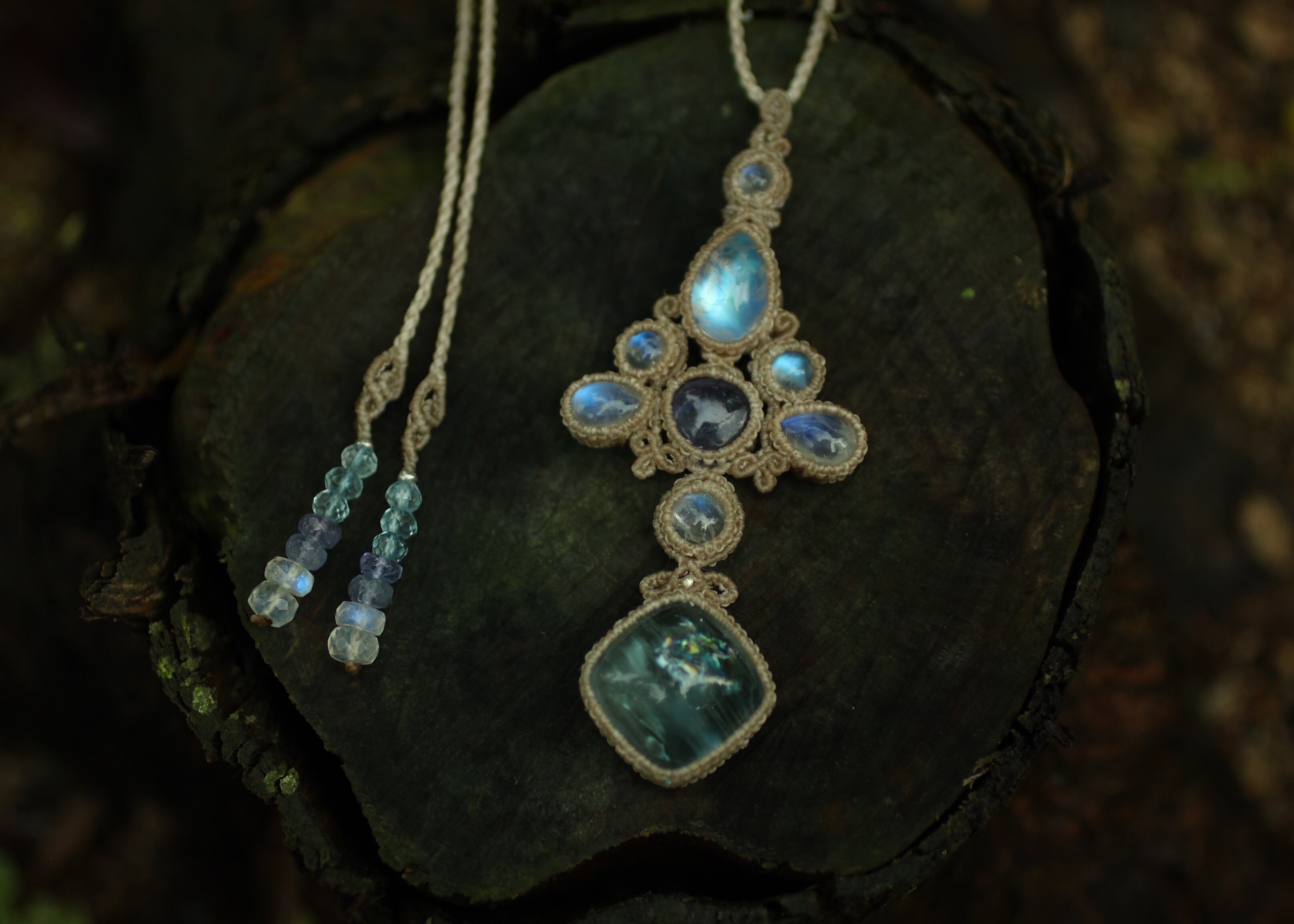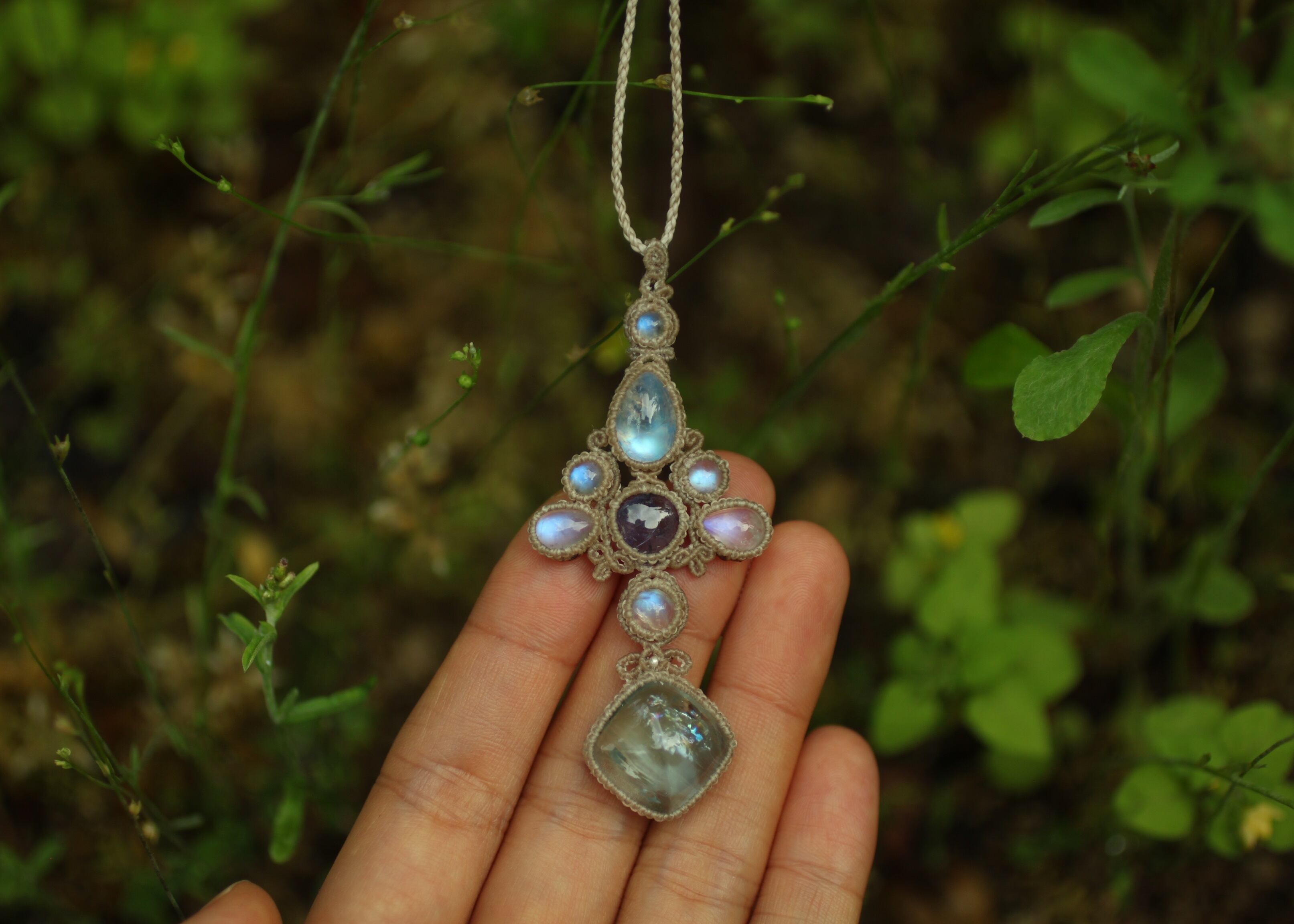 手縫い糸ほどの細いコードを使い出来る限り天然石の表情と繊細な仕上がりを重視し時間をかけ丁寧に編みました。