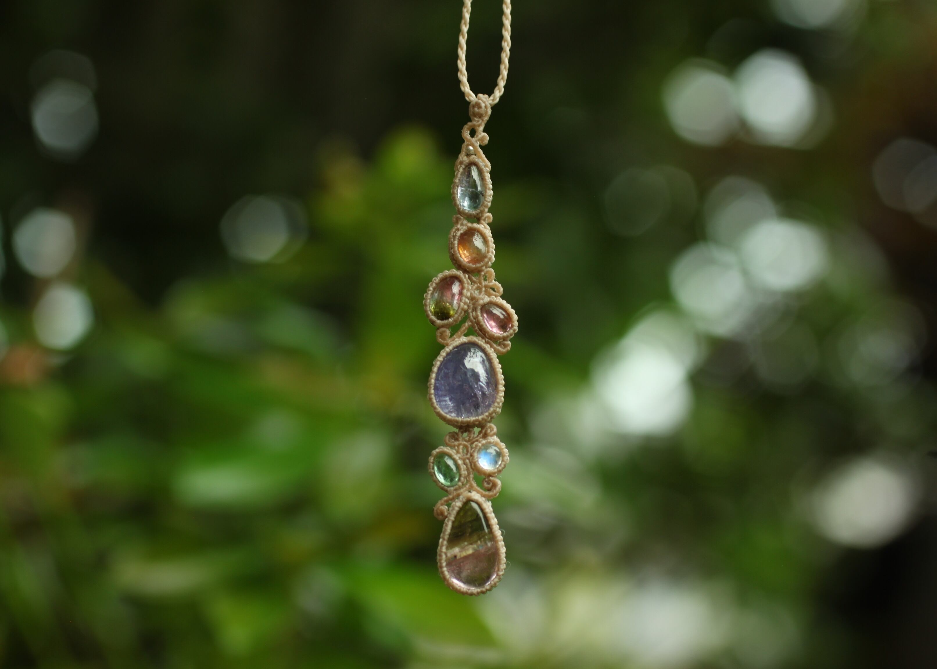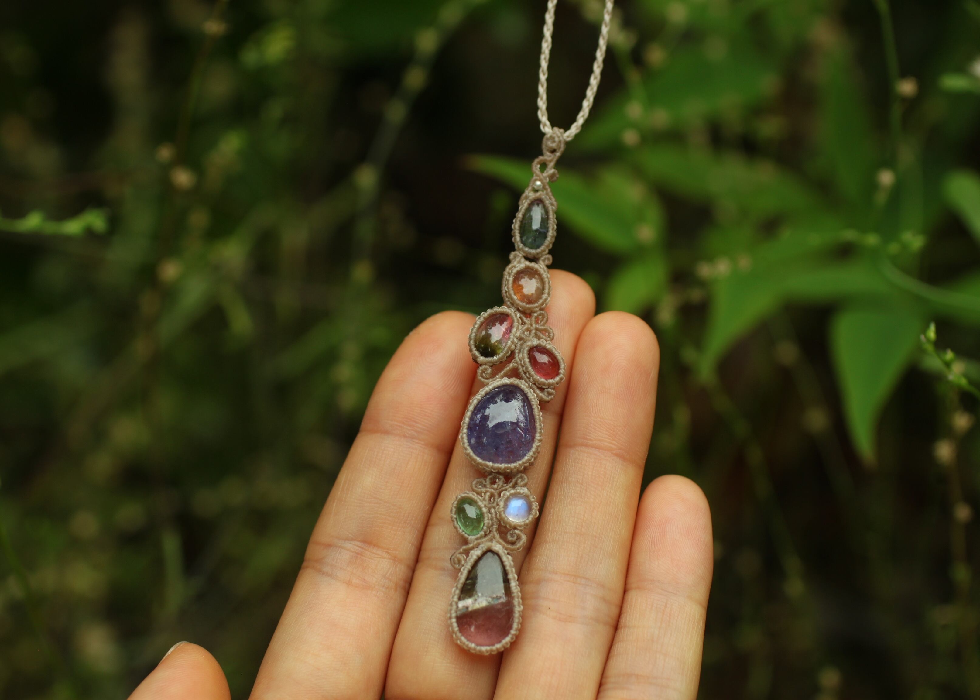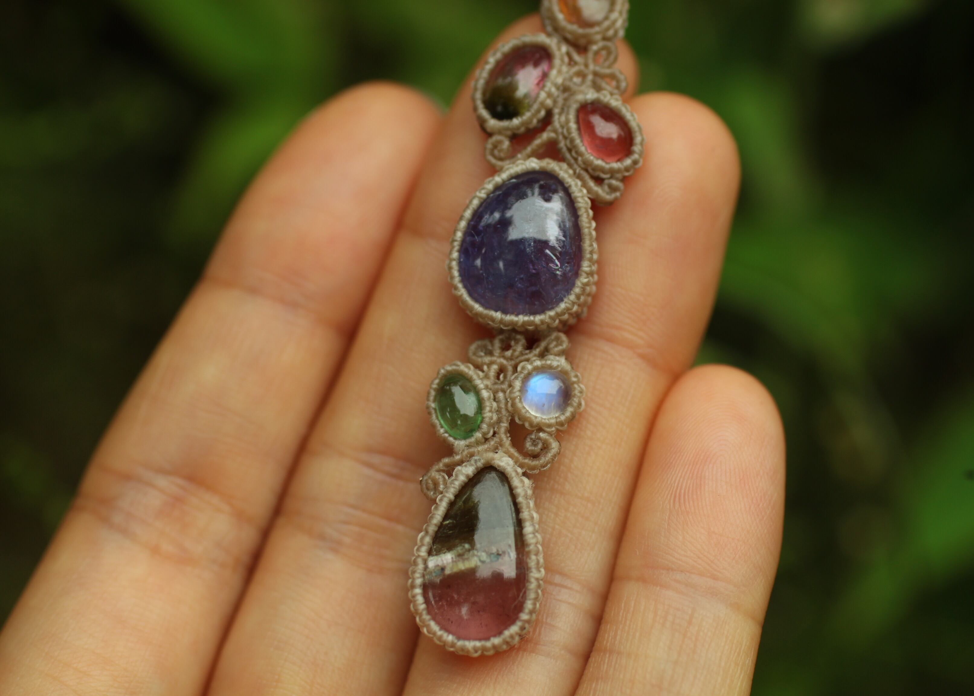 手縫い糸ほどの細いコードを使い出来る限り天然石の表情と繊細な仕上がりを重視し時間をかけ丁寧に編みました。
