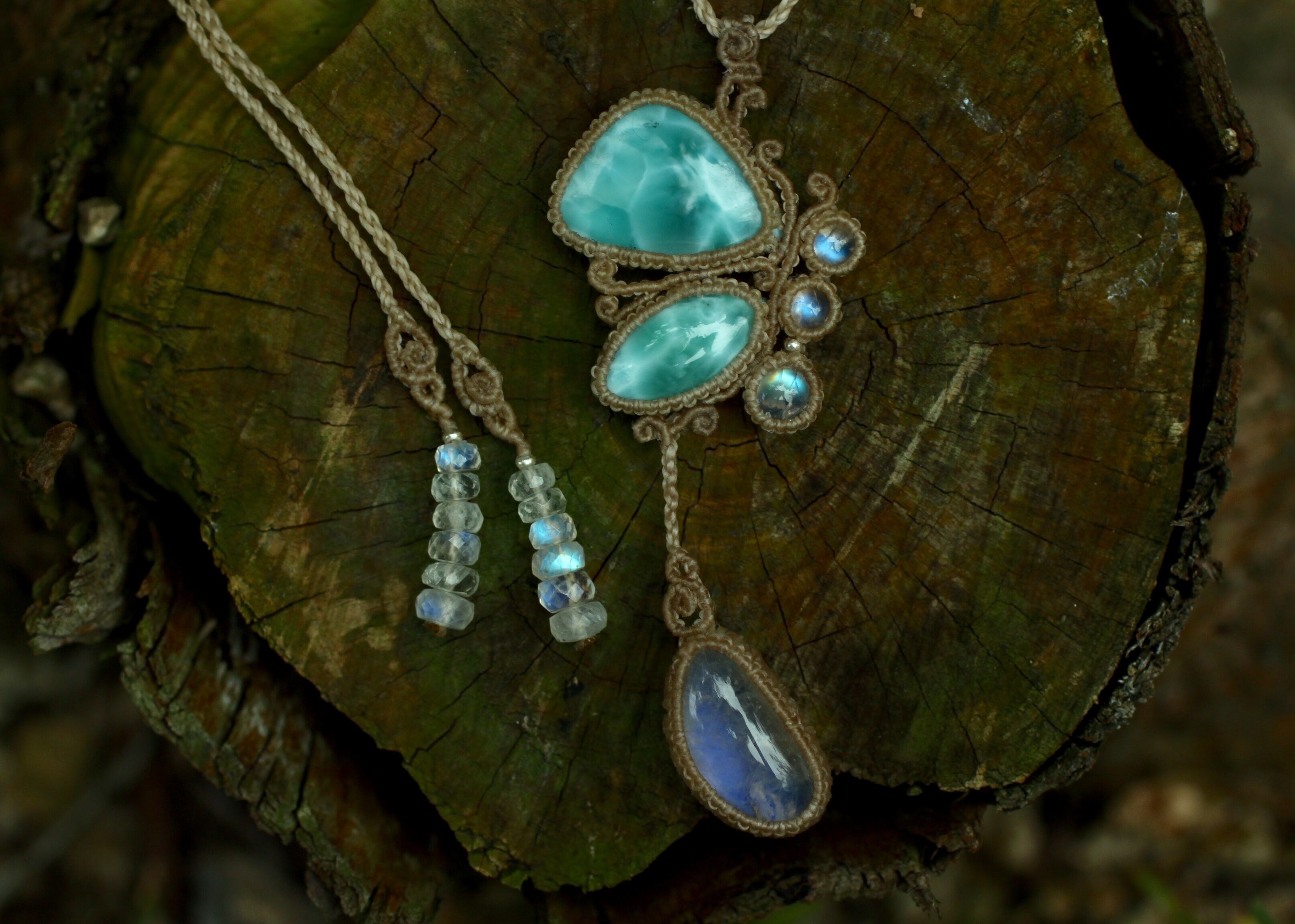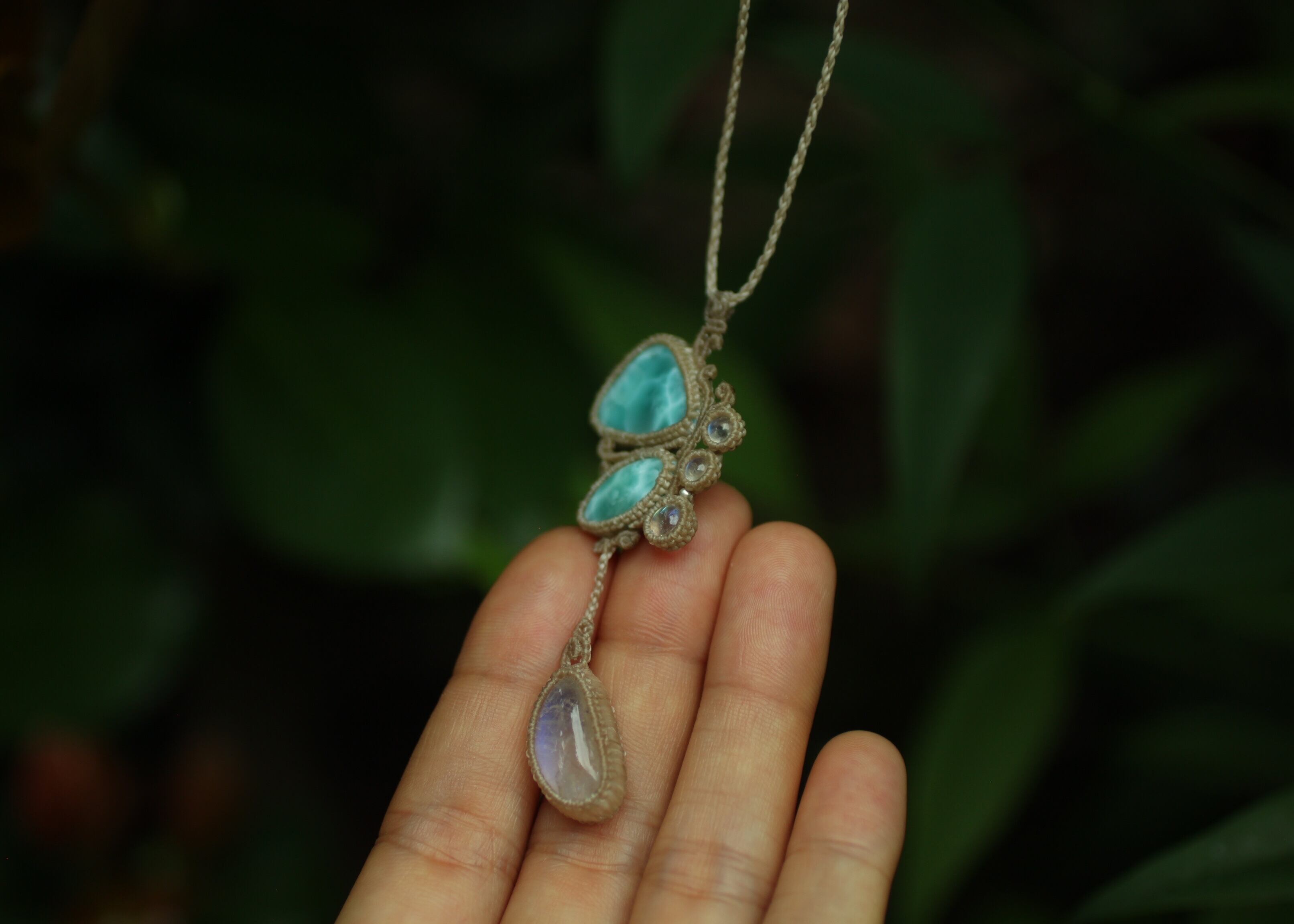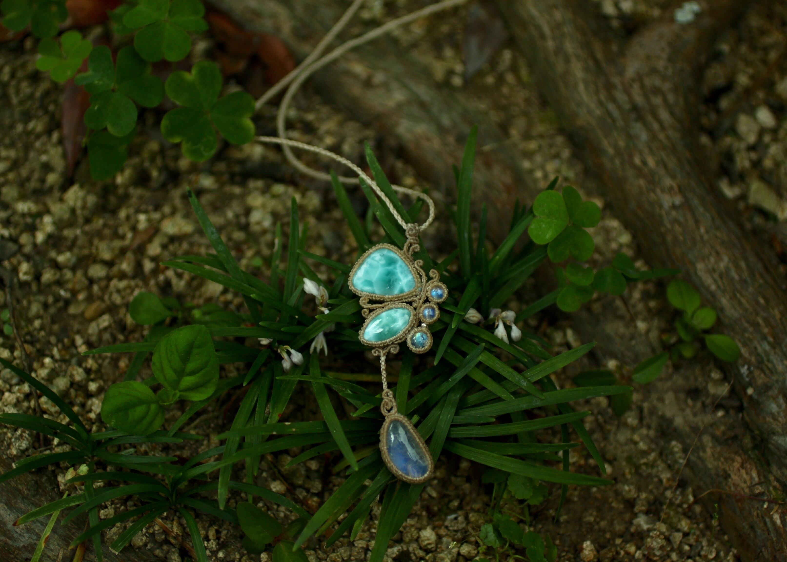 手縫い糸ほどの細いコードを使い出来る限り天然石の表情と繊細な仕上がりを重視し時間をかけ丁寧に編みました。
