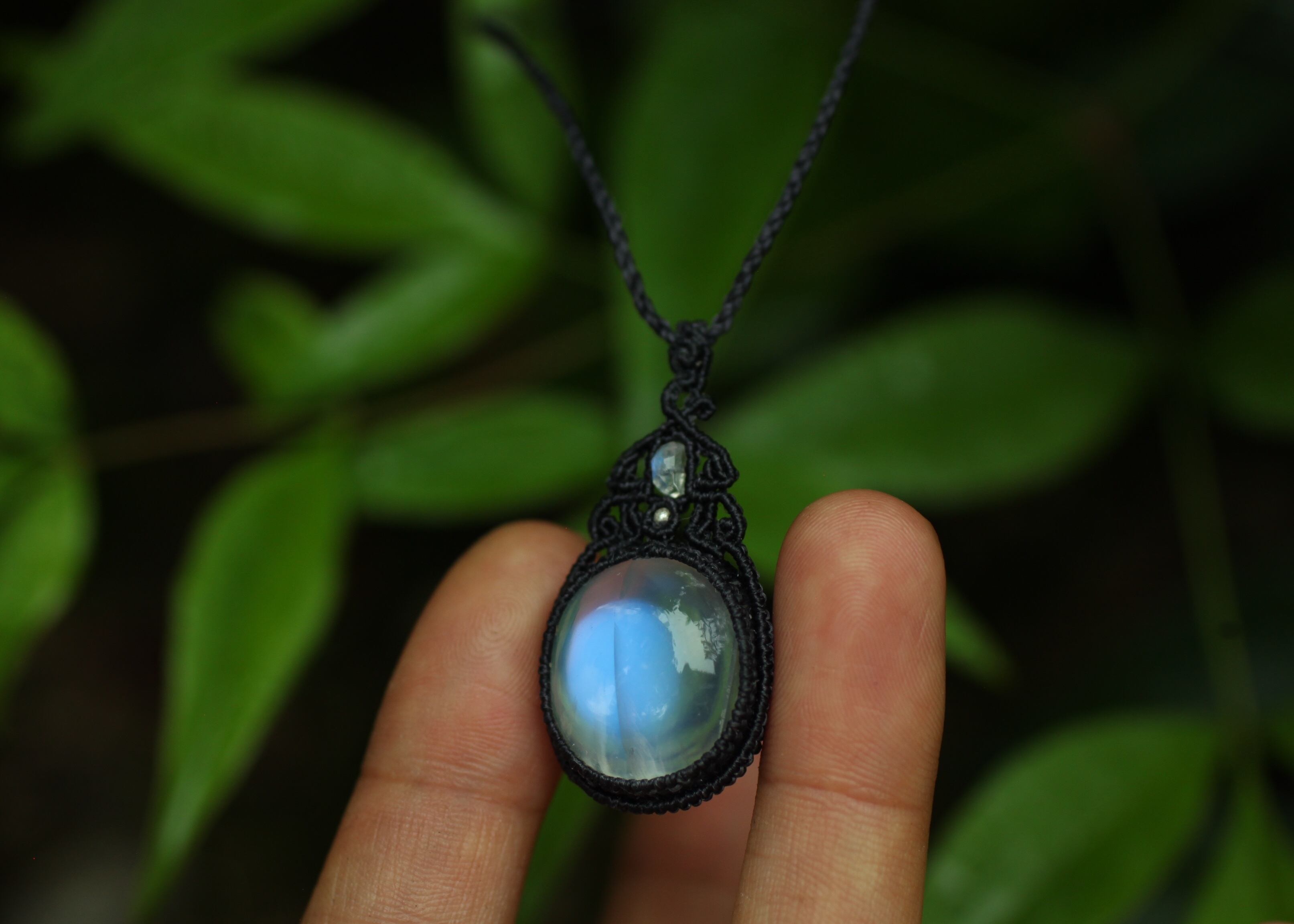 手縫い糸ほどの細いコードを使い出来る限り天然石の表情と繊細な仕上がりを重視し時間をかけ丁寧に編みました。