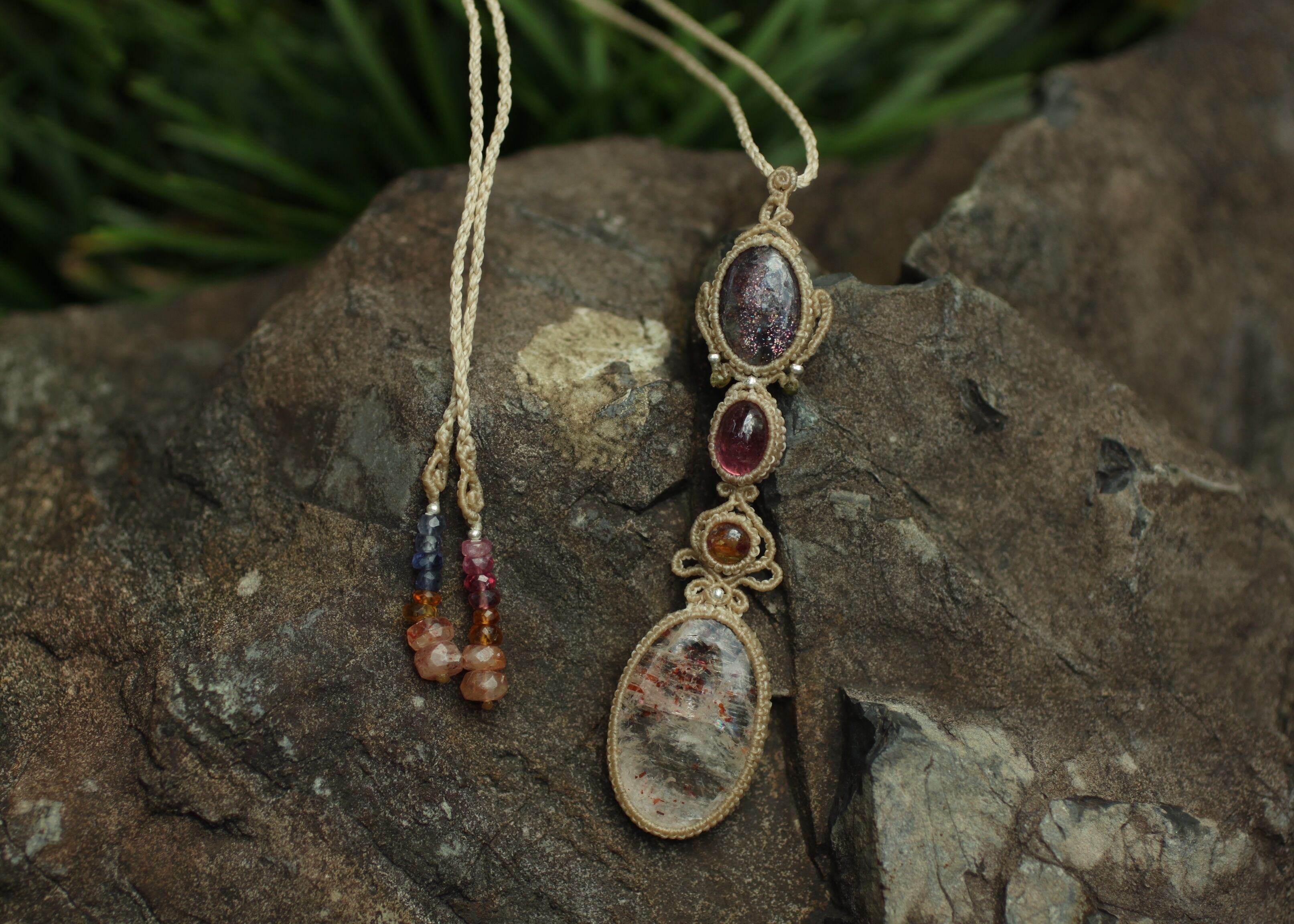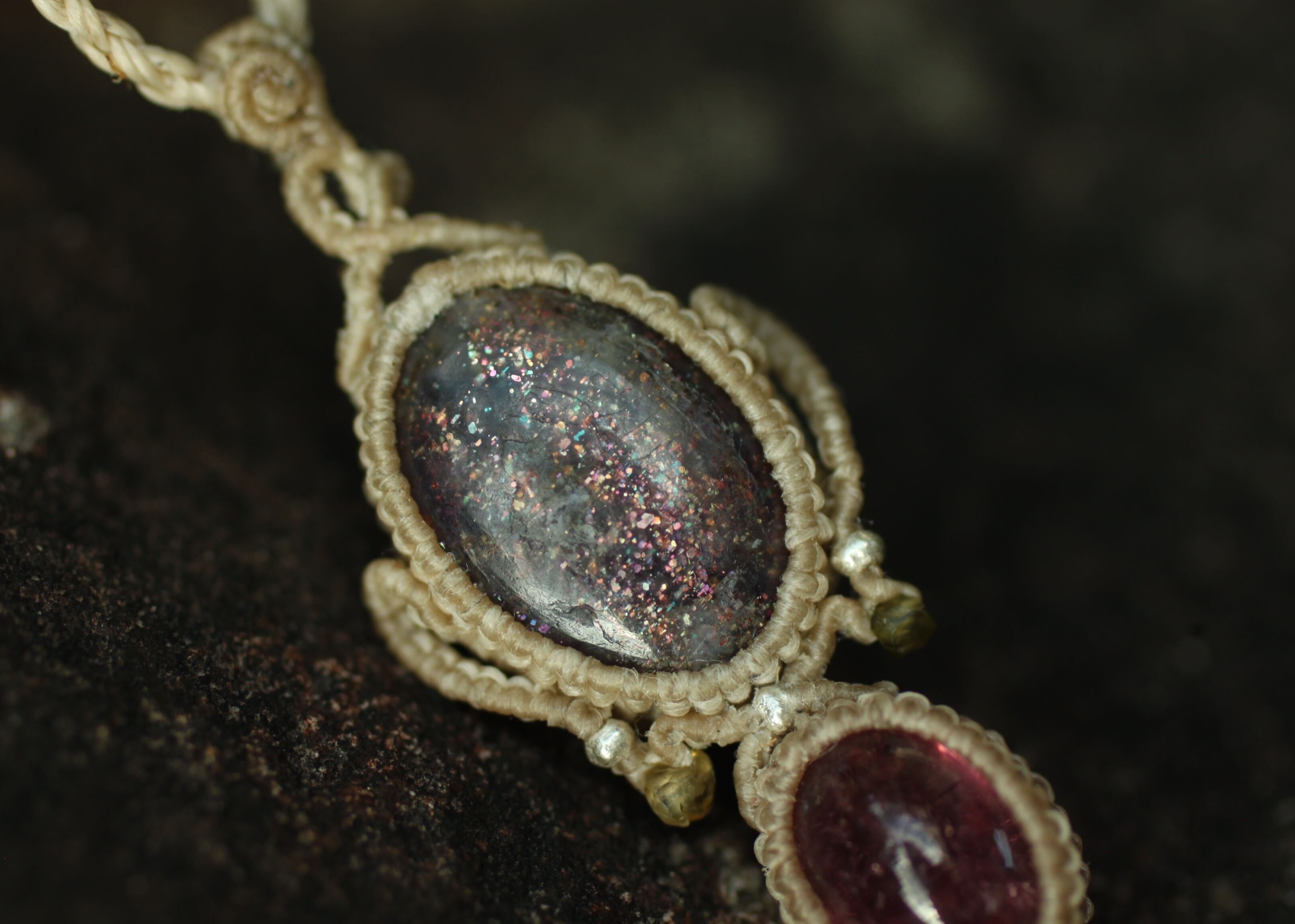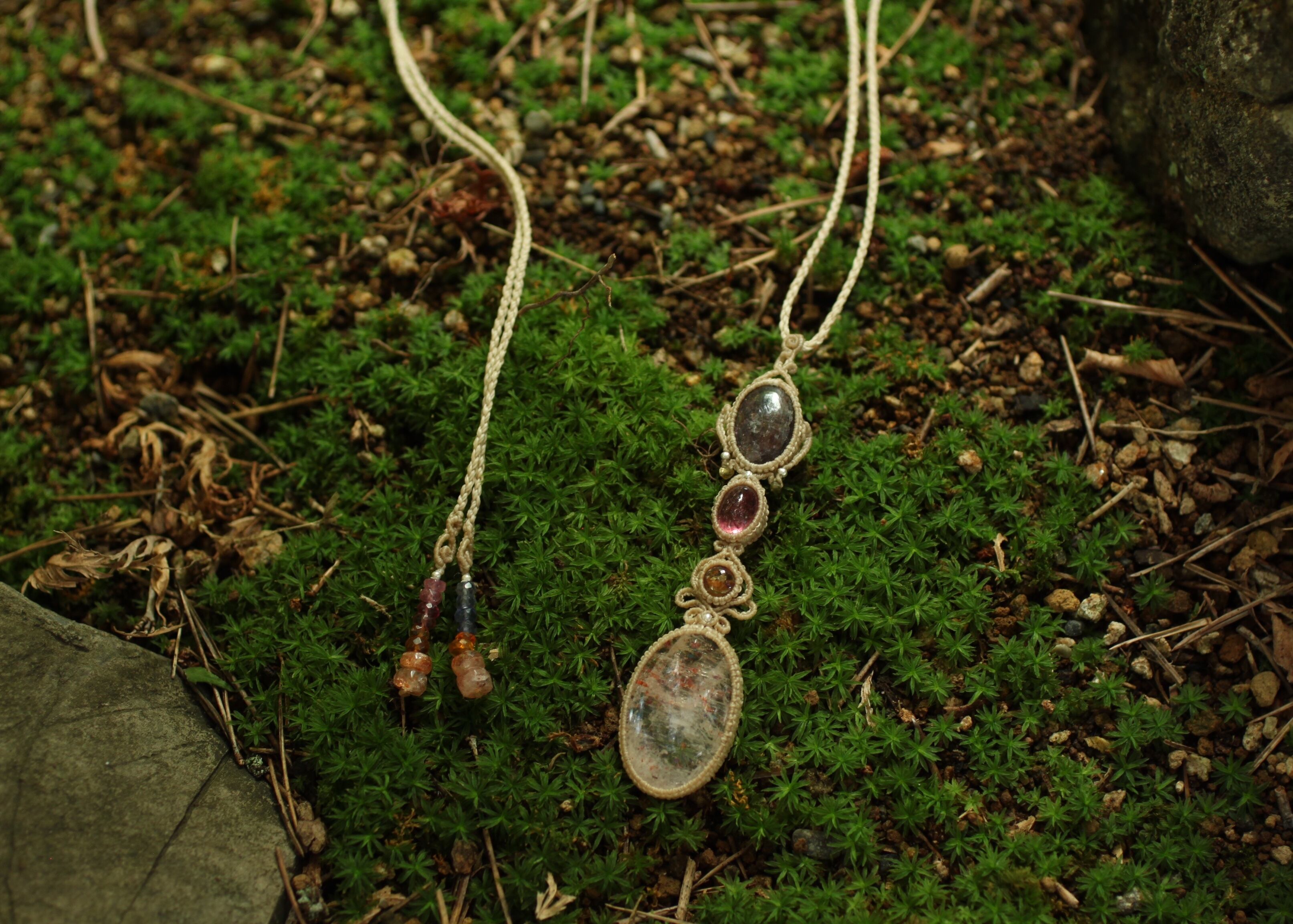 ※ 天然石を包むコードを始めトップ部分に使用したマクラメ編みコードは、